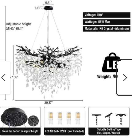 The chandelier requires G9 bulbs (not included) and is compatible with AC 110V power supply. For optimal ambiance, warm white bulbs are recommended. When paired with dimmable bulbs and a compatible dimmer switch (not included), the light output can be smoothly adjusted to suit different moods and occasions.