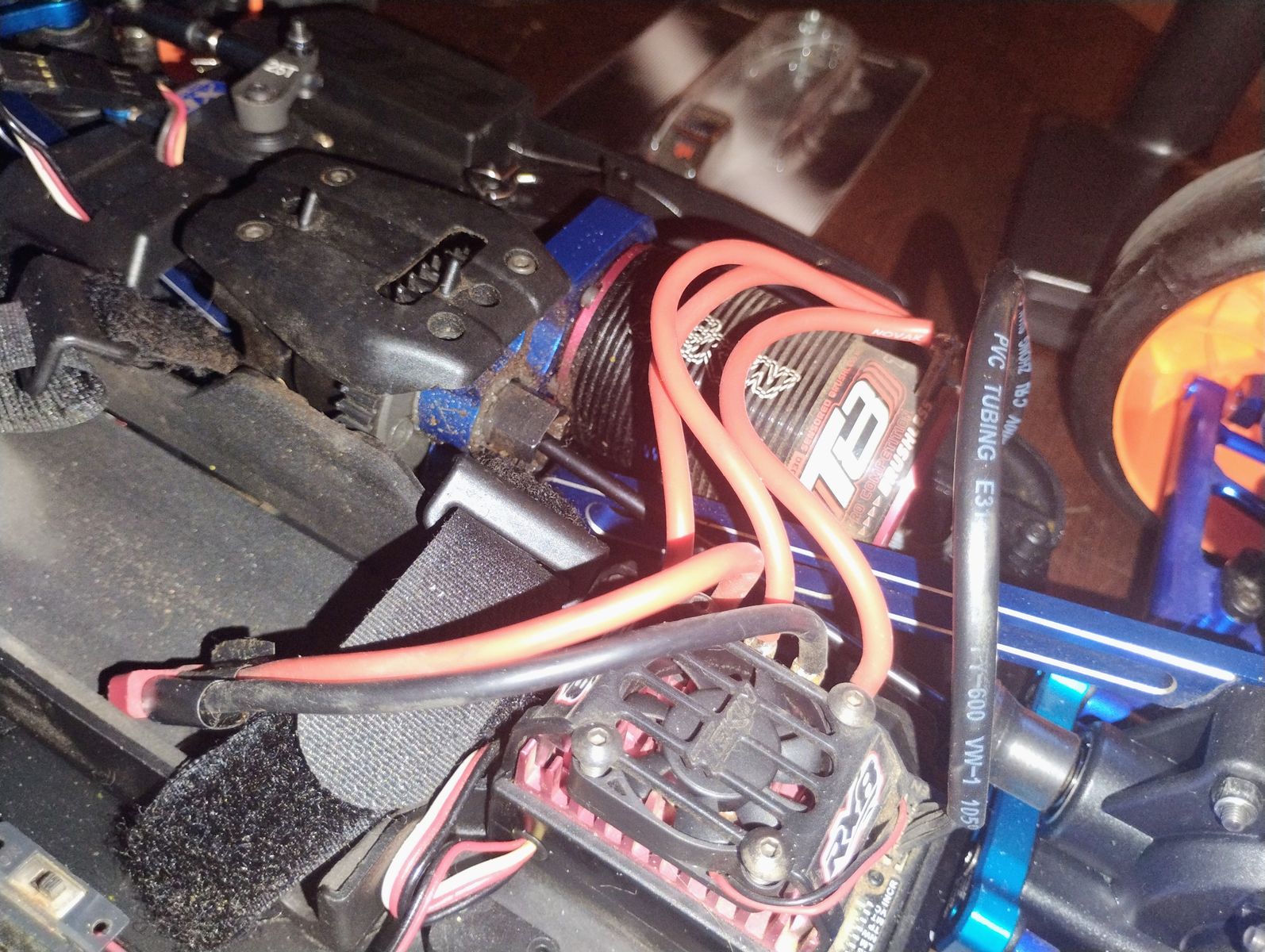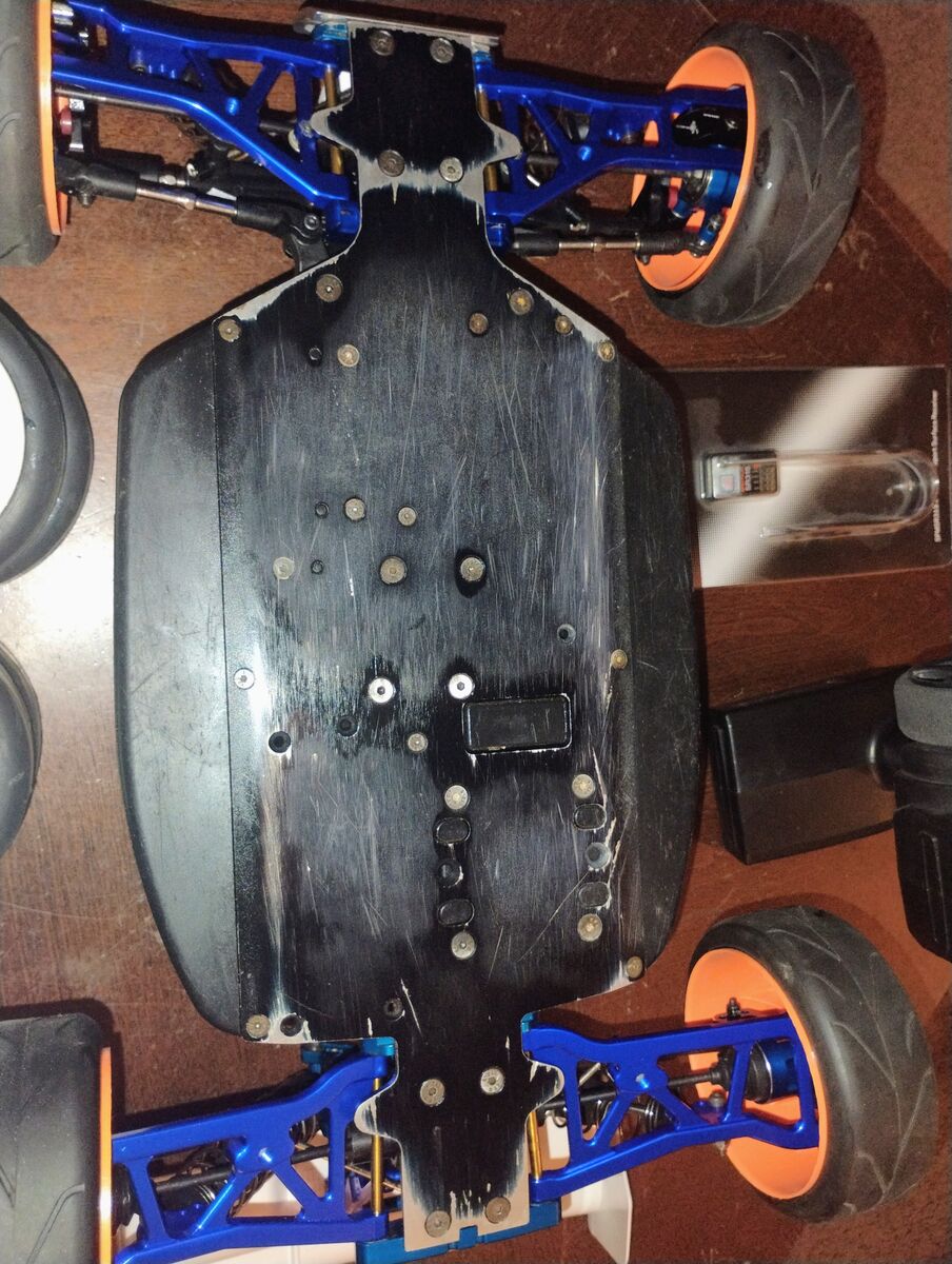 There is some very light (smooth scuffing) on chassis bottom. This buggy has a very nice TEKIN sensored ESC Motor system. The electronics are great with 4s Lipo however, with this body you will want to use the low profile soft pack rather than the hard pack for a better fit to avoid damage to the body. Buggy is RTR when you add your own battery and charger.There is a radio in buggy but, I am including a new Spektrum Radio. I am including an extra new set of wheels with tires.