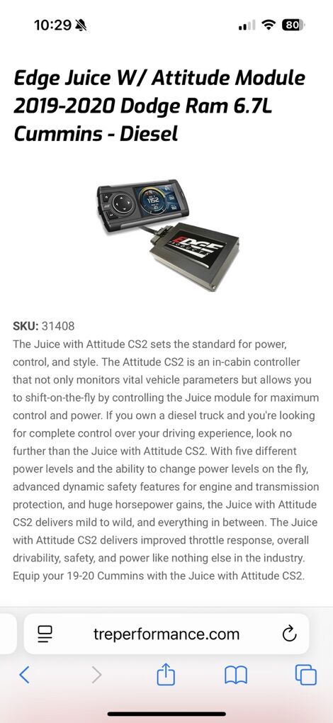 VenmoFor sale: Edge Juice w/ Attitude Module – fits 2019–2020 Dodge Ram 6.7L Cummins (Diesel). Item is brand new and has never been installed. The box is open, but the unit itself is unused. Bought it for my old truck and ended up never needing it. Asking $300 OBO