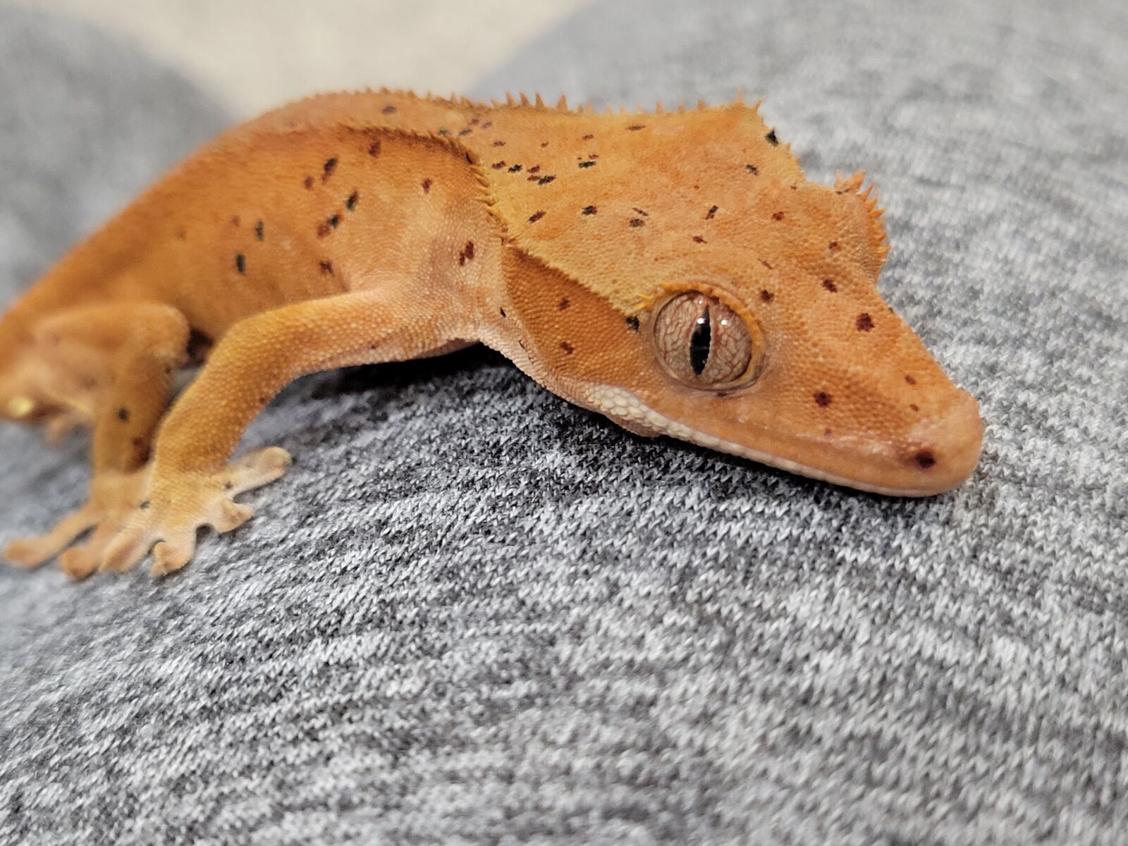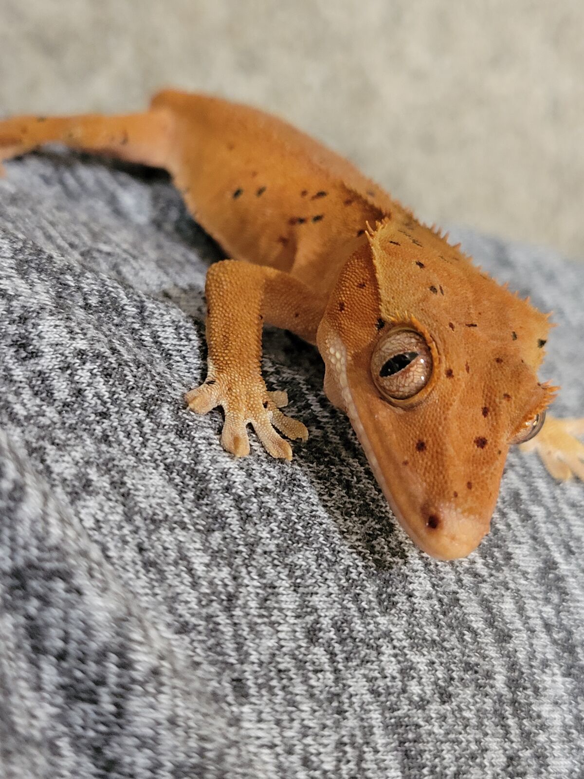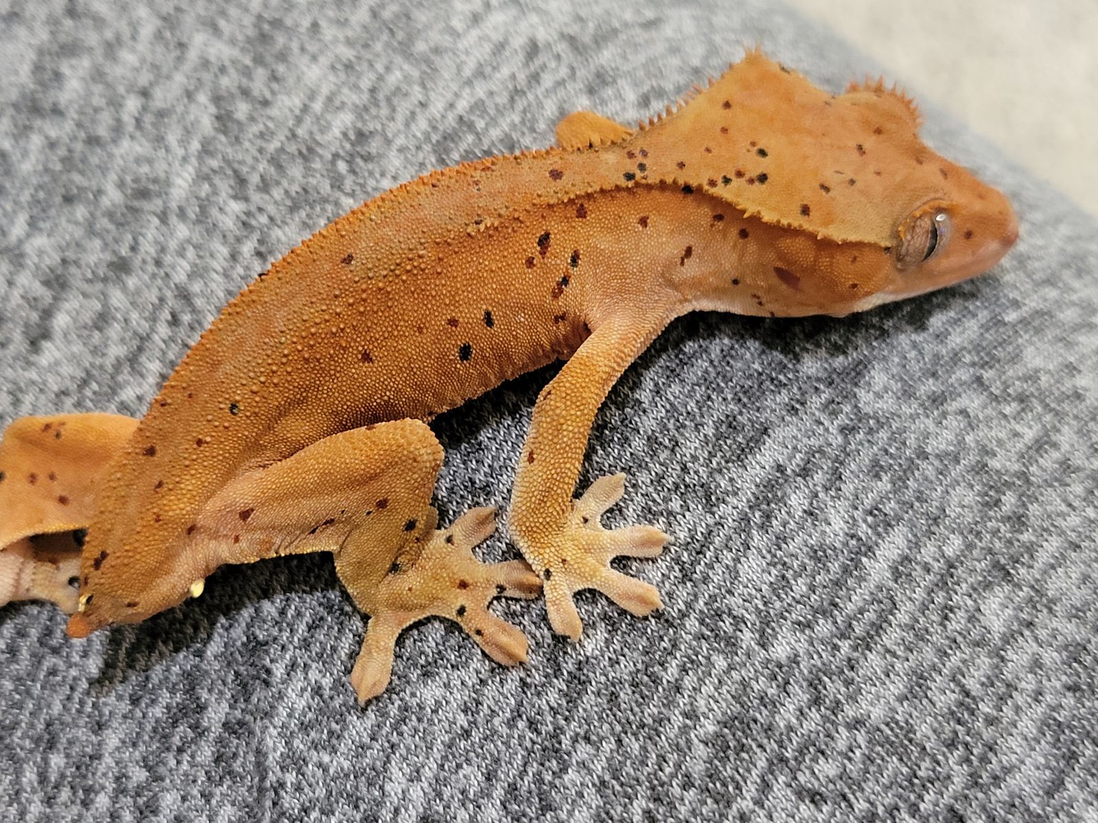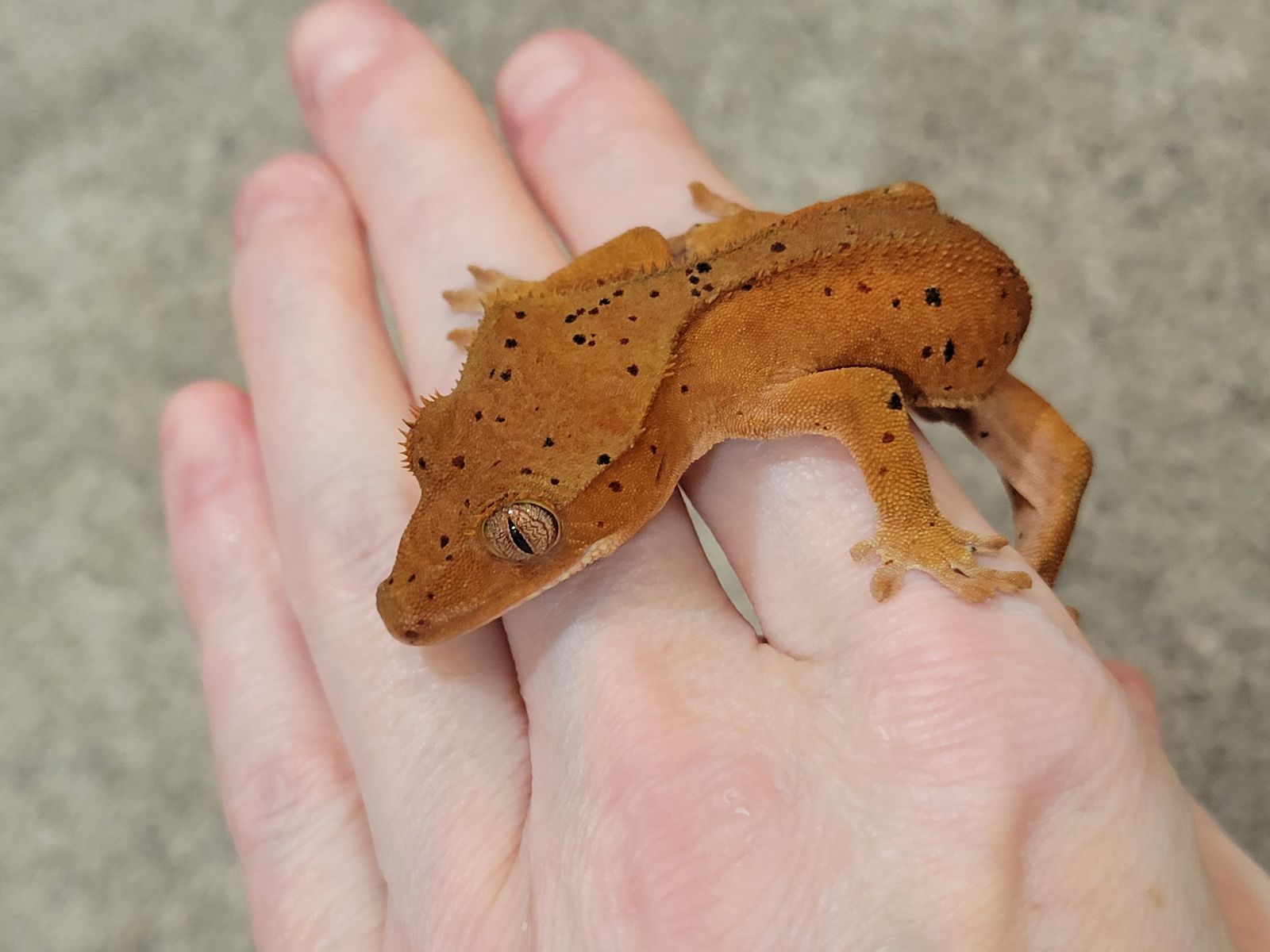 Adorable baby red dalmation gecko. It's super sweet and so adorable, it's also unsexed and it's missing it's tail. Makes a perfect beginner pet. It does not come with any enclosure. (Cash Only)