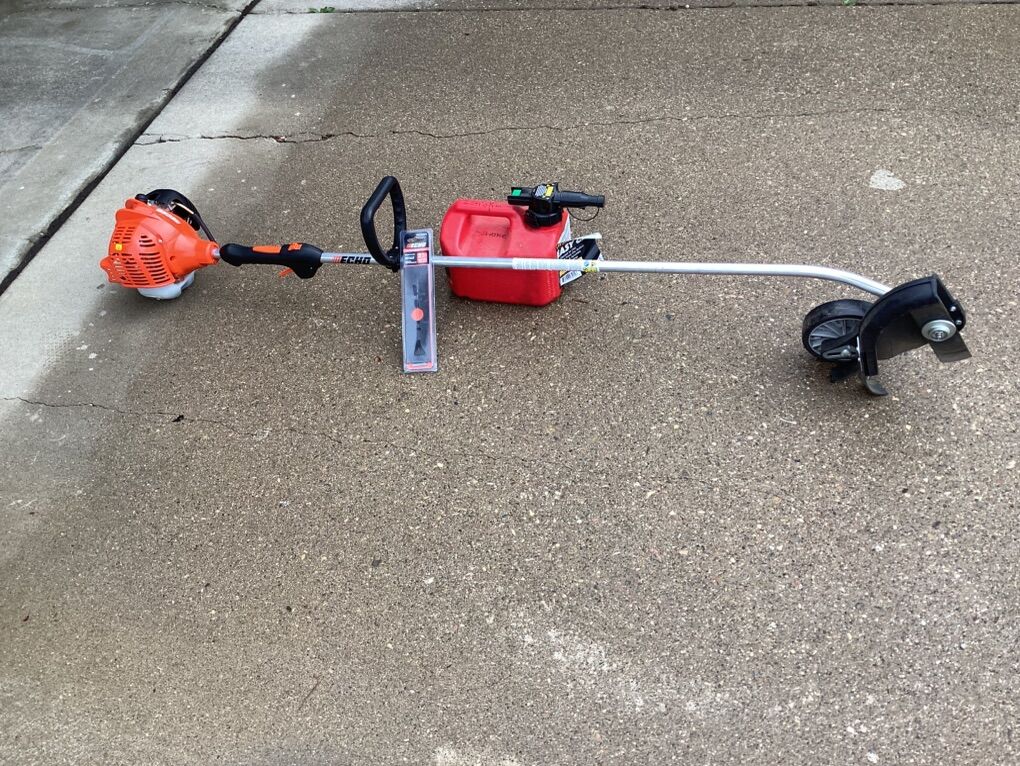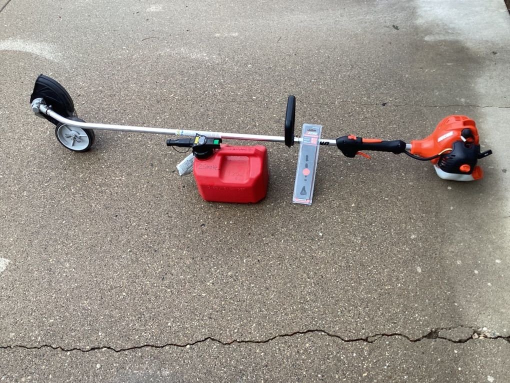 Like new very little use. Package includes two new blades and a Rubbermaid 1.25 gallon gas jug.