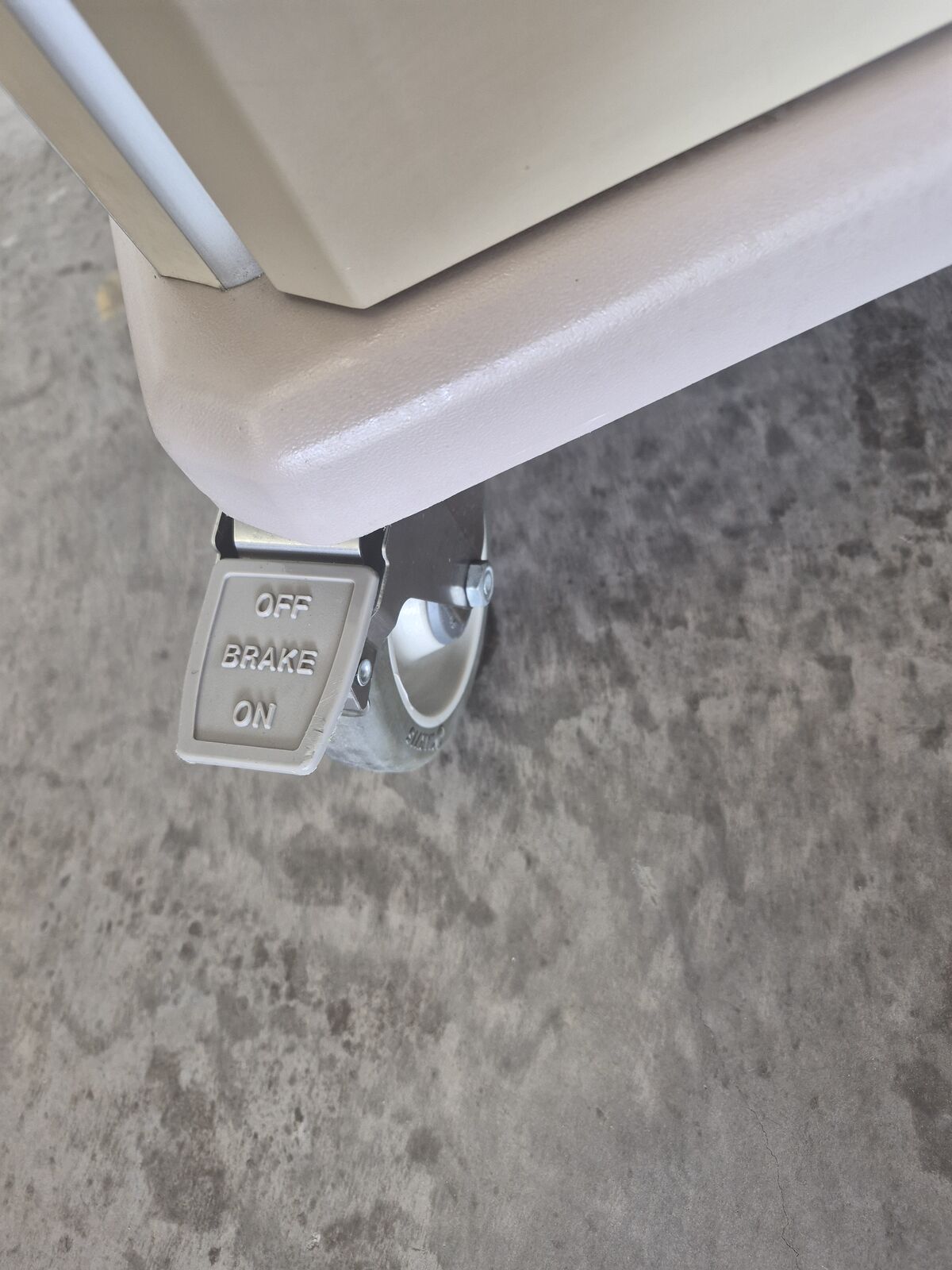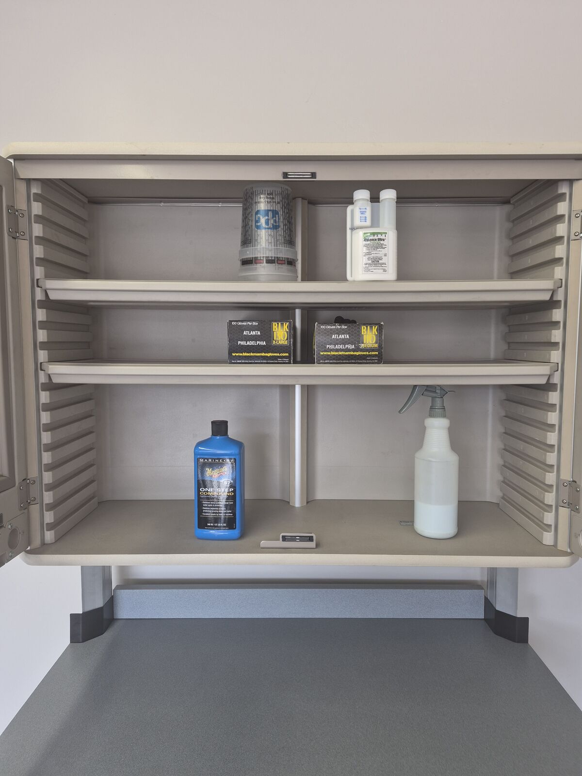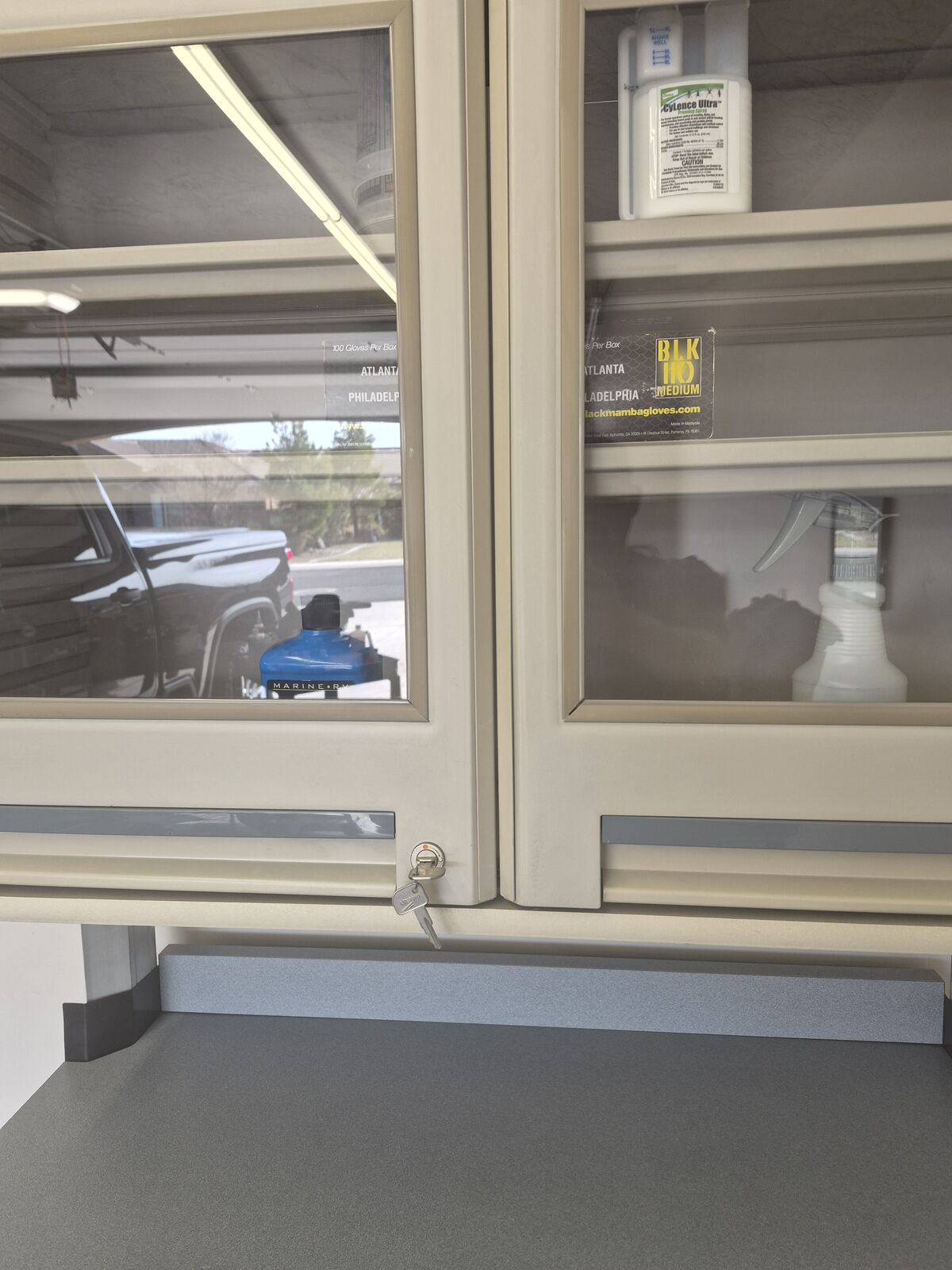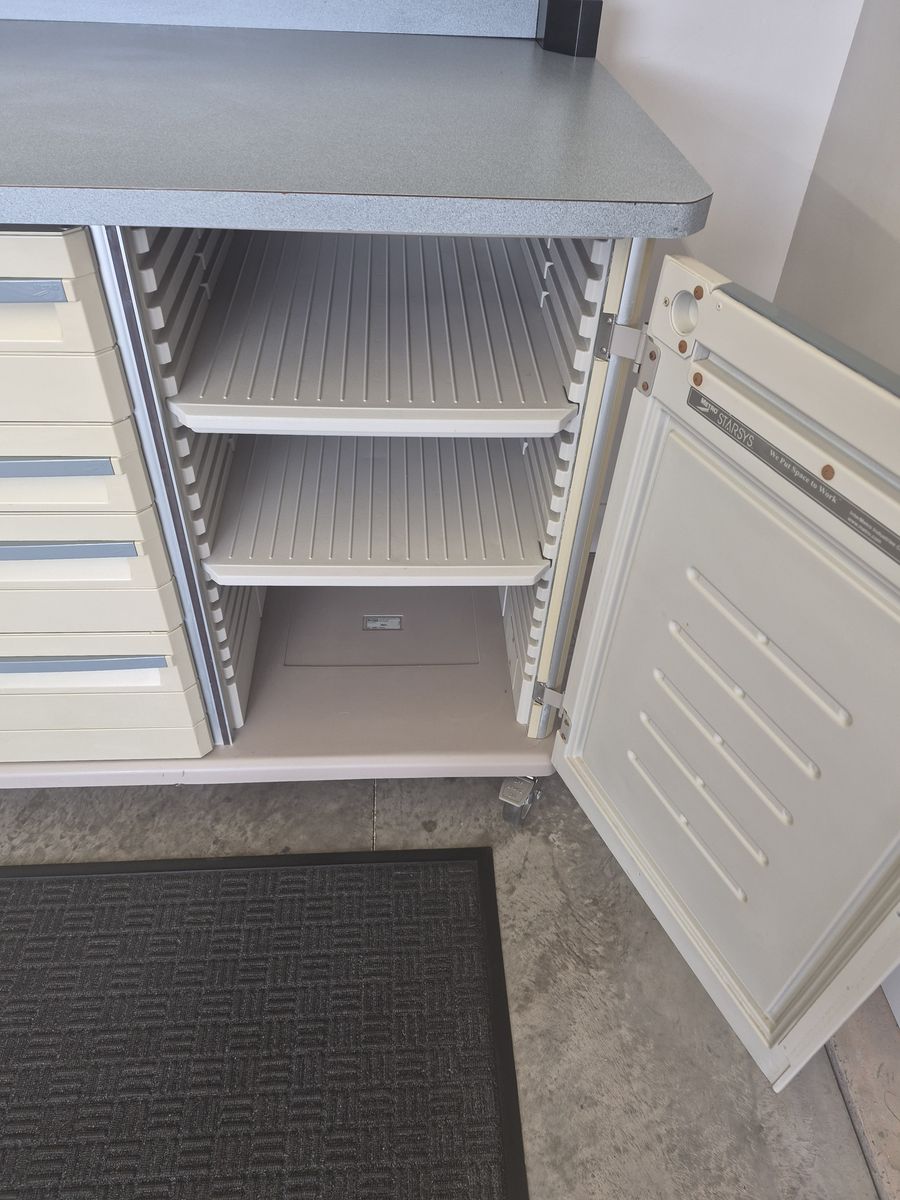 A Certified Handling Systems locking cabinet, Model 1004323026; similar item sells online for $2,165. We are asking $600 or best offer. See our other ads for package deals. This is a very well built, attractive cabinet; stain resistant composite shelves; easy to adjust with several track positions; nice feature - removeable drawer bins; able to lock up chemicals, bug spray, etc. Heavy-duty casters, easy to move and position with locking brakes.