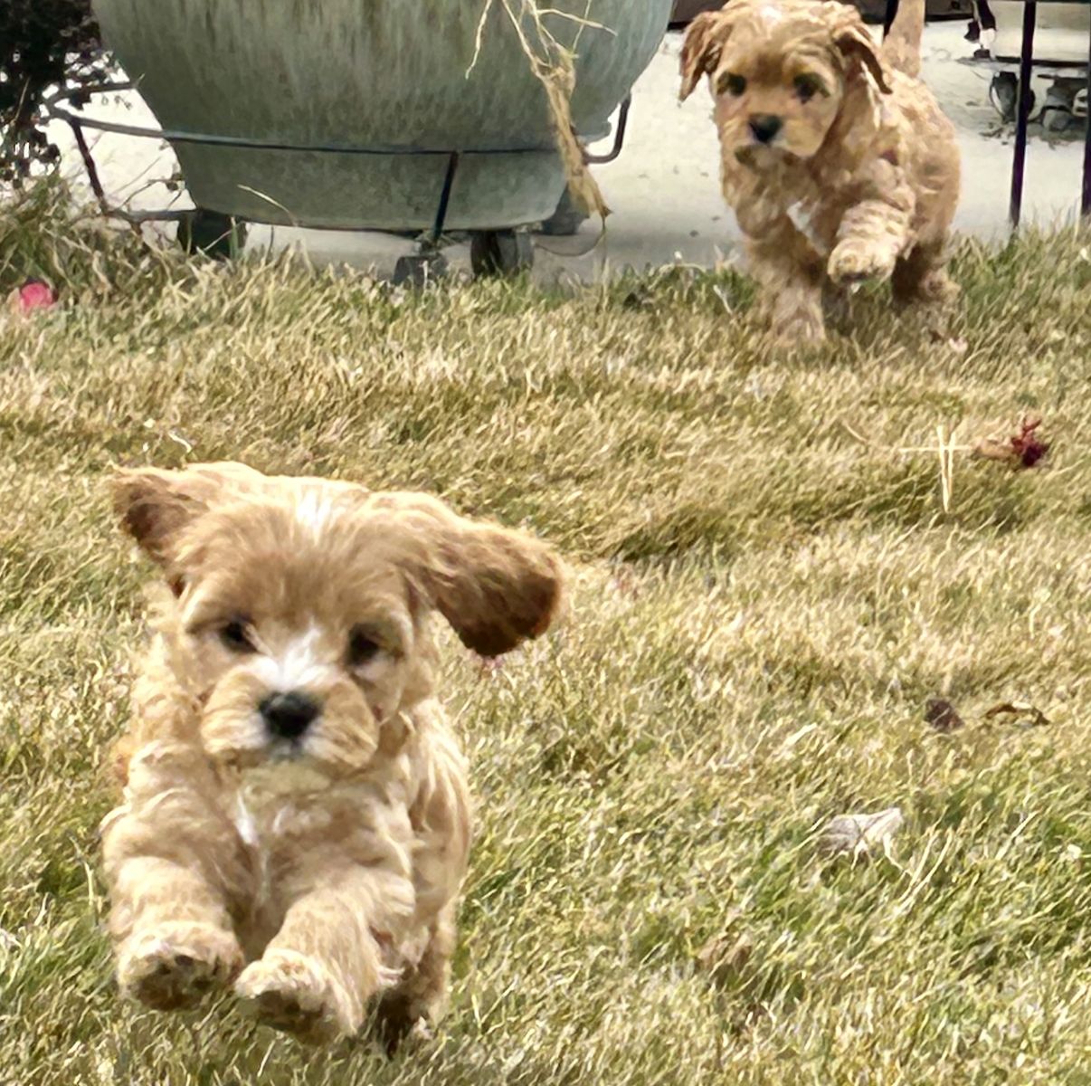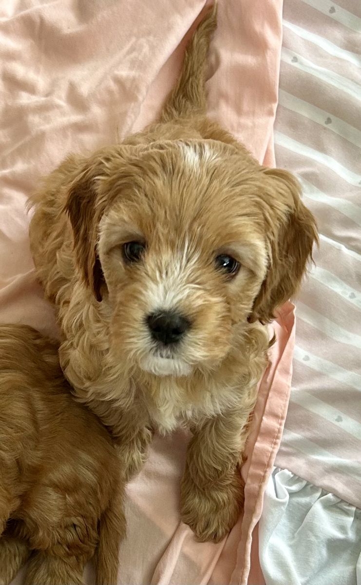 Beautiful sweet and happy little girl Puppy. Her mama is a golden doodle and her daddy is a king Charles Cavalier. They both weigh 16 to 18 pounds. She is such a special little girl. She was raised with four brothers and lots of grandchildren she has had her veterinarian well puppy check and her first shots. She is very loving and playful