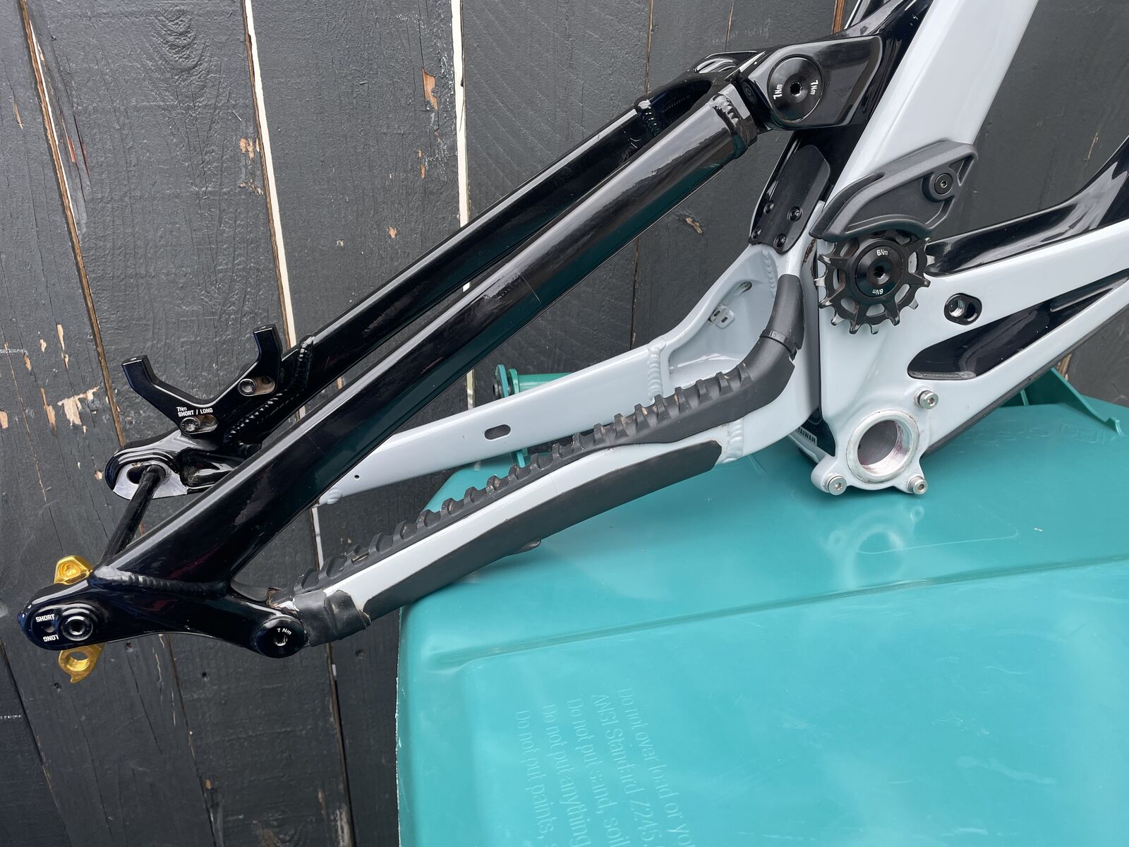 5 bike park days on it, very fresh with no notable damage, just the 3M tape collecting some dirt as pictured on the downtube.