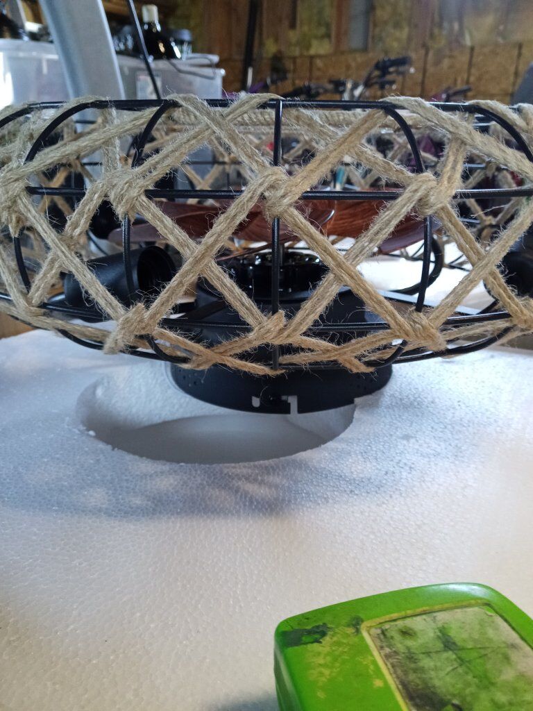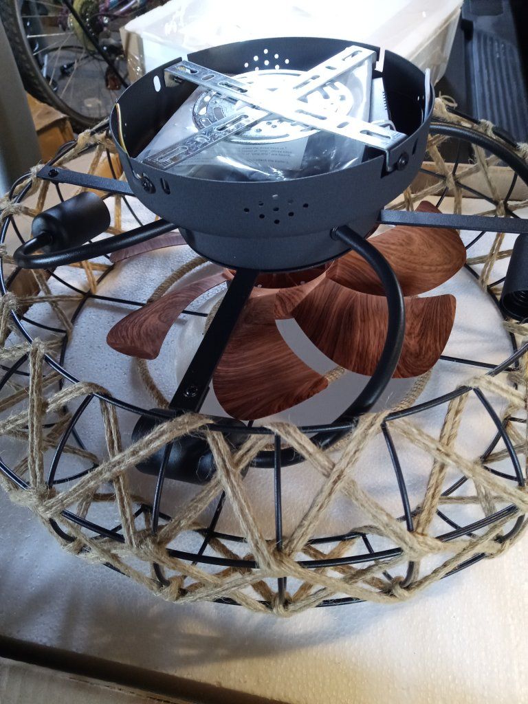 Low-profile caged ceiling fan has unique twine/hemp rope trim and measures 21” total diameter. Includes remote control.