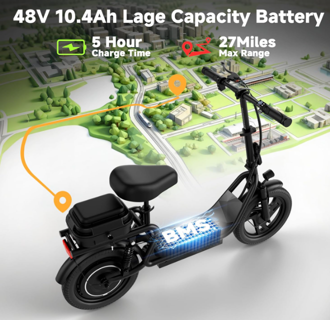 27-Mile Range for Daily Commutes— This scooter packs a high-capacity 48V 10.4AH (499.2Wh) battery, delivering up to a 27-mile range ideal for commuting, city travel, and outdoor rides. Scooter's 5-hour fast charge gets you back on the road in no time
