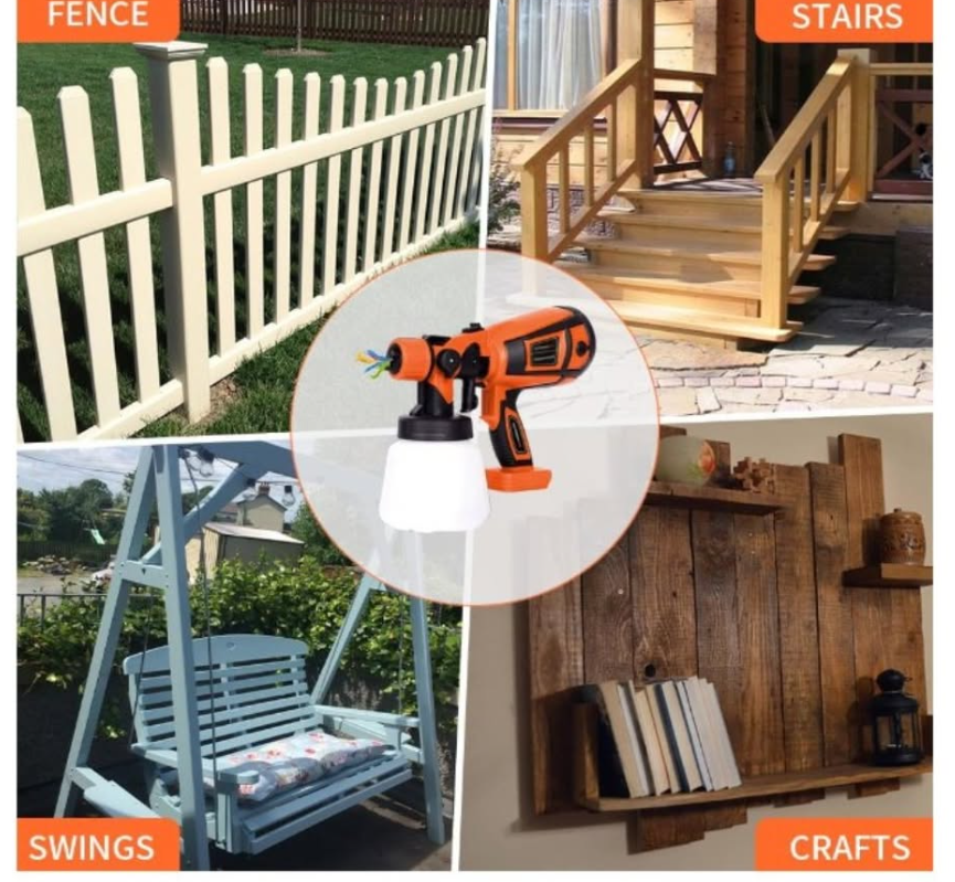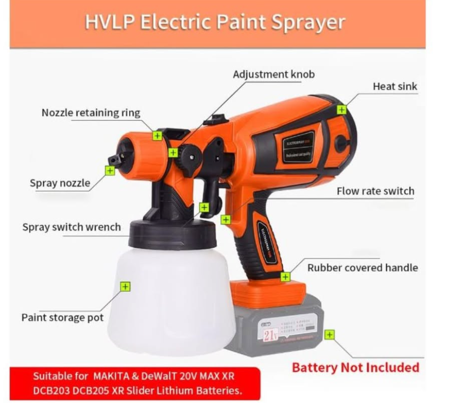 Zelle4 Copper Nozzles & 3 Spray Patterns, 650W HVLP Electric Spray Gun with 900ml Container, Ideal Spray Gun for Furniture, Cabinets, Fences, Decks, Walls.(doesn't come with battery, suitable for MAKITA&DeWaIT 20V MAX XR DCB203, DCB205 xr Slider lithium batteries)