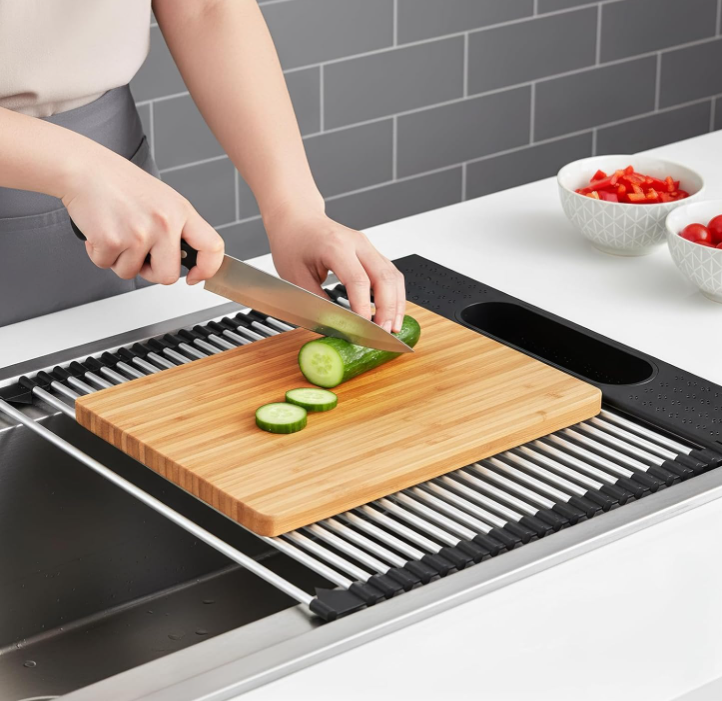 ZelleUpgraded Design with Cutlery Basket This over-sink drying rack doubles as a versatile sink cover, measuring 17.5" (L) x 15.2" (W). Now upgraded with a detachable cutlery basket, it helps organize utensils neatly—perfect for compact kitchens, apartments, RVs, and campers.