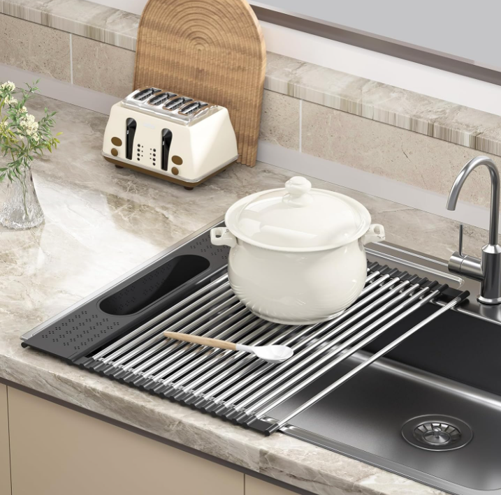 Multi-Functional & Versatile More than just a dish rack, this roll-up rack serves as a multi-purpose kitchen tool. Use it for rinsing fruits and vegetables, as a trivet for hot cookware, as a food prep station, or as a fruit drying rack. A true space-saving essential for everyday cooking and camping.