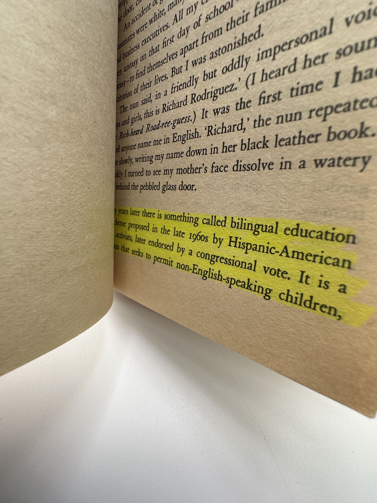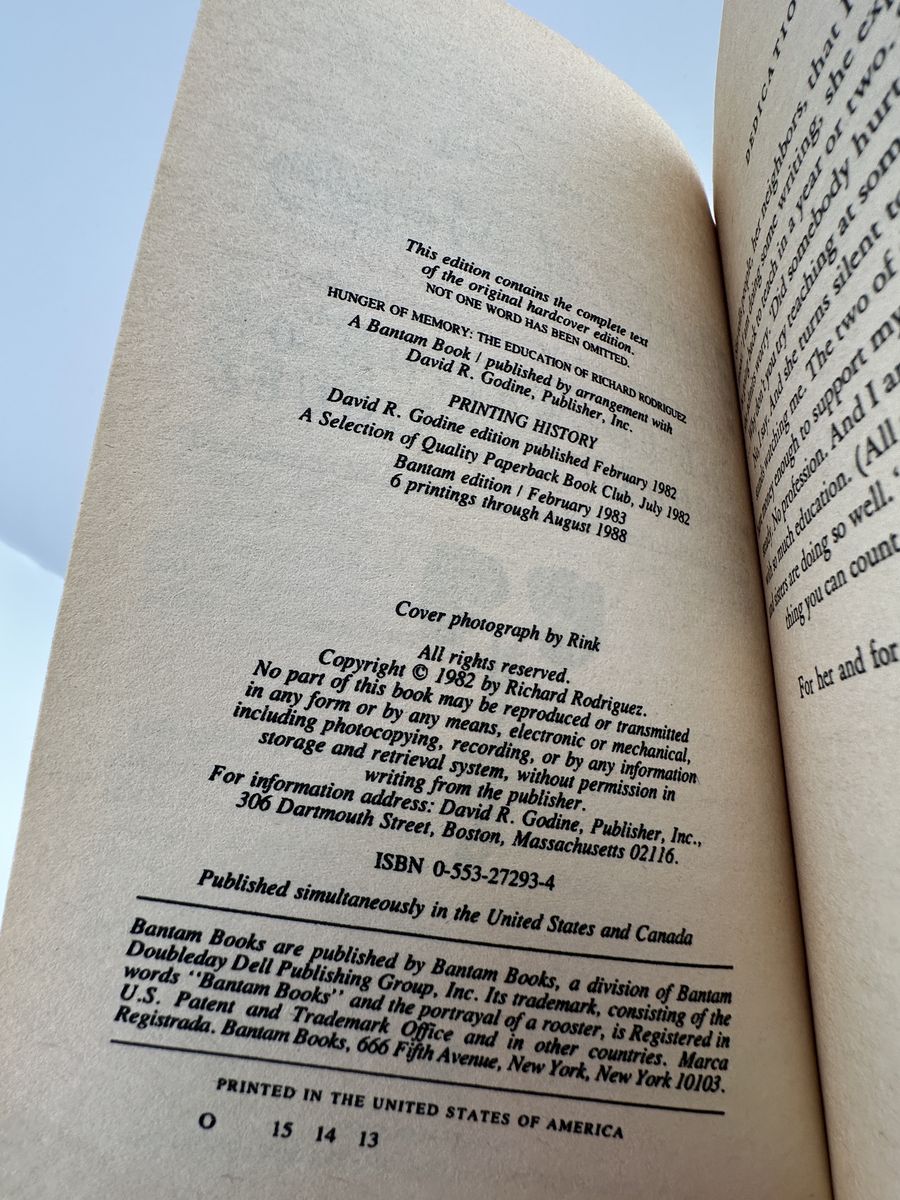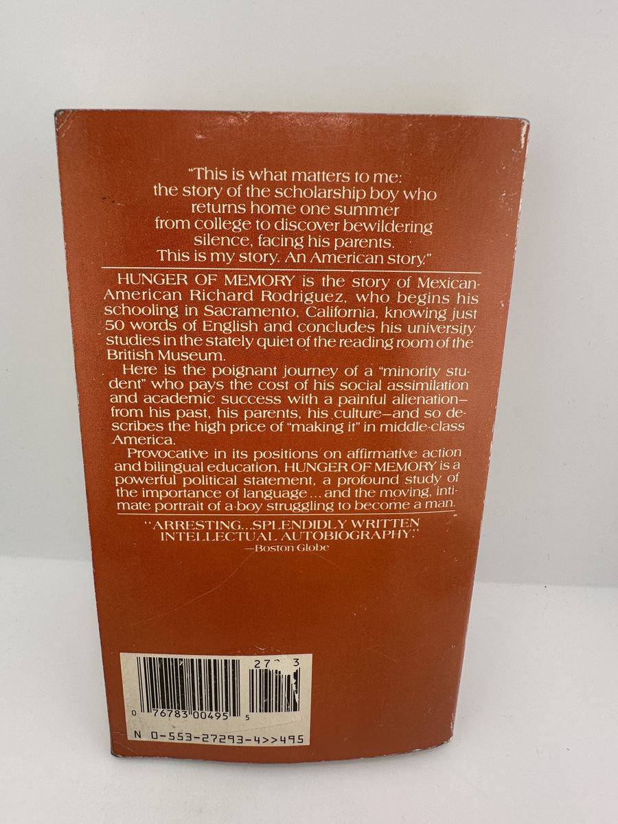 ApplePayHunger of Memory: The Education of Richard Rodriguez by Richard Rodriguez. 1982 Bantam paperback edition. Powerful memoir on education, language, and assimilation.