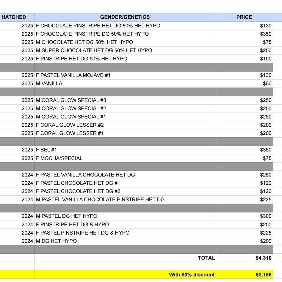 PayPalSelling my full hatchling rack with the listed ball pythons. Super great deal for anyone looking to get into the hobby or sell at upcoming reptile shows! I just need to downsize and make room and dont have as much time for the business at the moment. I am selling at wholesale price 50% off for anyone interested in buying the whole lot. If you want individual snakes then the 50% off doesn't apply. See the table with all the snakes and prices, plus with 50% off discount. I can include a homemade melamine hatchling rack with tubs and a thermostat for an extra $200 if interested!