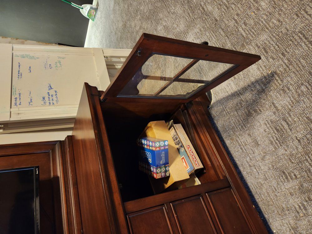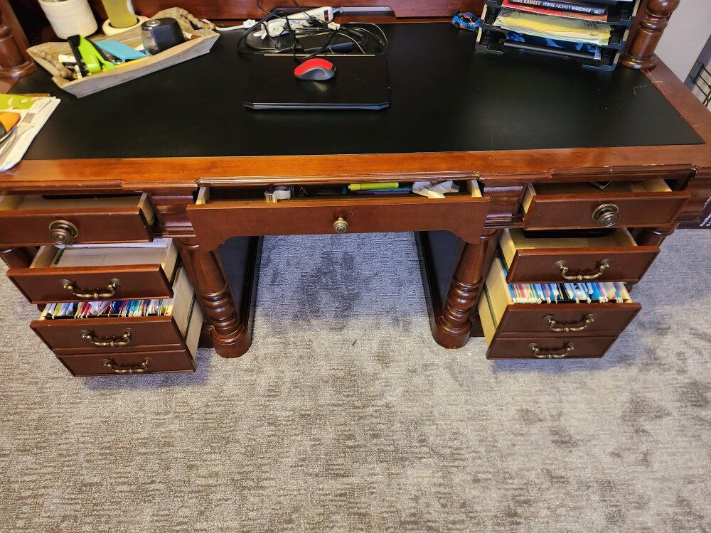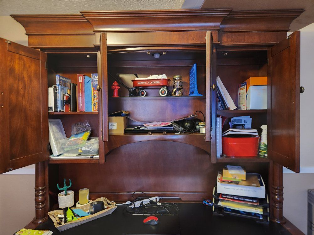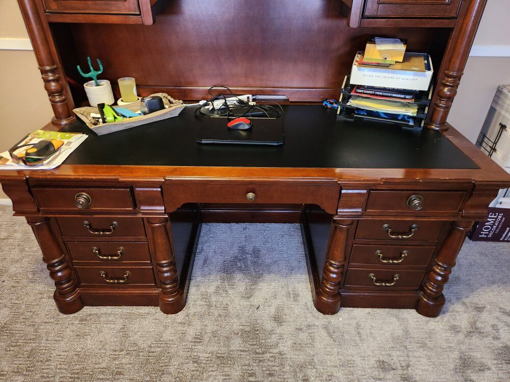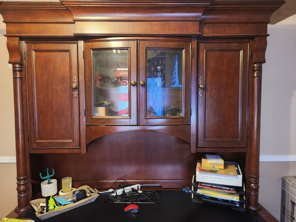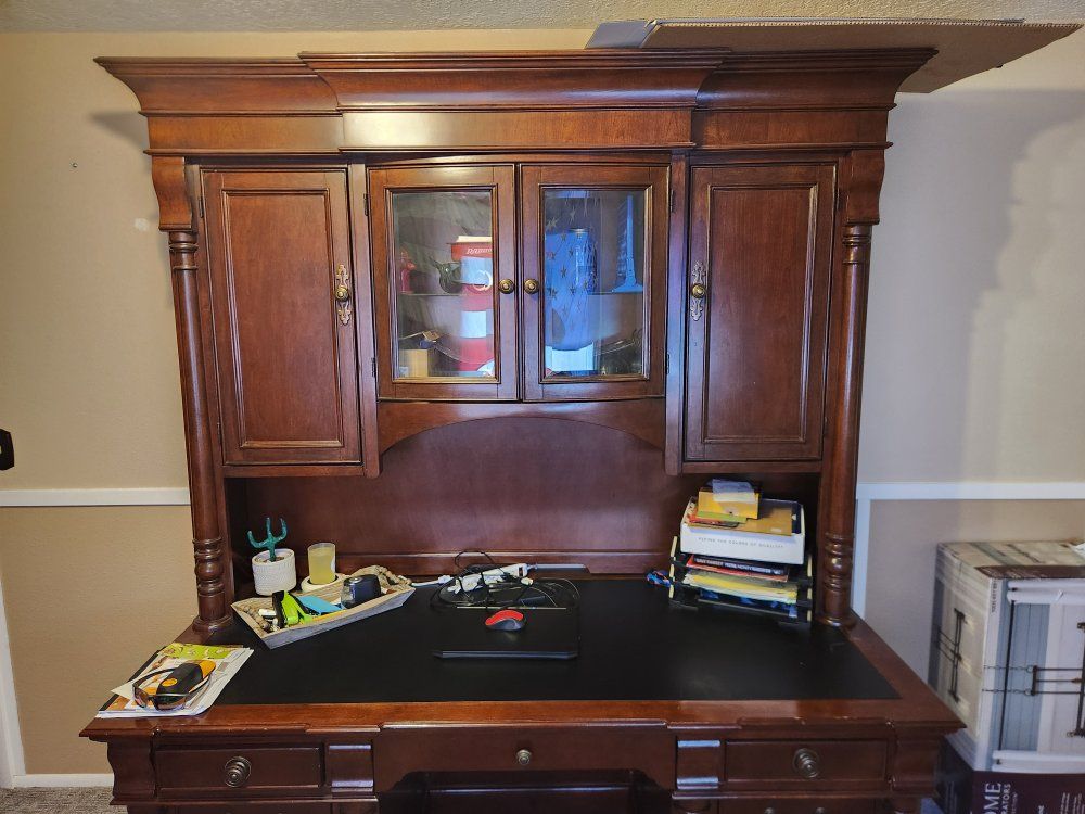 VenmoNice Desk lots of storage. Has light in center top cabinet. Heavy and quality. Separates into 2 pieces for transport. Willing to deliver.