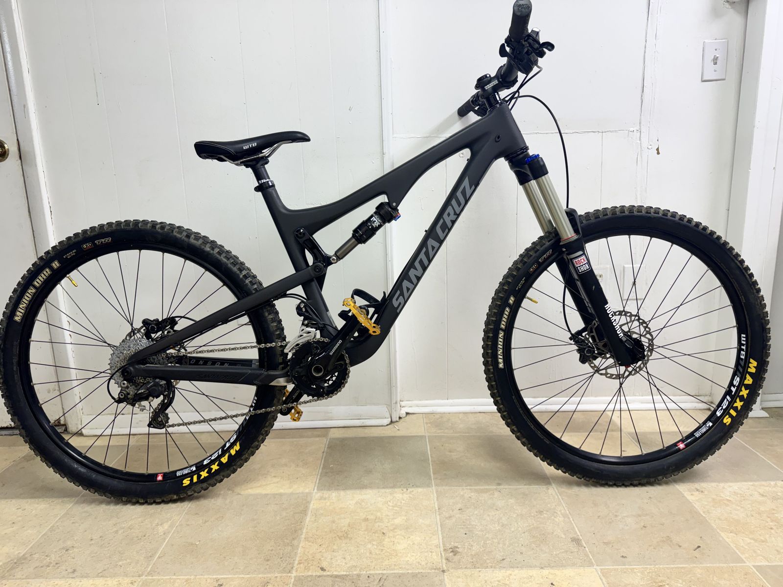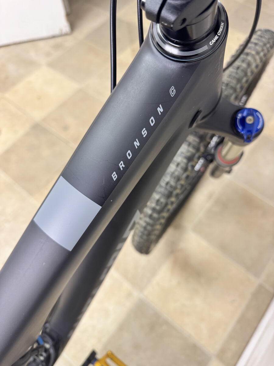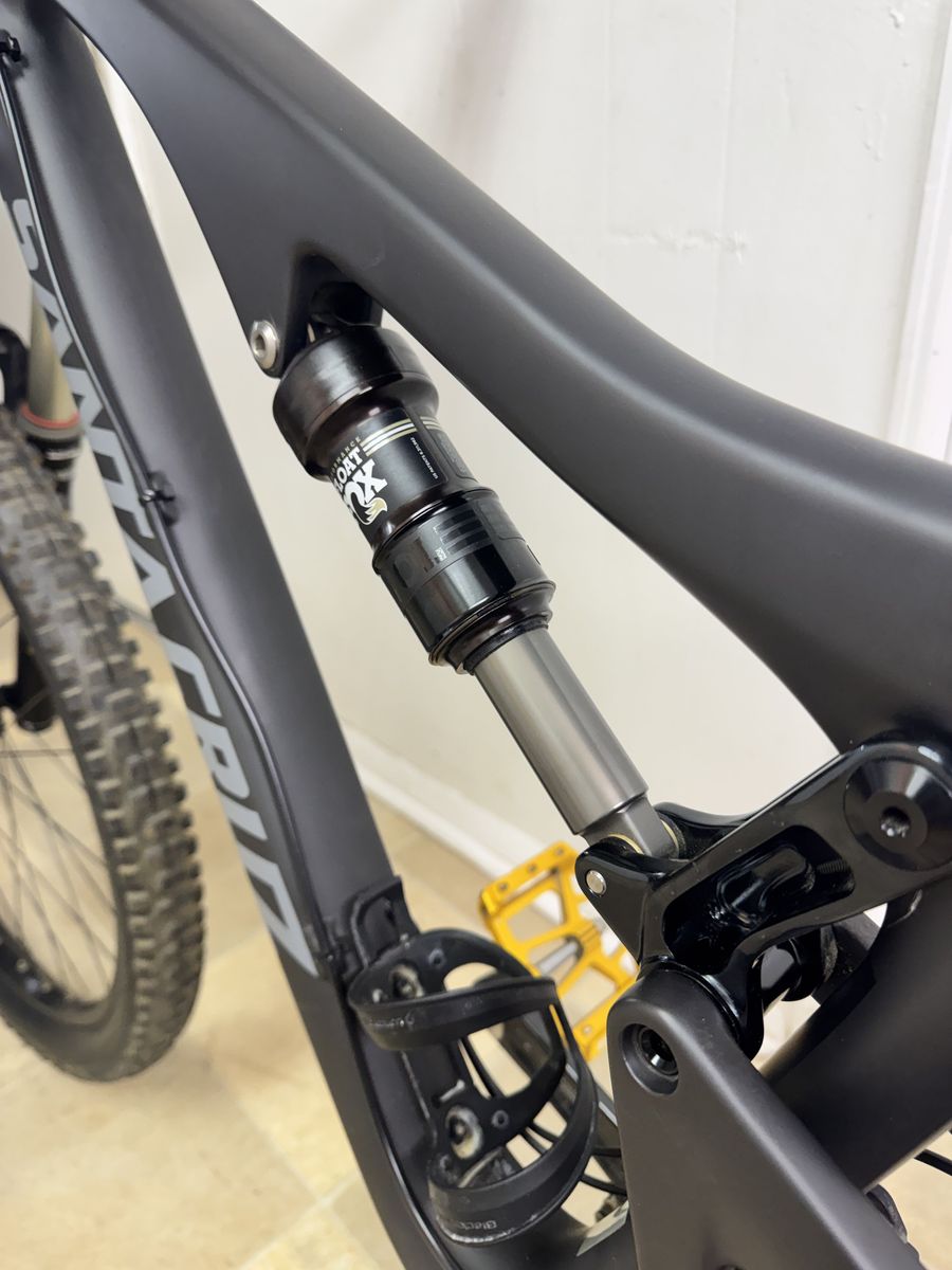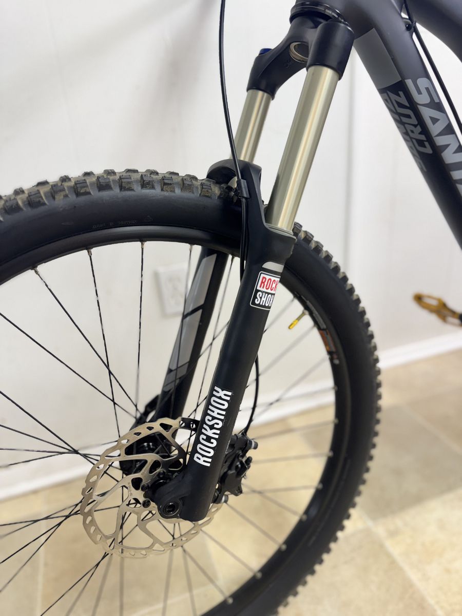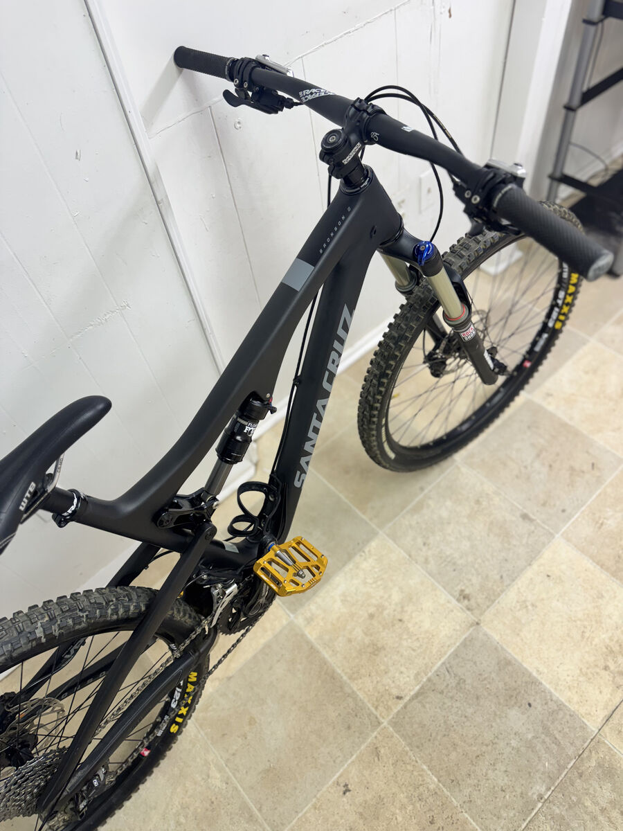 Santa Cruz Bronson 2.0 Carbon R (Large) mountain bike in excellent condition. This bike has only been ridden a handful of times, approximately 10 hours total, and is in fantastic shape. It features a lightweight carbon frame, a Fox Performance Series rear shock for smooth, responsive suspension, and reliable Shimano brakes for confident stopping power. It’s been very lightly used and well cared for. We’re simply looking to pare down our collection. Please feel free to message me with any questions. The definitive all-mountain race machine More aggressive than ever with 150mm of VPP3 suspension Updated geometry is slacker, lower, and longer in the front C-level carbon frame is exceptionally stiff and strong 150mm RockShox Sektor Gold RL fork with TurnKey lockout Details Year: 2016 Brand: Santa Cruz Model: Bronson C Size: Large Frame Material: Carbon Fiber Drivetrain: SRAM, 1x11 spd Weight: 30 lbs 12 oz Build Fork: RockShox Sektor Gold RL fork with TurnKey Fork Travel: 150mm Rear Shock: FOX Performance Series FLOAT Rear Shock Travel: 150mm Brakes: Front - Shimano Saint M820 Rear - Shimano SLX M675, Disc Brakes - Hydraulic Shifters: SRAM X1, Mechanical Rear Derailleur: SRAM GX Bottom Bracket Shell: Threaded Crankset: Race Face Aeffect Alloy, 32t, 175 mm Cassette: SRAM XG-1150, 10-42t Chain: SRAM Handlebar: Race Face Alloy, 790mm Headset: Cane Creek integrated Stem: Race Face Aeffect Alloy, 35.0 mm x 50mm, 6° Seatpost: PRO Koryak, 31.6mm Seatpost Travel: 150mm Saddle: WTB Volt Front Axle Spacing: 15x100mm (Thru-Axle) Rear Axle Spacing: 12x148mm Boost (Thru-Axle) Wheelset: WTB 711 STi23 Tubeless Front Tire: Maxxis Minion DHF EXO TR, 27.5 x 2.5 Rear Tire: Maxxis Minion Aggressor EXO TR, 27.5 x 2.3 Tire Type: Tubeless Pedals: AE02 Evo Geometry Fit Range: 5'10 - 6'2 Sizing Guide A. Effective Top Tube: 618 mm B. Seat Tube: 460 mm C. Seat Tube Angle: 74° D. Head Tube Angle: 66° E. Head Tube: 110 mm F. Stack: 605 mm G. Reach: 445 mm H. Standover Height: 734 mm