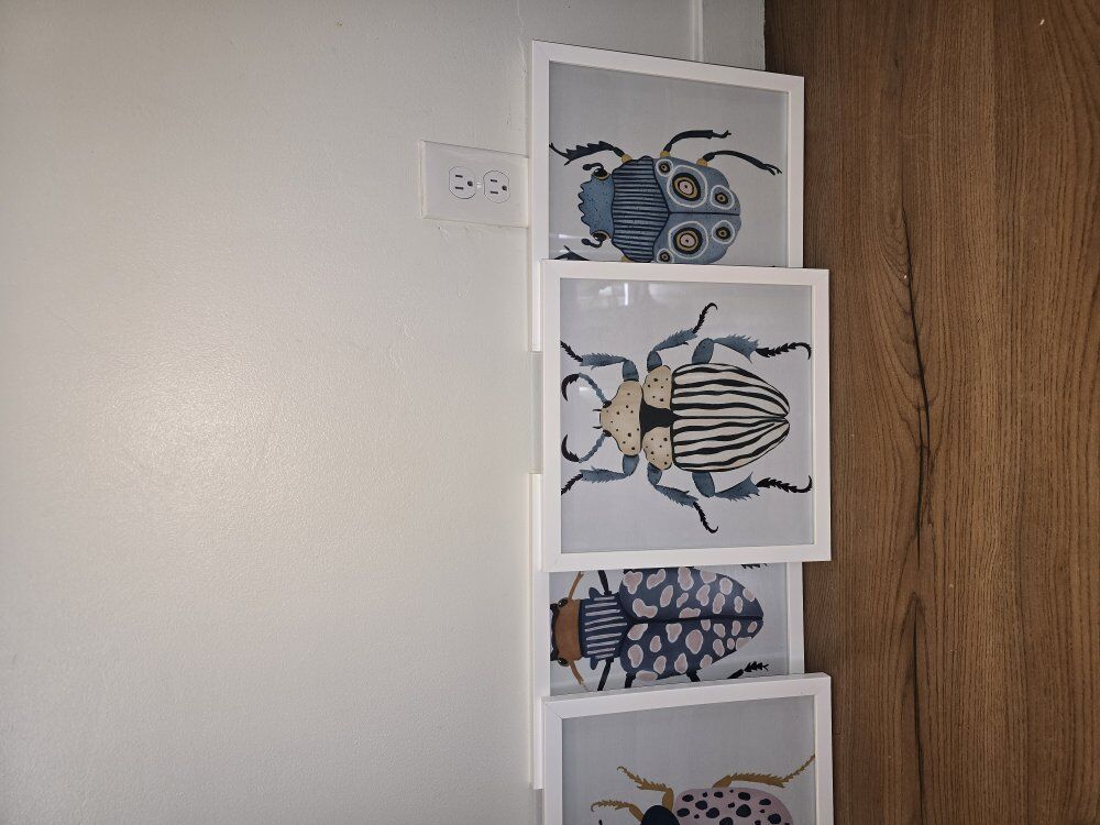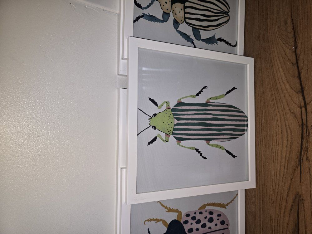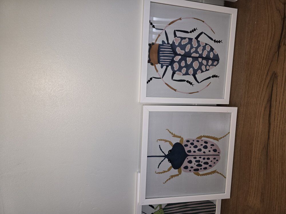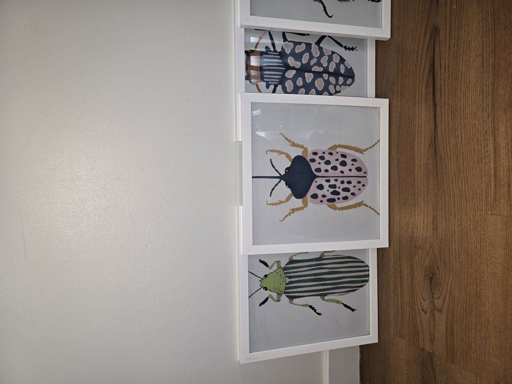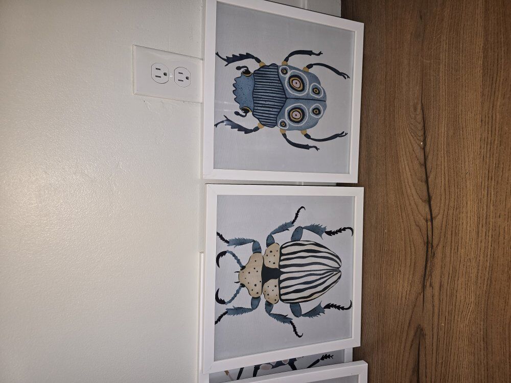 5 piece glass framed beetle wall art decor for kids bedroom. Colors are beautiful pastel colors. These are new canva material prints framed and ready to hang. Frames are all in good condition. Selling as a set ONLY. Asking $40 for the set. VENMO TO HOLD, porch/door pickup only in West Haven.