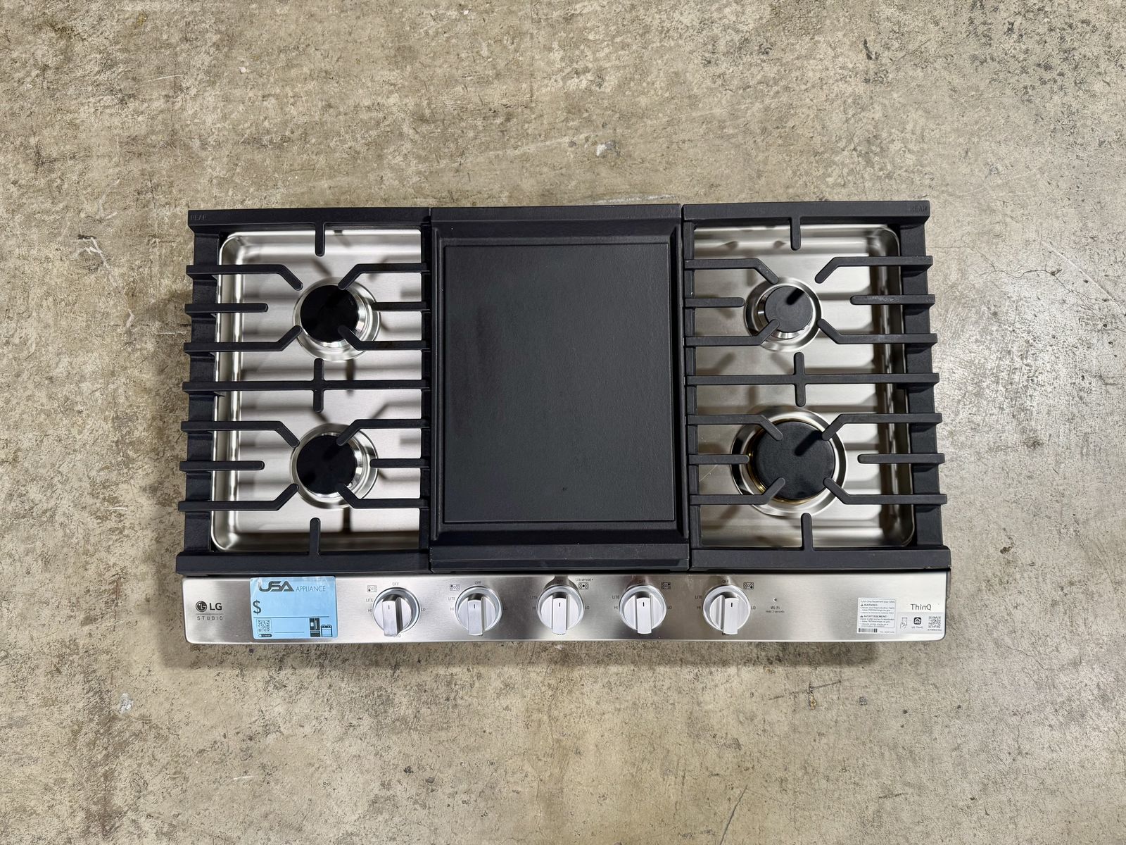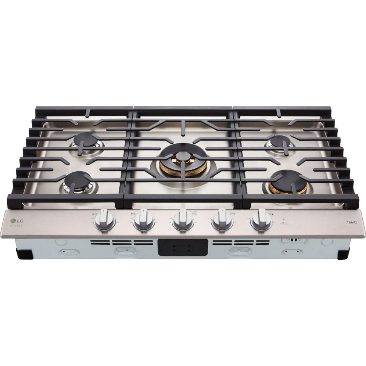 LG Gas Cooktop with 5 Sealed Burners, Cast Iron Grates, UltraHeat™ Dual Burner, LED Illuminated Knobs, 24K Center Burner, Front Center Knob Controls, Child Lock, and Conversion Kit: 36" Width