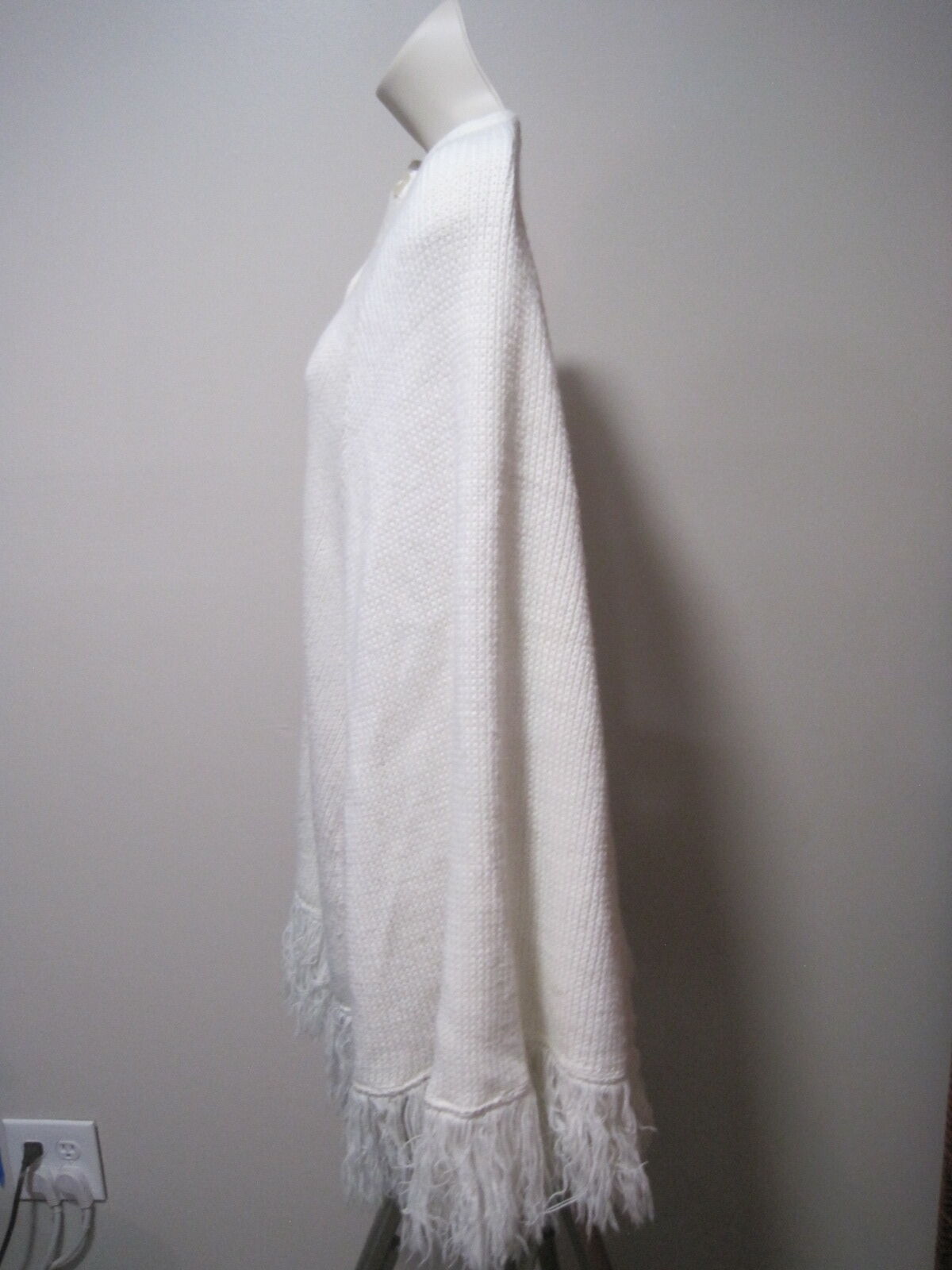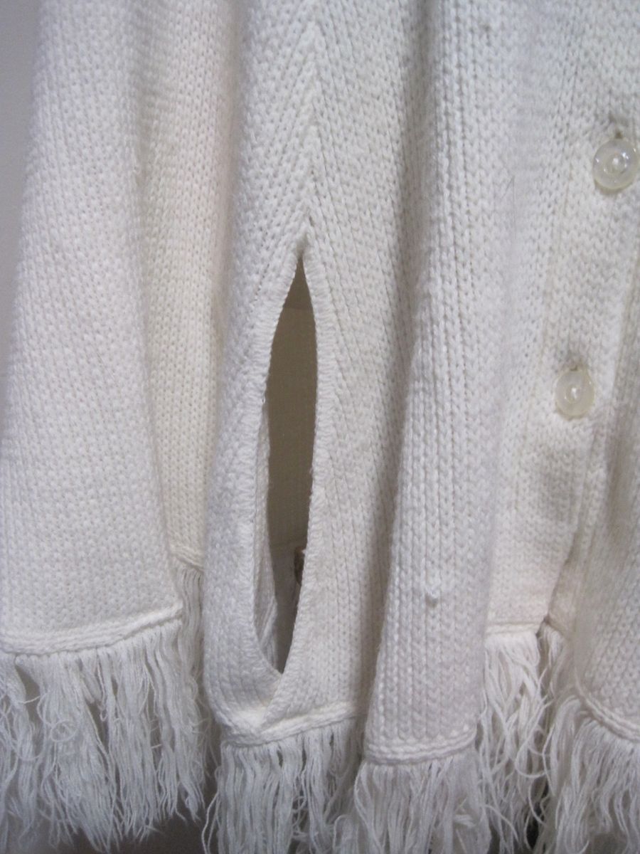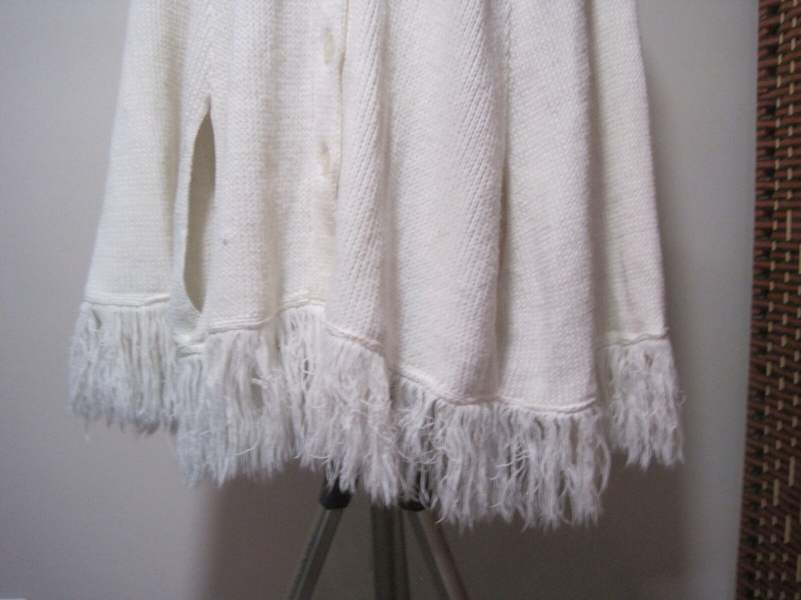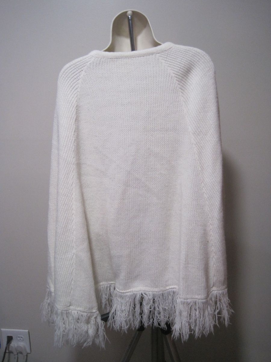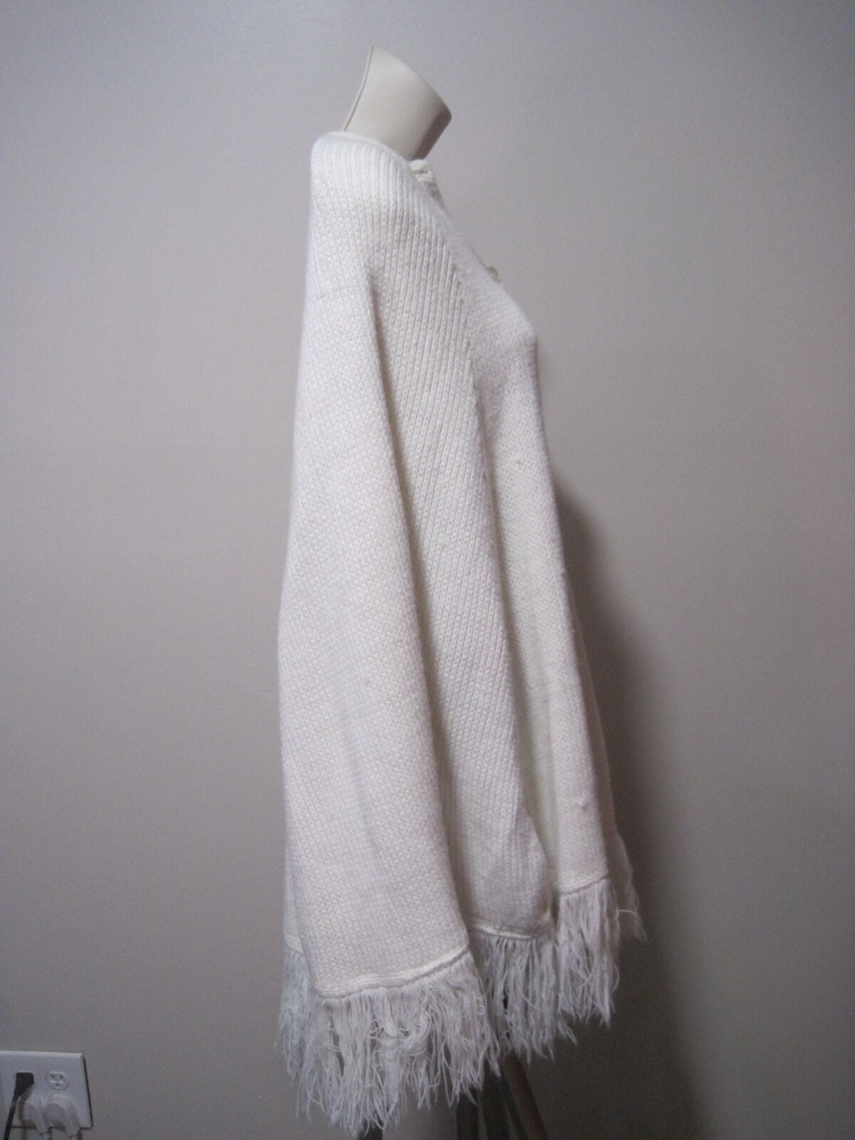 This vintage women's size large cream knit arm holes button sweater poncho is a cozy and stylish piece perfect for various occasions like travel, parties, and casual wear. Made of acrylic material with a tight-knit design, it features a round neckline and sleeveless design with tasseled accents. The poncho style adds a touch of cottagecore charm, making it a versatile and comfortable addition to any wardrobe, especially for the winter, fall, and spring seasons. Easy to care for as it is machine washable, this sweater is a timeless piece that can be personalized to suit any style.