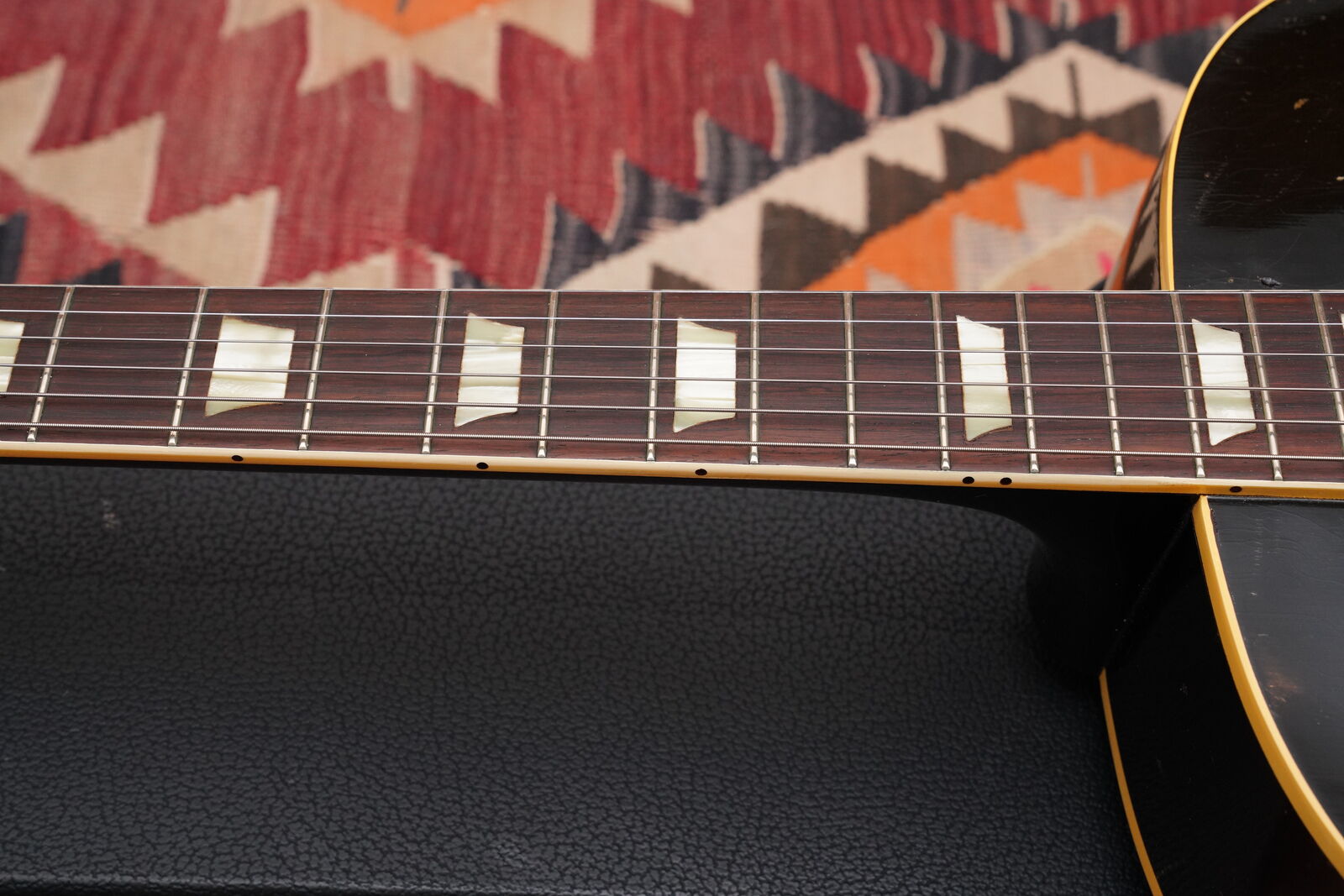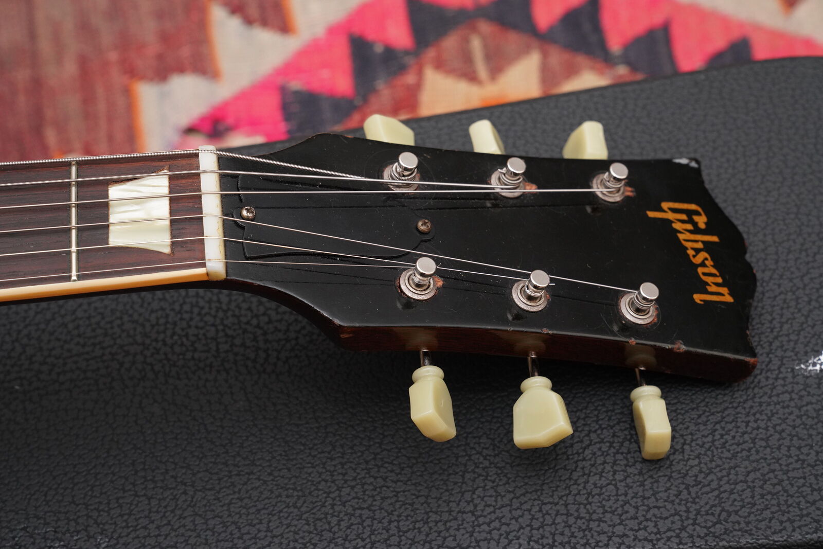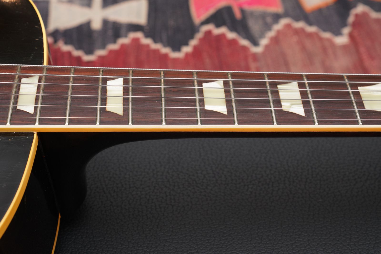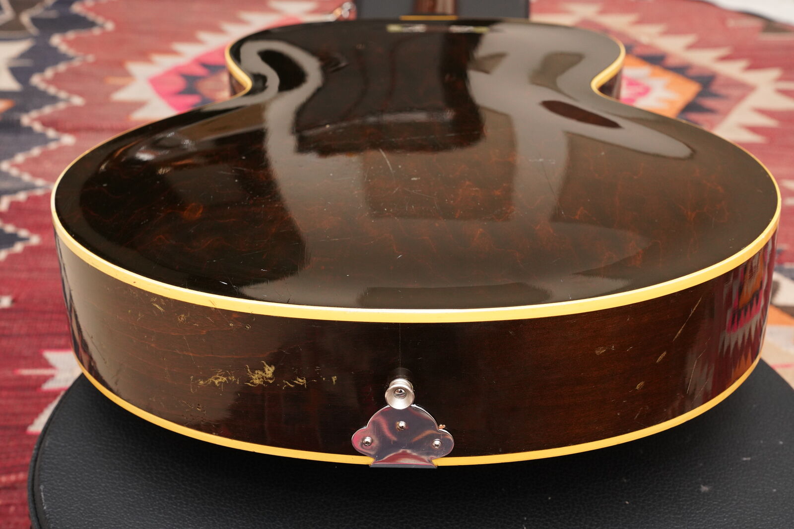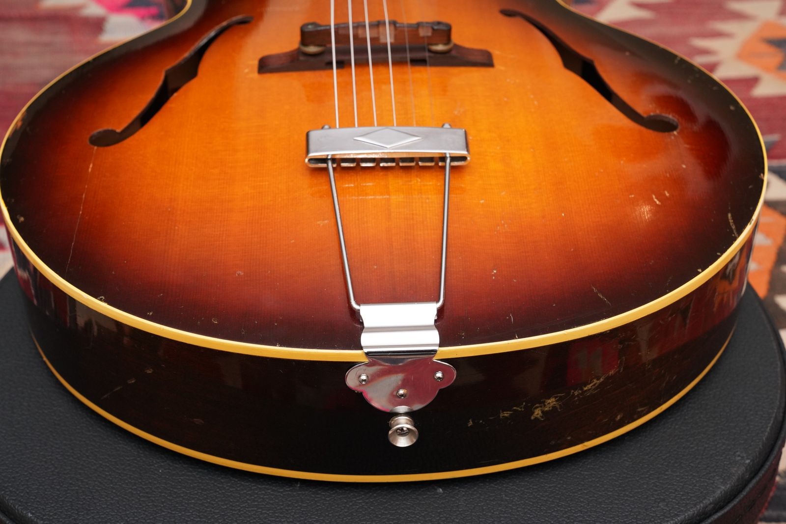 Guitar is in overall good condition with appropriate wear for its age. There are minor dings and dents in the finish as highlighted in the photos. There is a repaired split near the top bass side F-hole that has been expertly cleated on the inside and is very stable. Rosewood bridge and base are original, the nut and frets are original and do not show any major wear, nor are there major divots on the fretboard. Original pickguard and bracket are included - at some point the pickguard had a small cutout for a pickup. Tuners are modern drop-in replacements, at some point it had 70's style Schaller tuners and the extra mounting holes have been filled. Really nice feeling neck with the Les Paul style trapezoid inlays (I imagine it's as close to feeling what an actual late 50's Les Paul burst feels like as I'll ever get). Tailpiece has been replaced with a modern period-correct style diamond trapeze tailpiece. Guitar keeps tune well and sounds lovely.