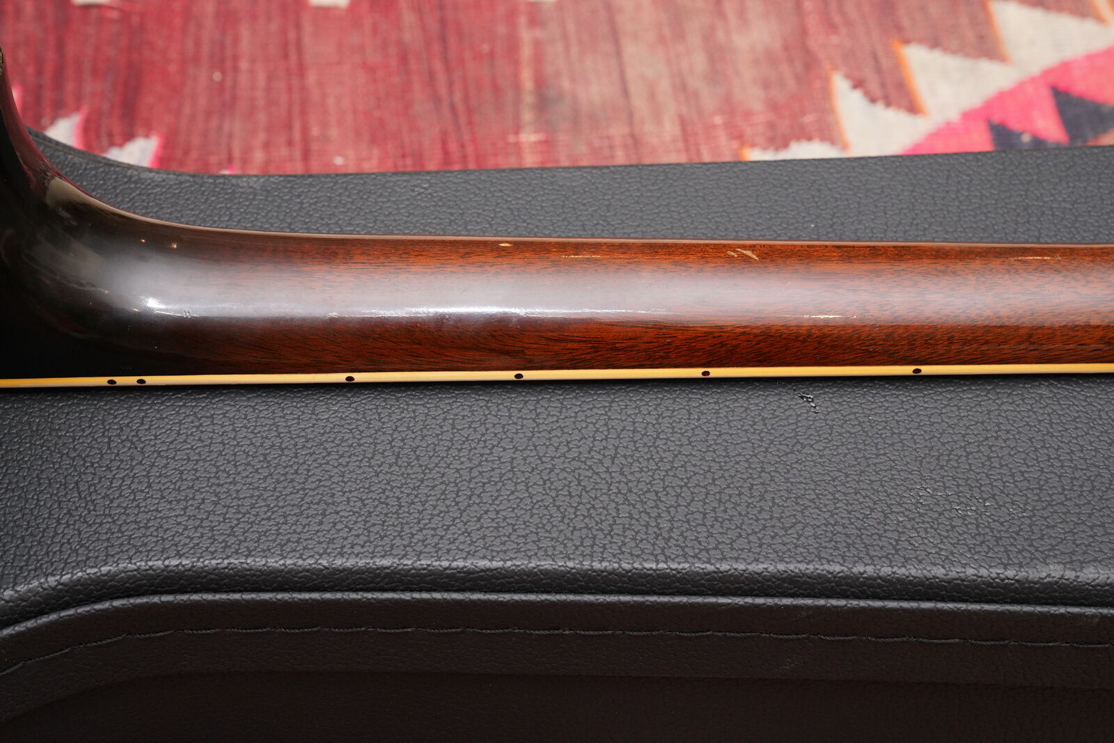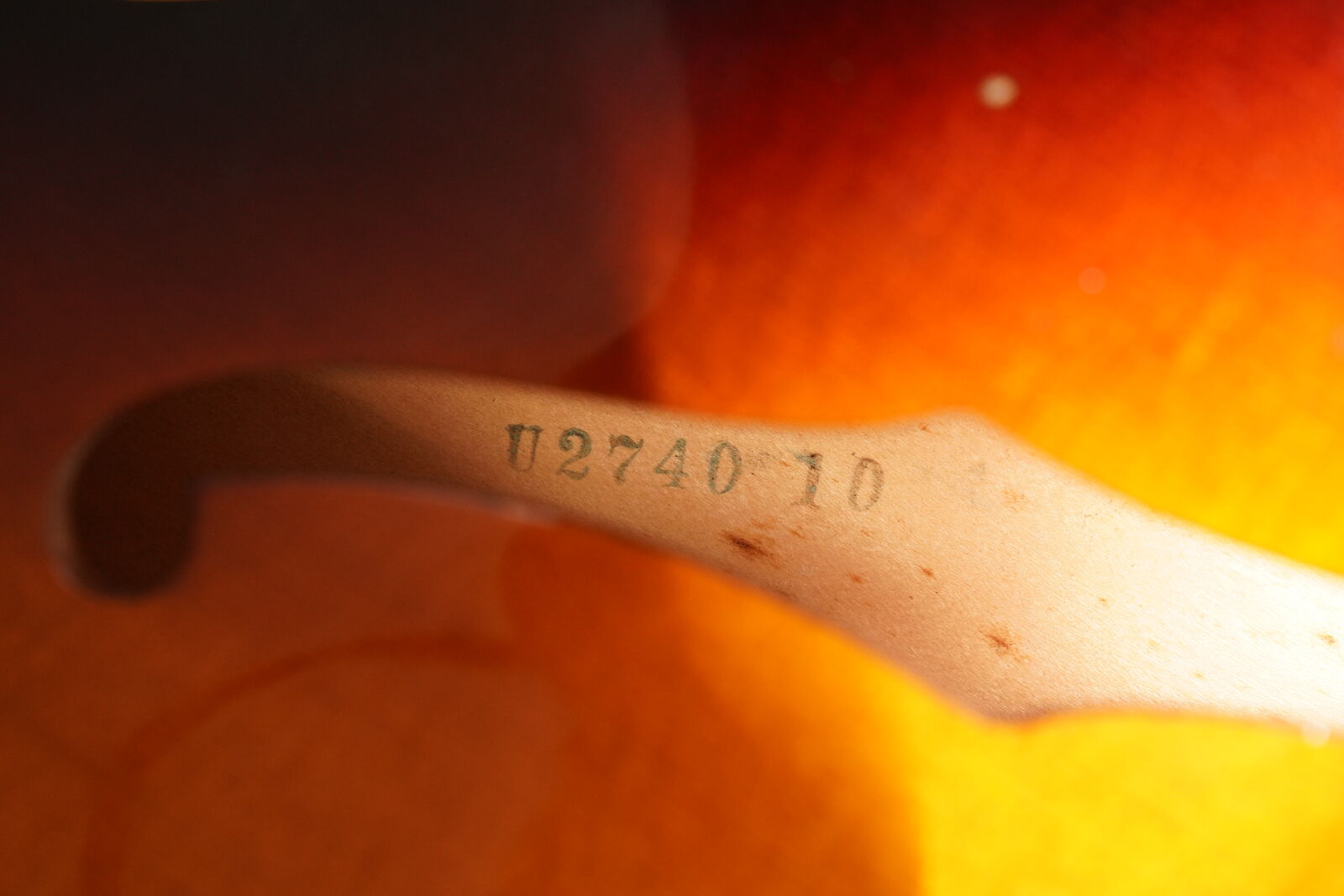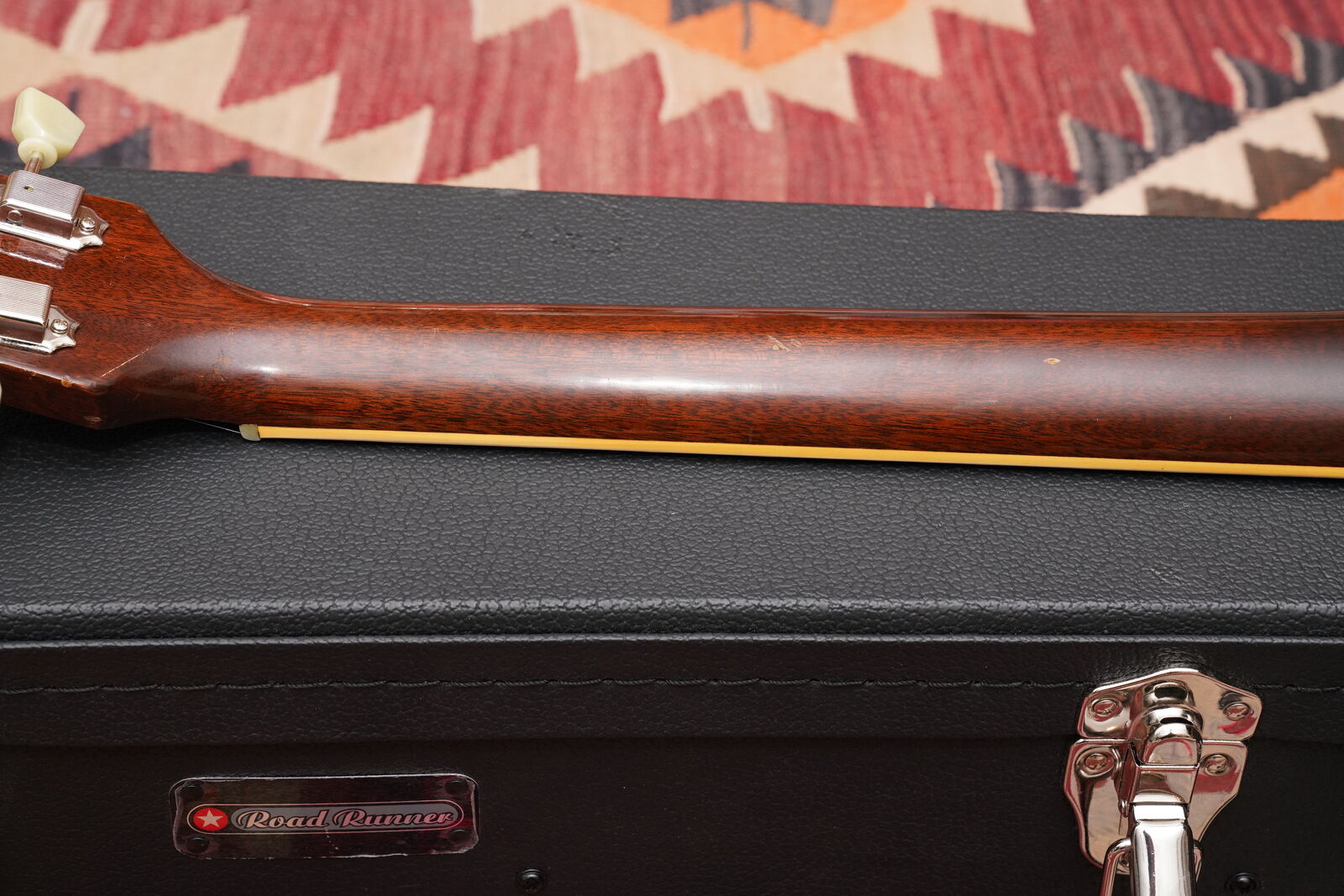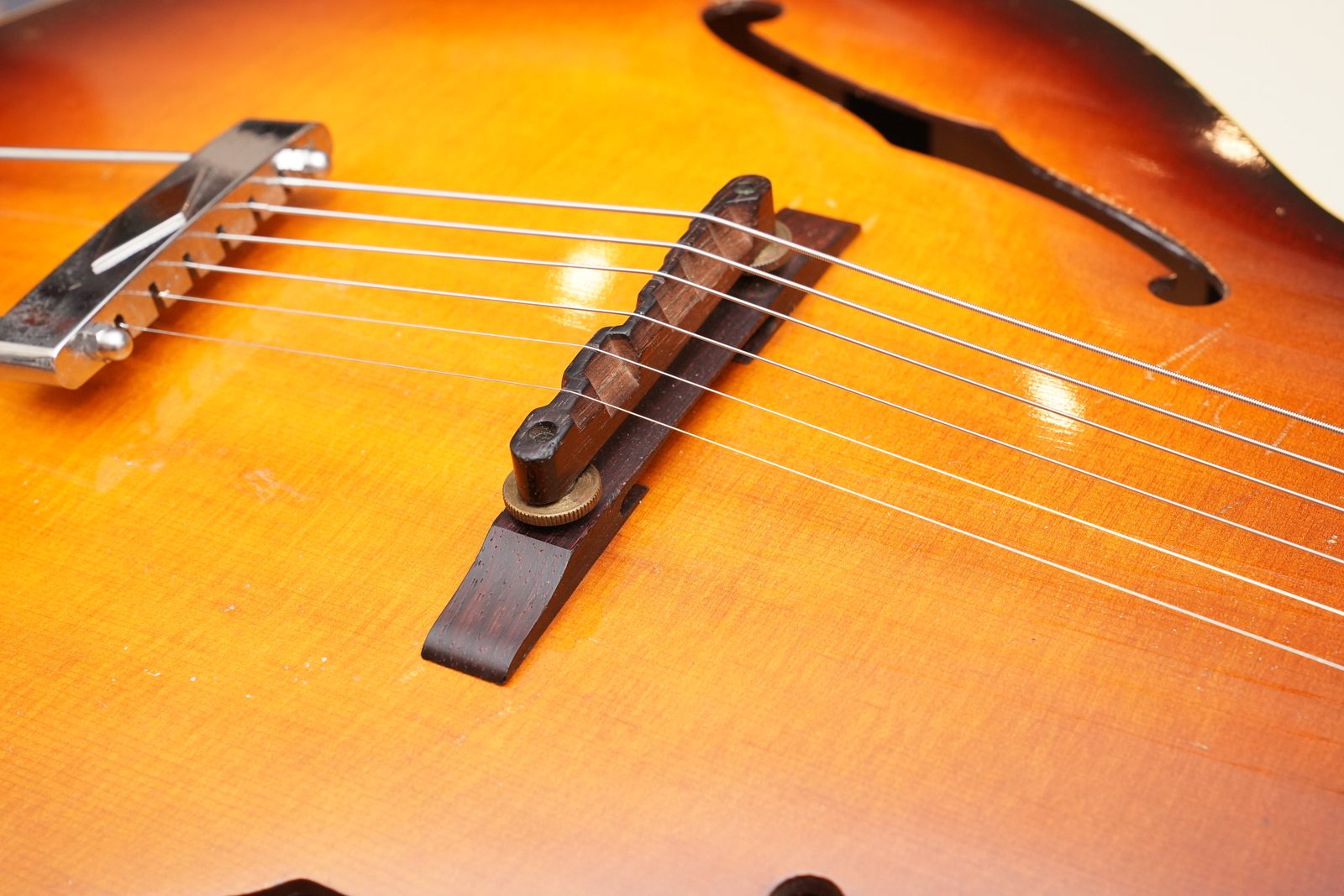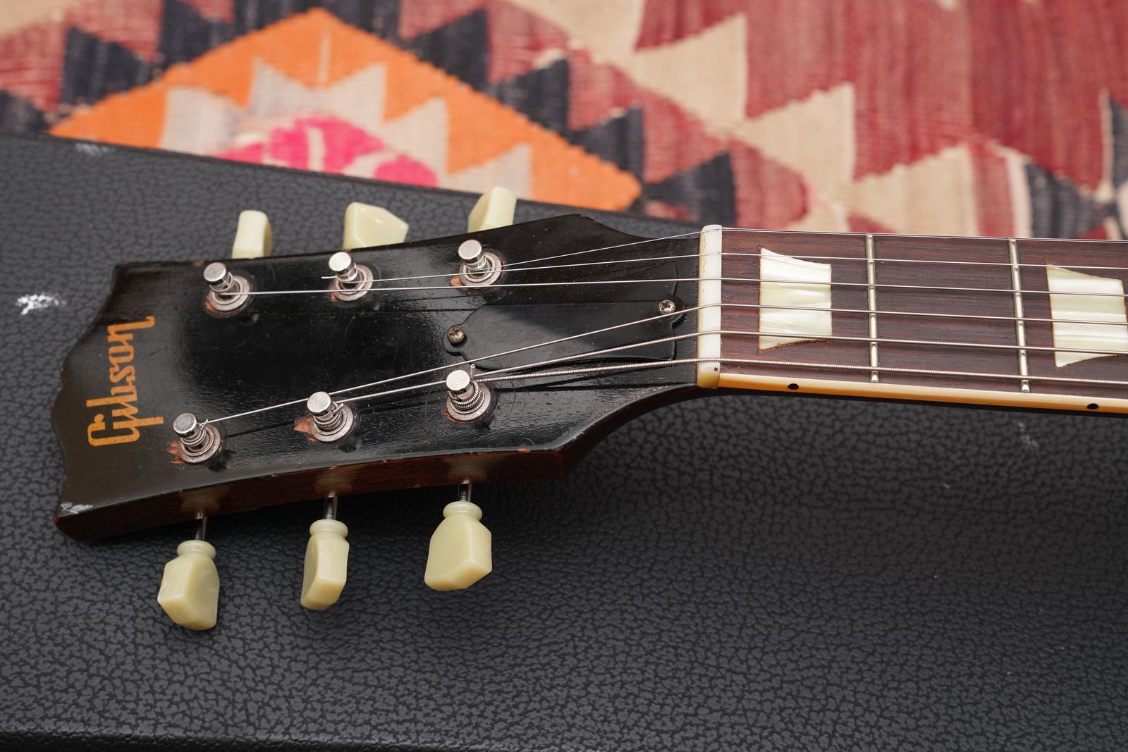 Guitar is in overall good condition with appropriate wear for its age. There are minor dings and dents in the finish as highlighted in the photos. There is a repaired split near the top bass side F-hole that has been expertly cleated on the inside and is very stable. Rosewood bridge and base are original, the nut and frets are original and do not show any major wear, nor are there major divots on the fretboard. Original pickguard and bracket are included - at some point the pickguard had a small cutout for a pickup. Tuners are modern drop-in replacements, at some point it had 70's style Schaller tuners and the extra mounting holes have been filled. Really nice feeling neck with the Les Paul style trapezoid inlays (I imagine it's as close to feeling what an actual late 50's Les Paul burst feels like as I'll ever get). Tailpiece has been replaced with a modern period-correct style diamond trapeze tailpiece. Guitar keeps tune well and sounds lovely.