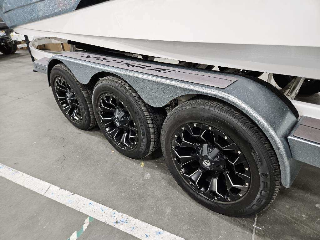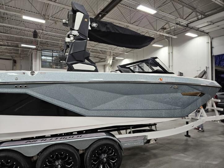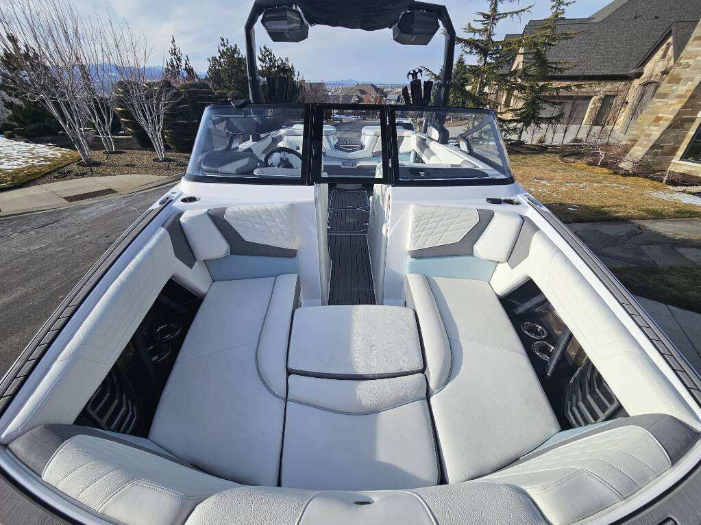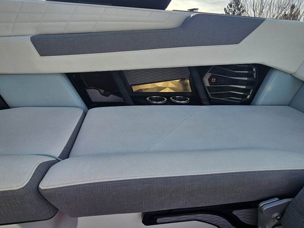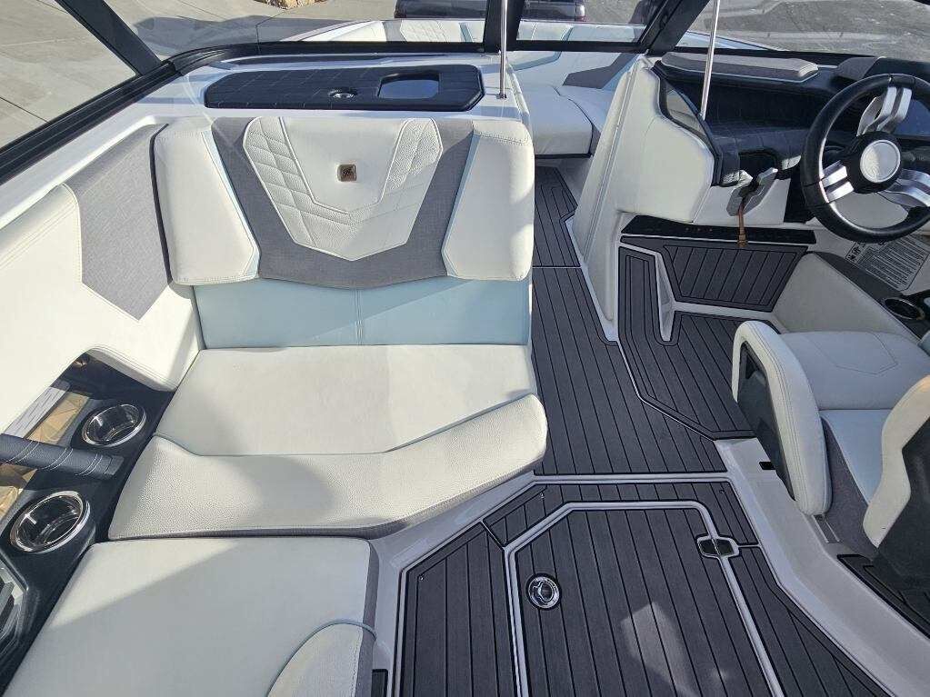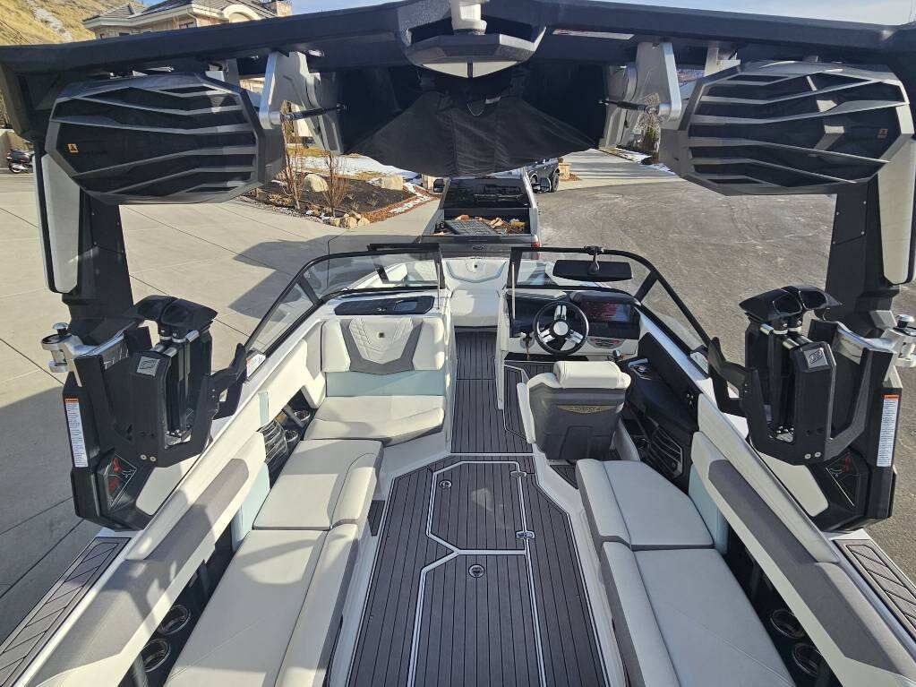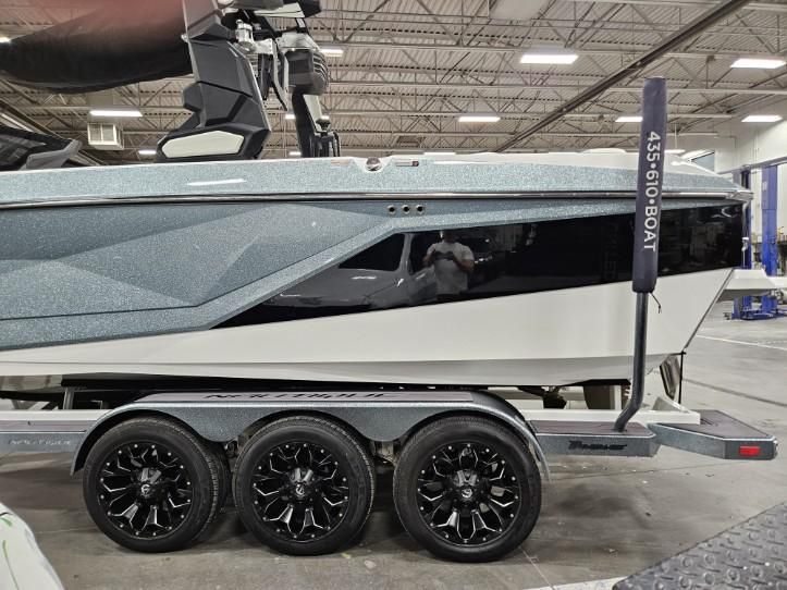 2023 Nautique G23 custom ordered with a stunning interior and premium exterior color selections. Professionally ceramic coated and maintained in excellent condition with only 135 engine hours. Powered by the ZZ8 600HP supercharged engine delivering exceptional torque, acceleration, and surf performance. Options include M6 tower speakers, WaveFront sound system, actuated Flight Control Tower, tower-mounted Bimini with surf pockets, strapless board racks, 1,450 lbs supplemental ballast, underwater lights, courtesy lighting package, platform ladder, platform and towable/mooring covers, Phender Pro attachment system, leather spoke steering wheel, and bow filler cushion. Rests on a two-tone triple axle trailer with 18” wheels w/spare.