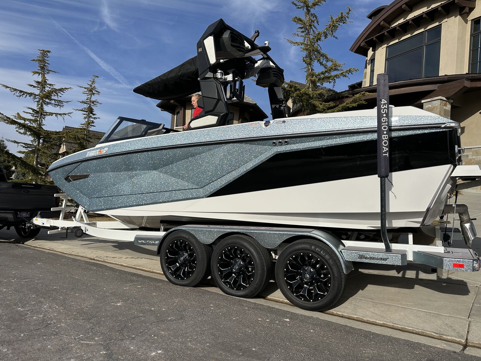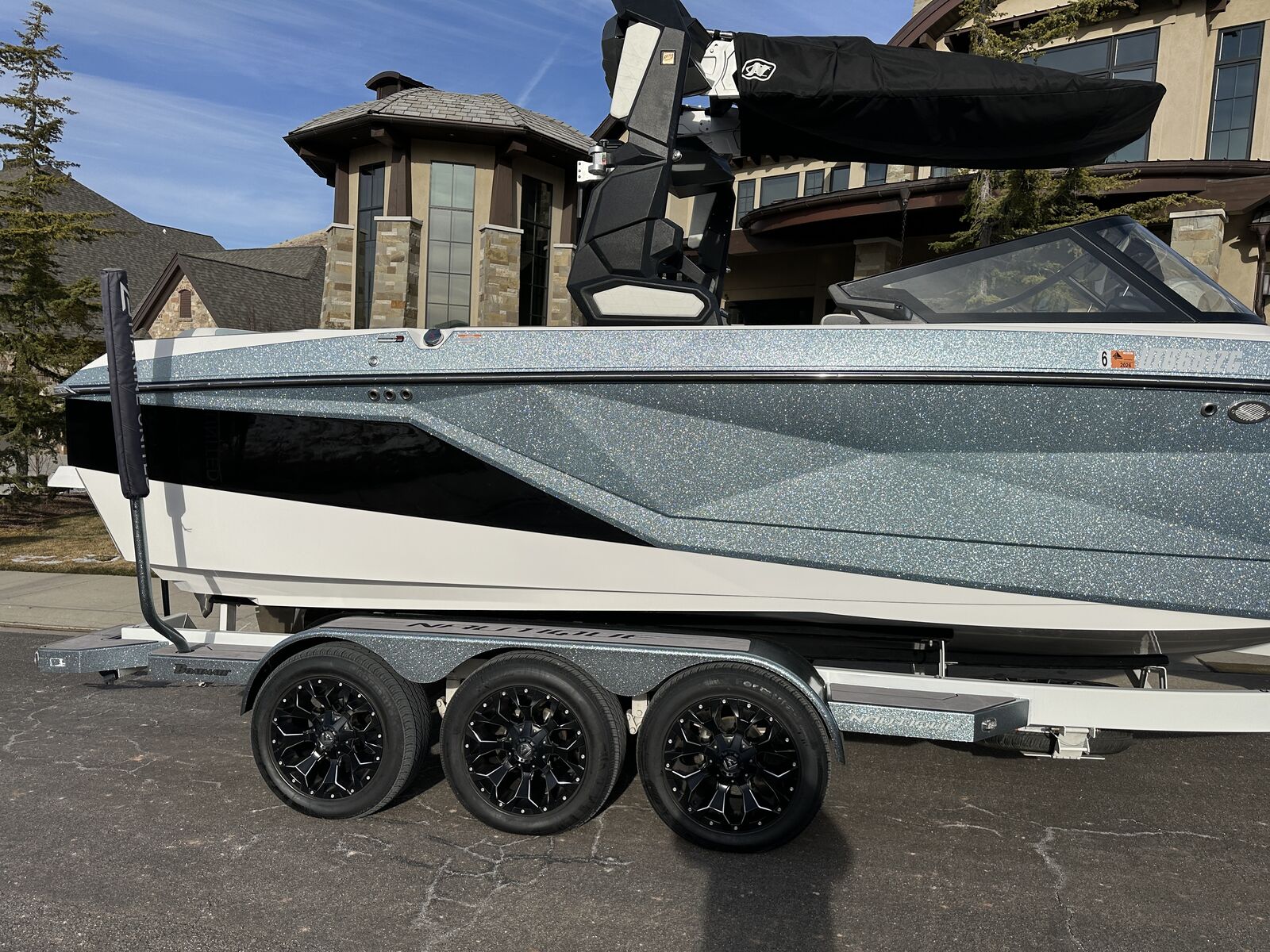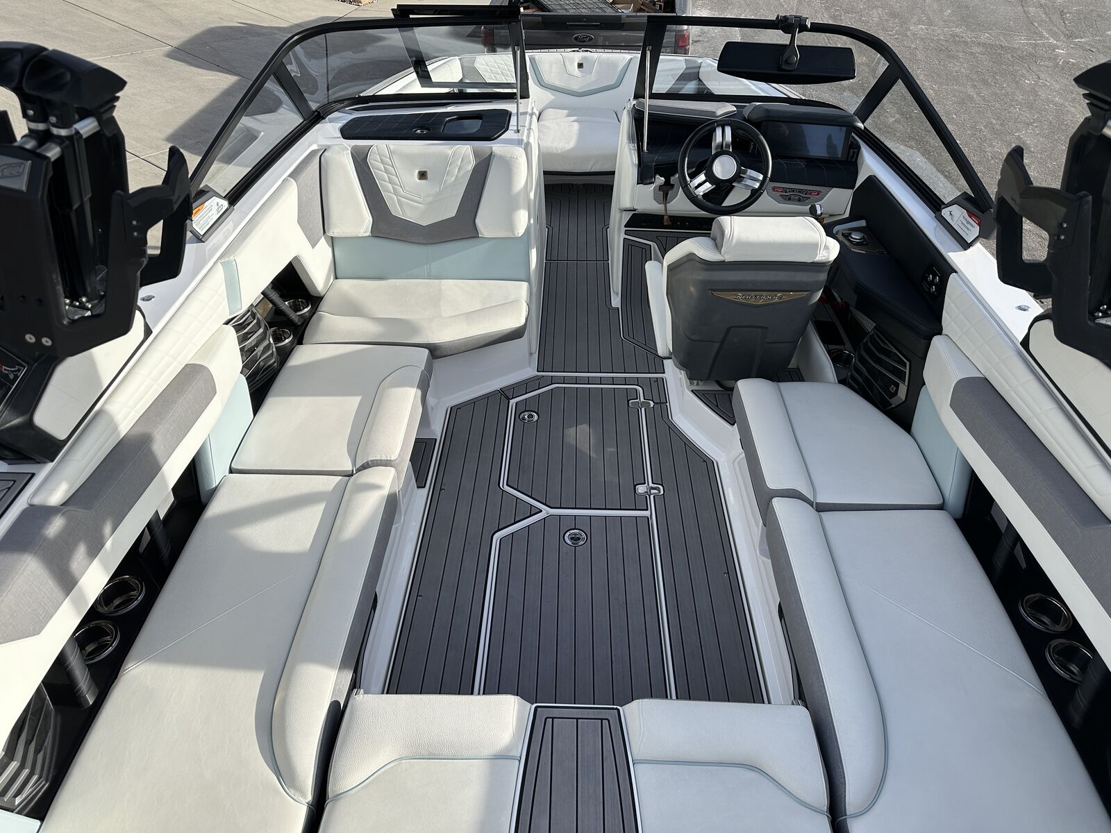 2023 Nautique G23 custom ordered with a stunning interior and premium exterior color selections. Professionally ceramic coated and maintained in excellent condition with only 135 engine hours. Powered by the ZZ8 600HP supercharged engine delivering exceptional torque, acceleration, and surf performance. Options include M6 tower speakers, WaveFront sound system, actuated Flight Control Tower, tower-mounted Bimini with surf pockets, strapless board racks, 1,450 lbs supplemental ballast, underwater lights, courtesy lighting package, platform ladder, platform and towable/mooring covers, Phender Pro attachment system, leather spoke steering wheel, and bow filler cushion. Rests on a two-tone triple axle trailer with 18” wheels w/spare.