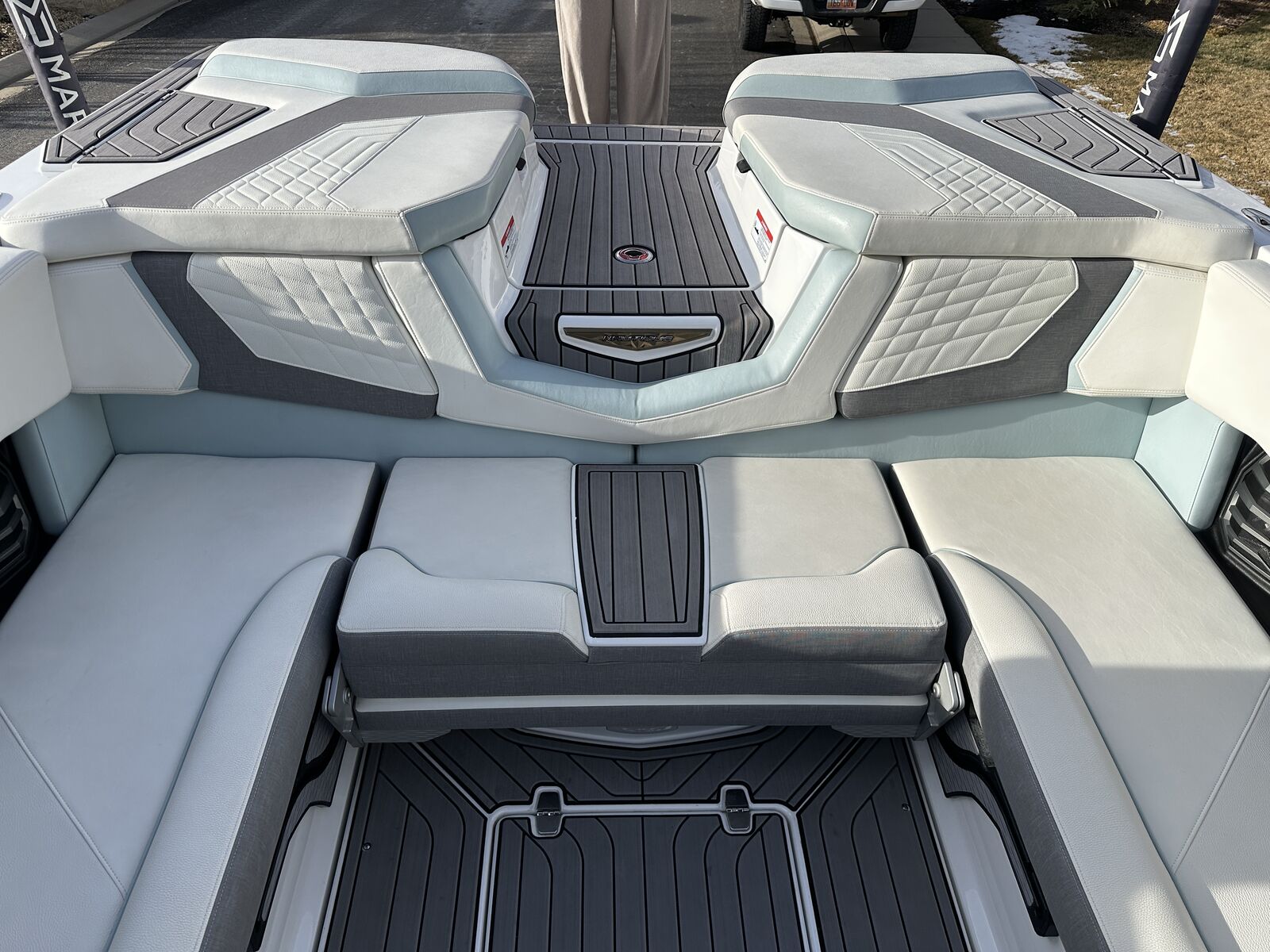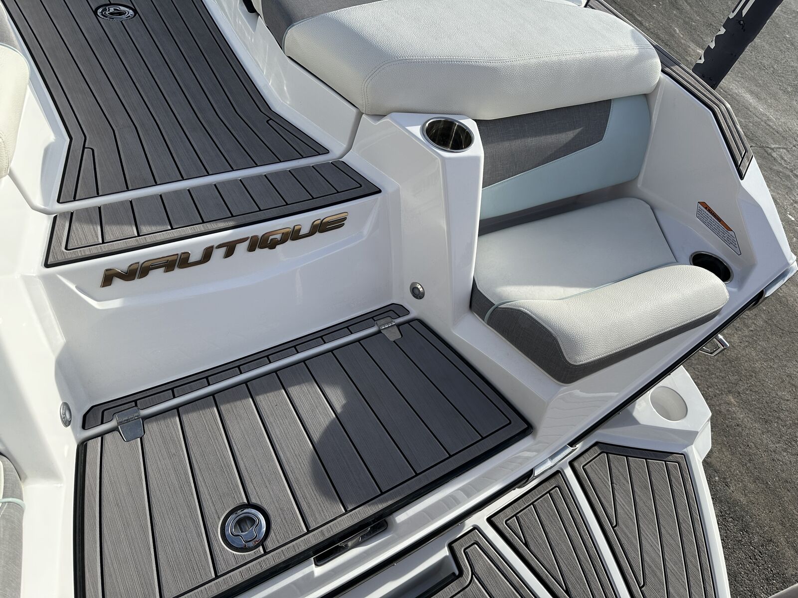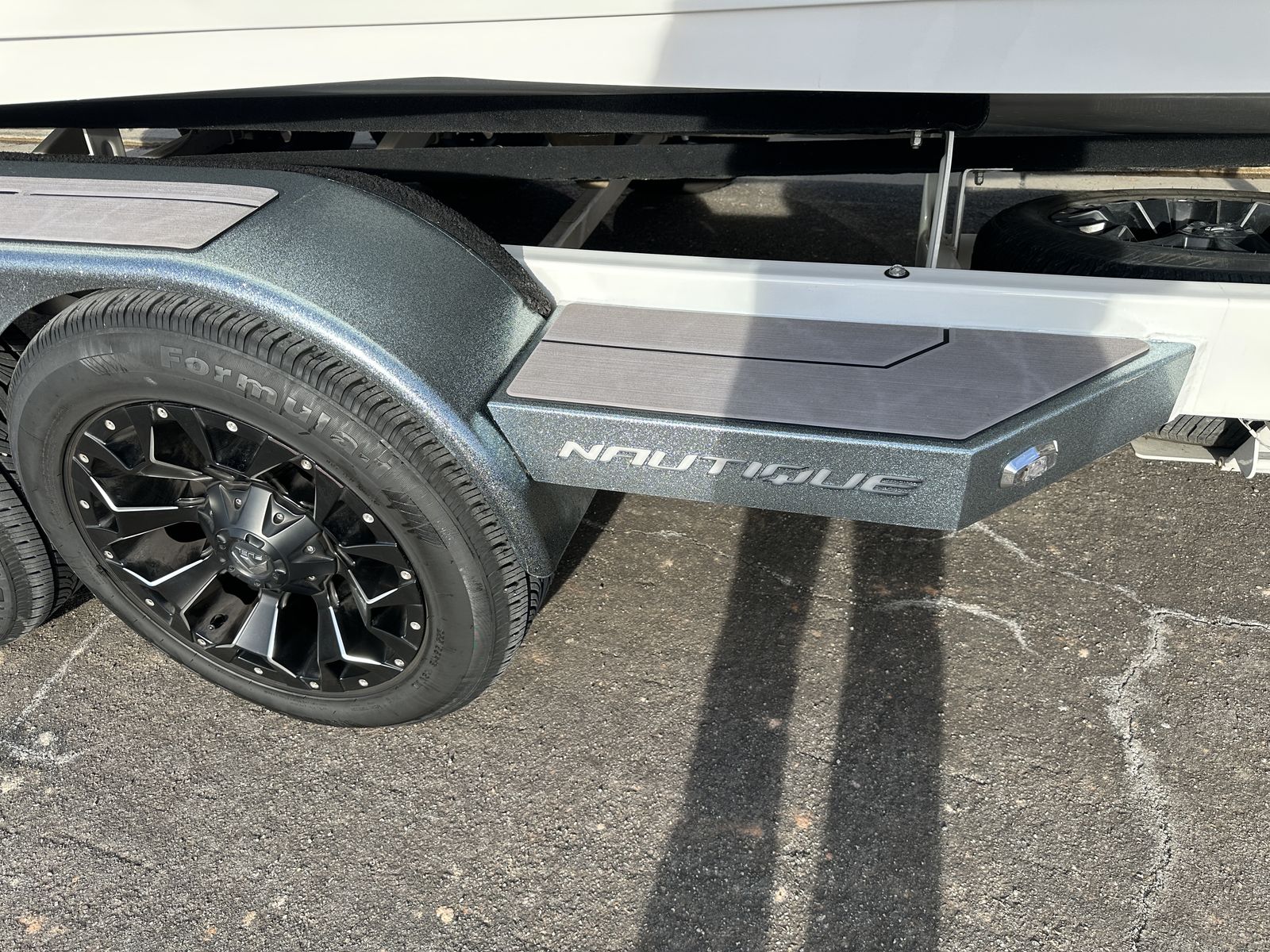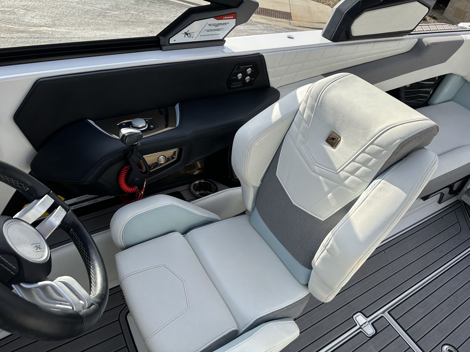 2023 Nautique G23 custom ordered with a stunning interior and premium exterior color selections. Professionally ceramic coated and maintained in excellent condition with only 135 engine hours. Powered by the ZZ8 600HP supercharged engine delivering exceptional torque, acceleration, and surf performance. Options include M6 tower speakers, WaveFront sound system, actuated Flight Control Tower, tower-mounted Bimini with surf pockets, strapless board racks, 1,450 lbs supplemental ballast, underwater lights, courtesy lighting package, platform ladder, platform and towable/mooring covers, Phender Pro attachment system, leather spoke steering wheel, and bow filler cushion. Rests on a two-tone triple axle trailer with 18” wheels w/spare.
