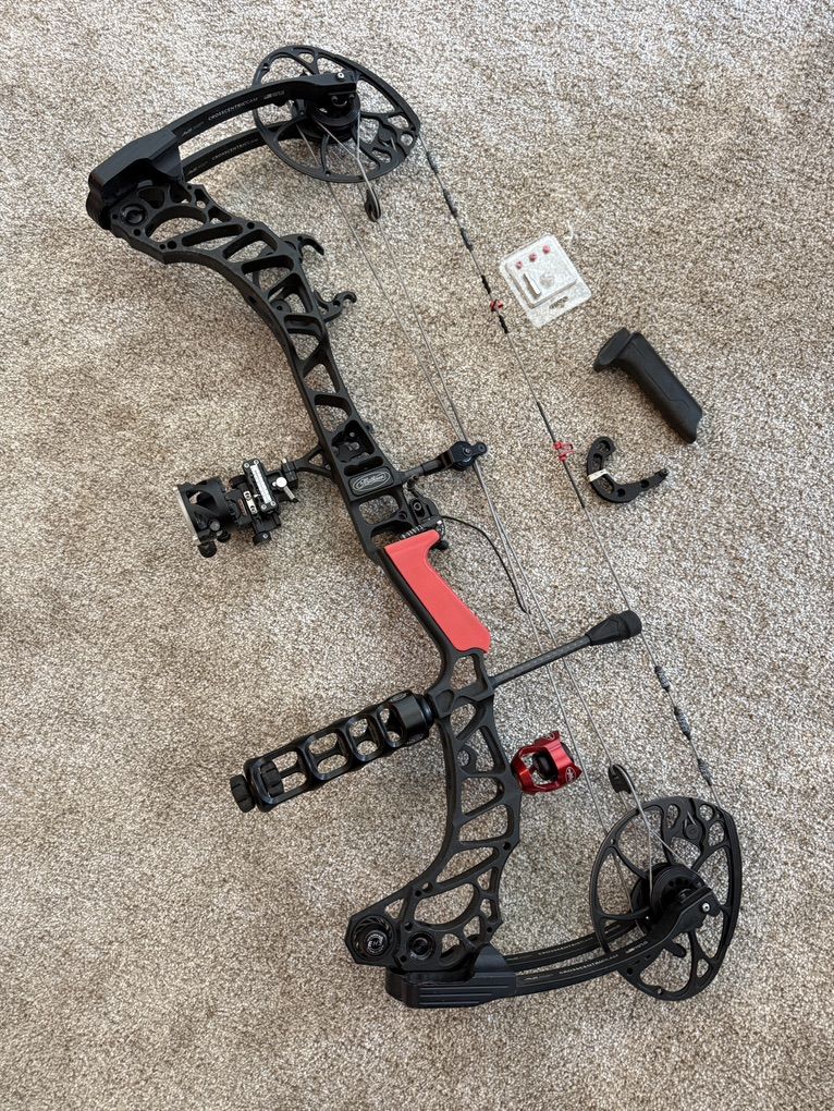Ready to shoot! Willing to look at trades for a 32”+ bow. Has a Mathews QAD rest, Trophy Ridge React single pin that is sighted and taped for the 75# and 29” setting. Comes with original grip, 70# mods, and aperture kit for the peep. Quiver bracket not included. New strings 1.5yrs ago. If you have any ?’s feel free to reach out. Thx!
