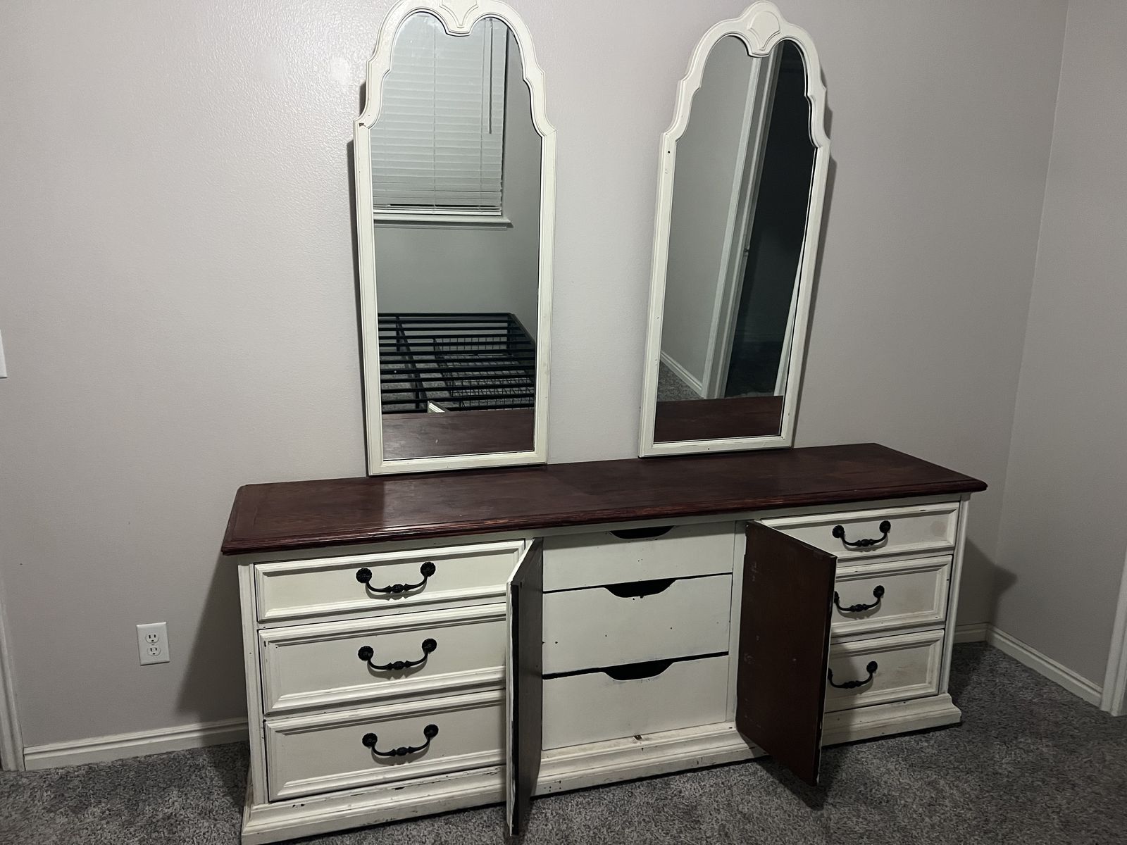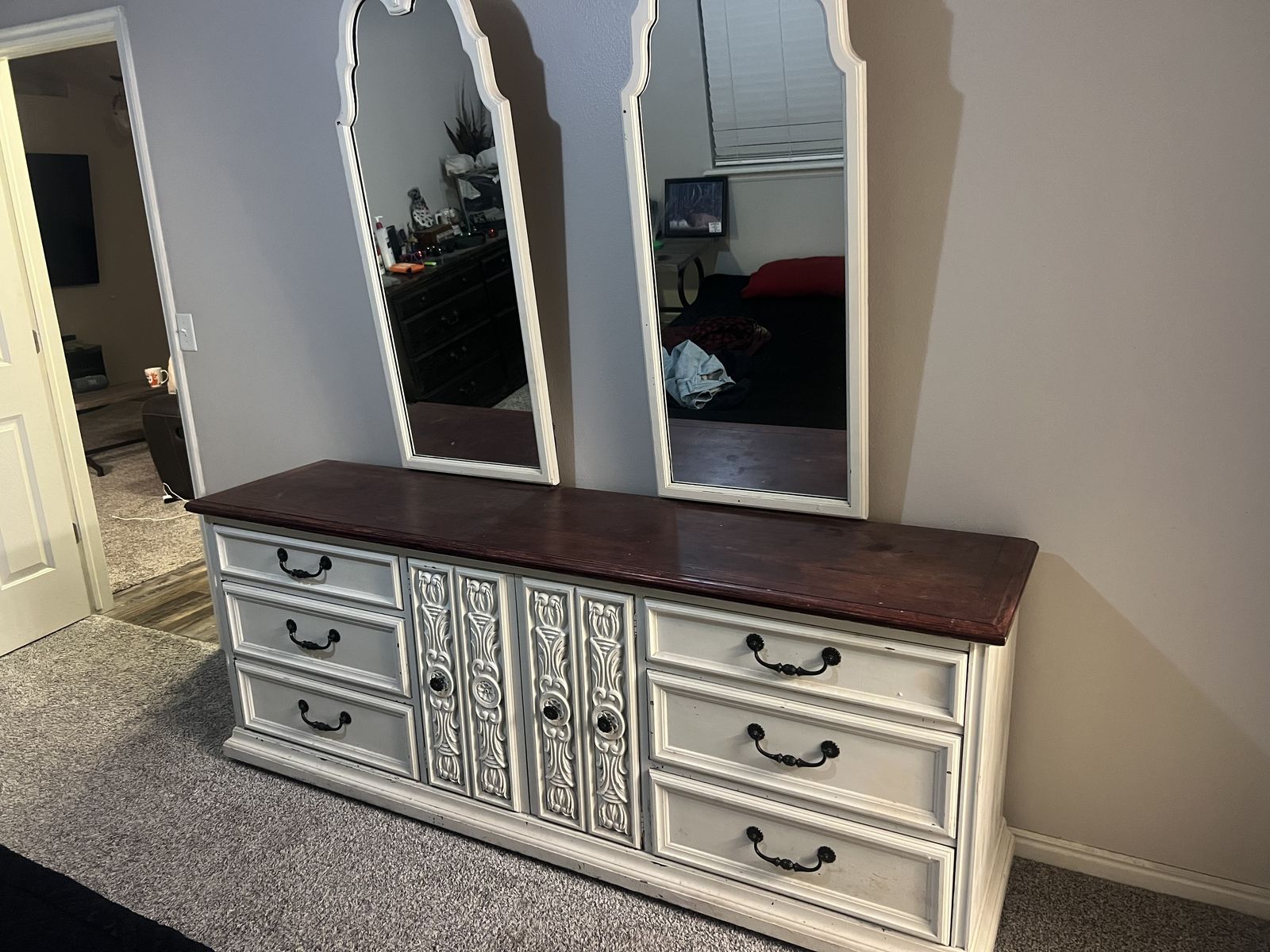 Double mirror 9 drawer. It’s old but solid! It’s not your ikea garbage. It is missing a nob. But who doesn’t like a reason to go to hobby lobby lol. It could also use a fresh coat of paint asking $200.00 obo