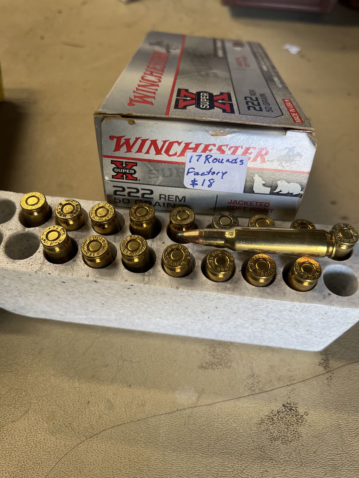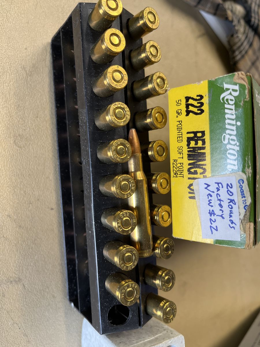 60 new Winchester 222 brass. 20 once fired Remington. $40-10%=$36.00. Box of 20, 50 gr factory Remington loads. $22-10%=$20. Box with 17 factory Winchester 50 gr loads. $18-10%=$16. $70 for all brass and ammo. I will ship brass but no ammo for postage costs. Please see my other ads. Thanks. Joe.