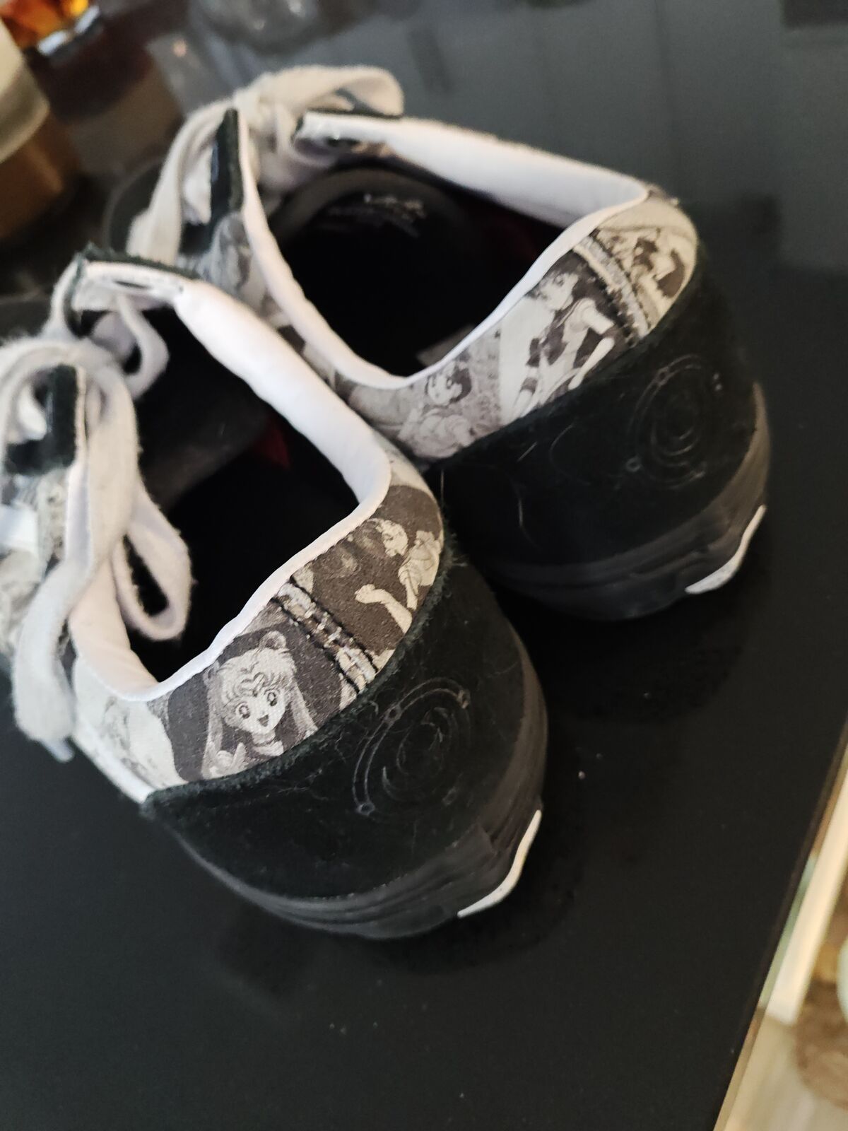 Features black suede overlays on the toe and heel, while the side canvas panels display a monochromatic, black-and-white collage of the Sailor Moon characters.