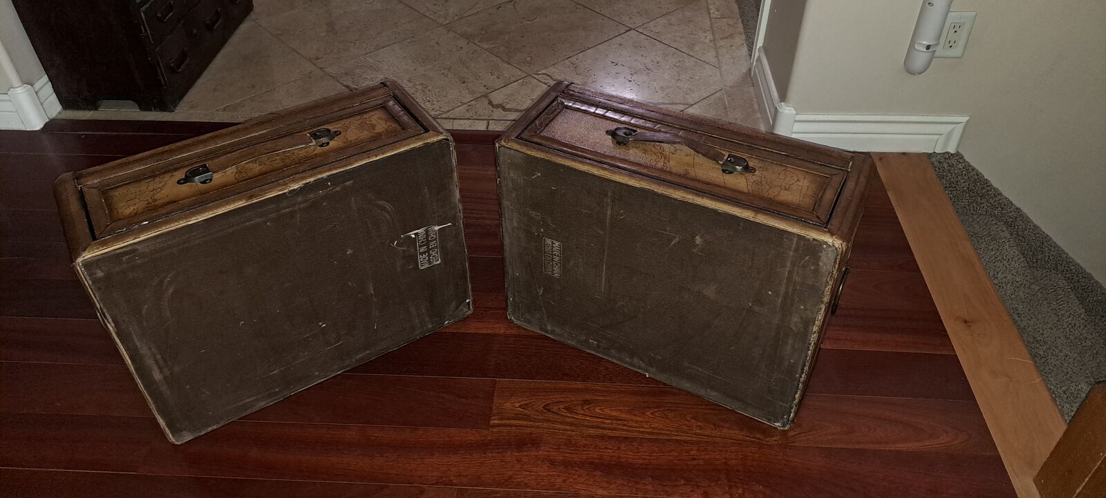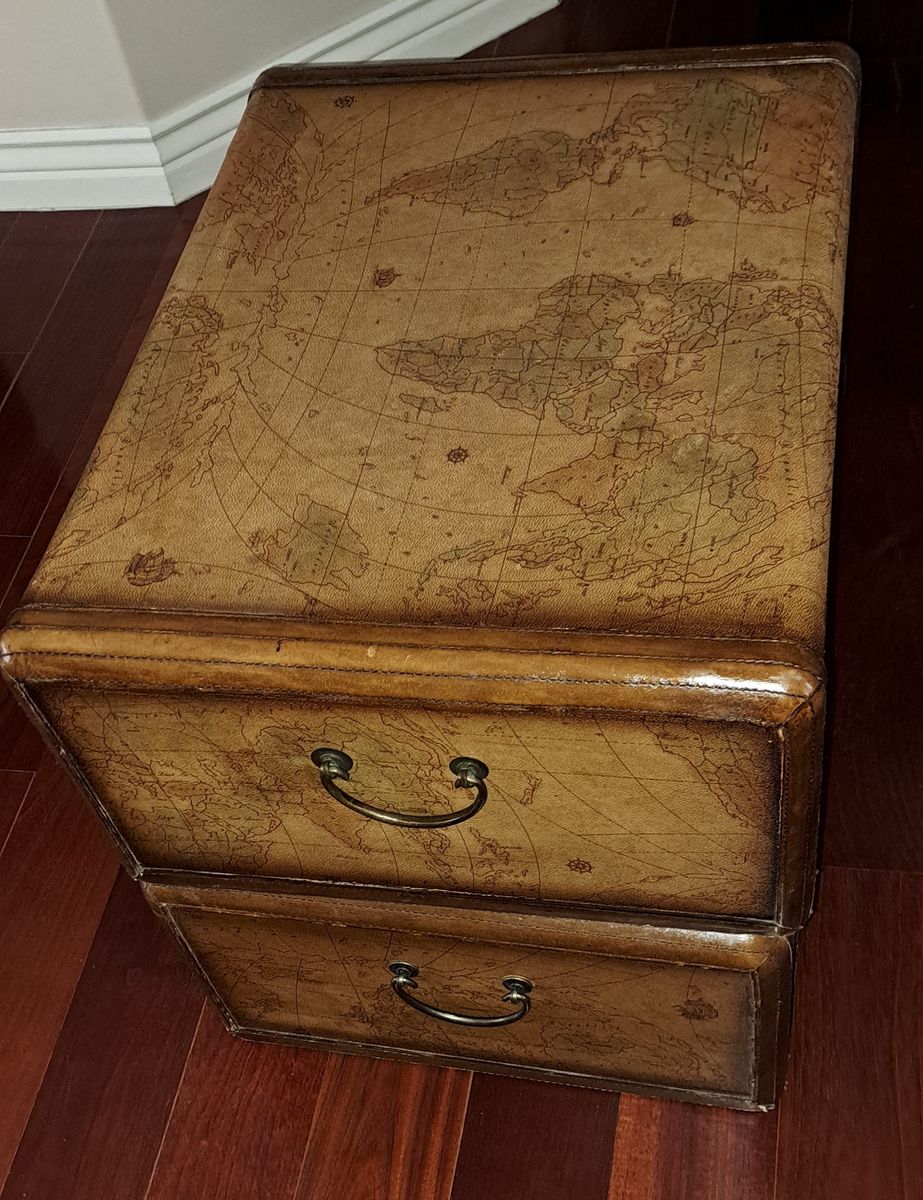 Elegant pair of leather-clad campaign-style drawer chests featuring a classic antique world map motif.