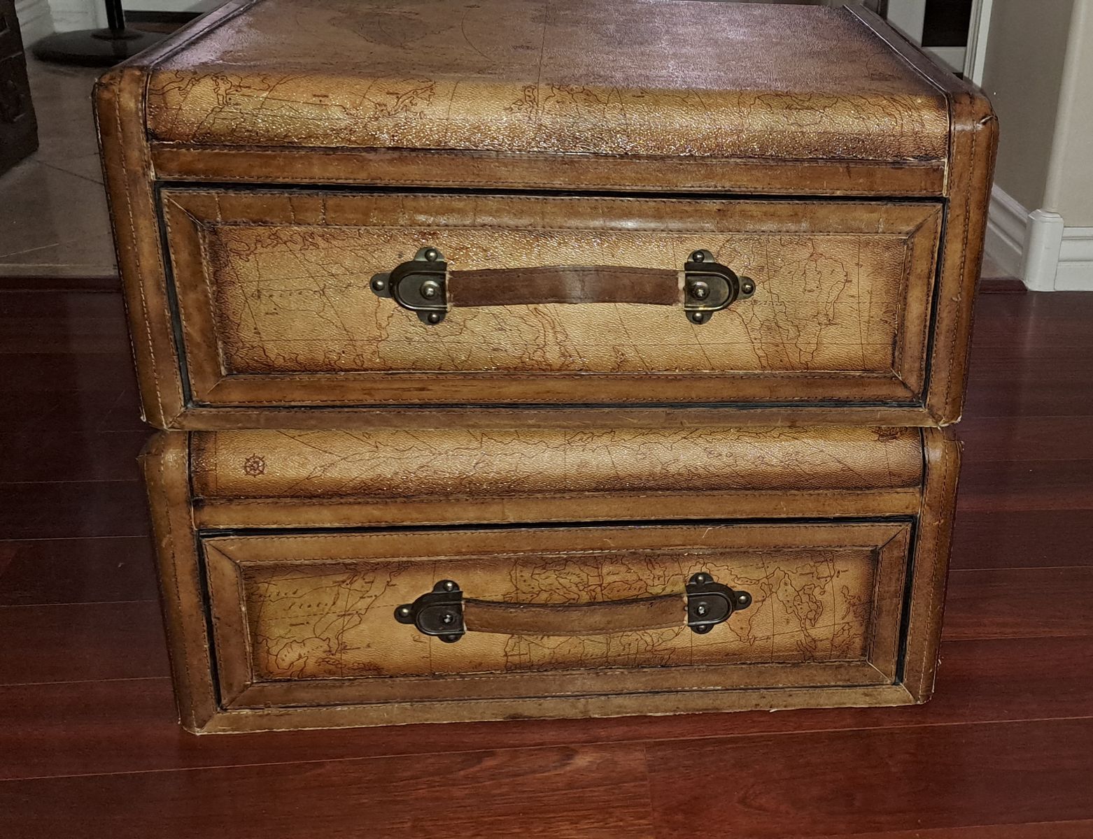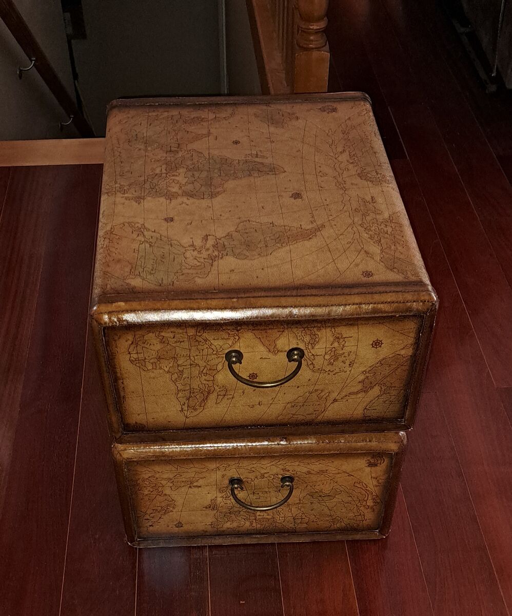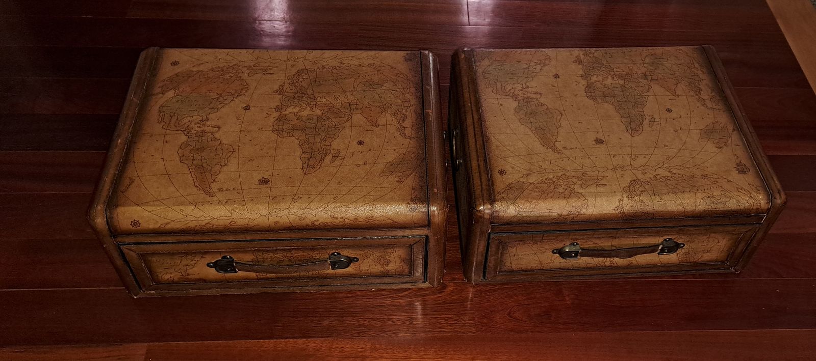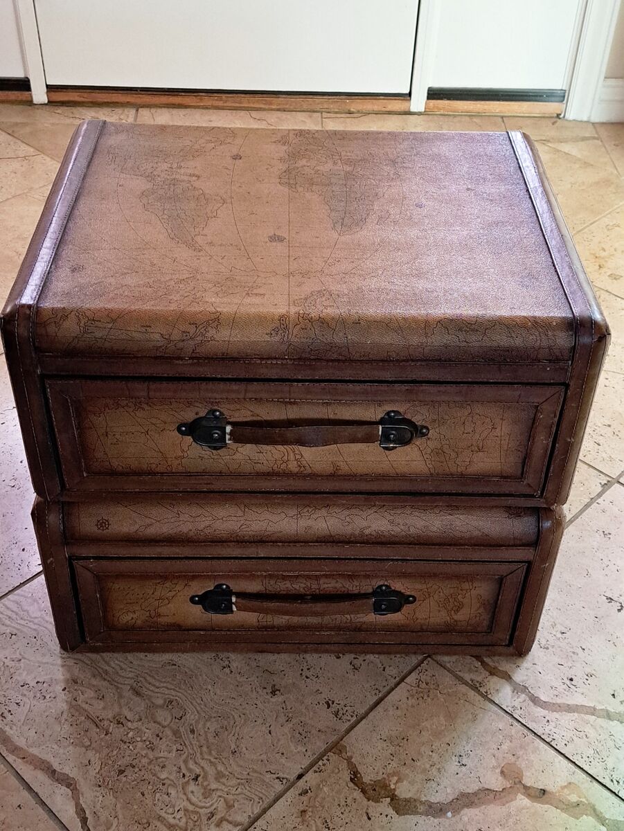 Each chest is wrapped in embossed leather panels with stitched trim and rich brown edging, giving the appearance of vintage travel trunks. The tops display a detailed old-world globe map design, while the drawers are fitted with substantial brass-toned hardware and leather strap pulls.