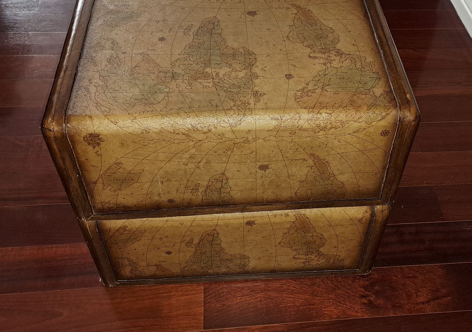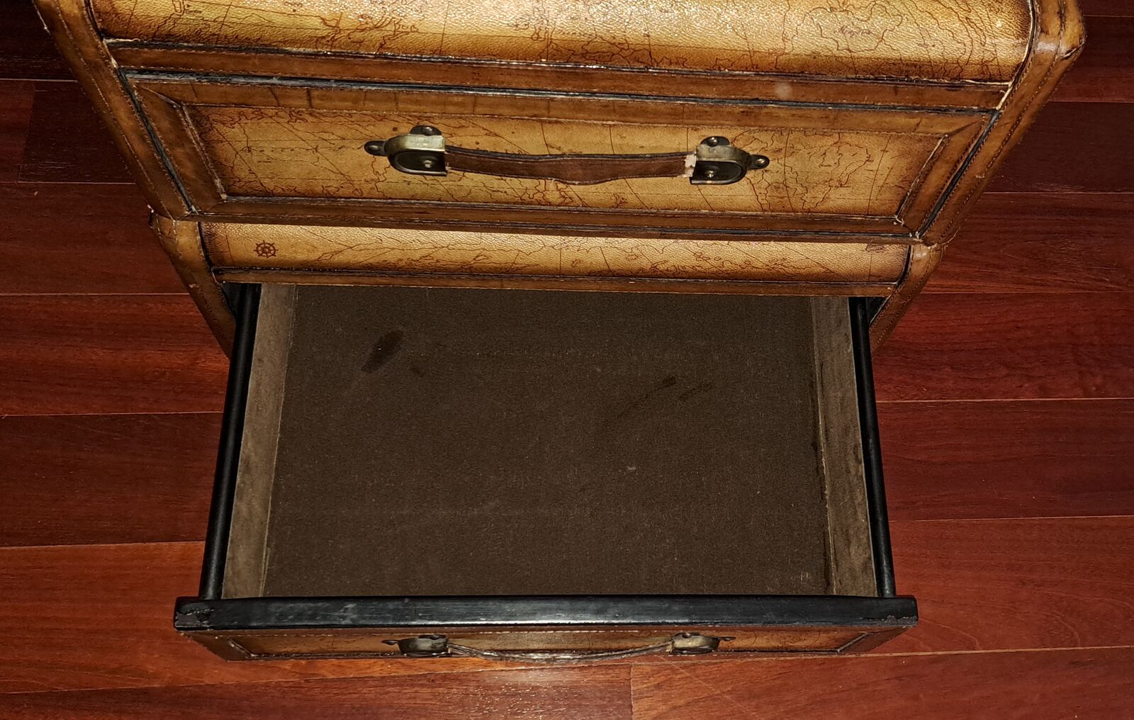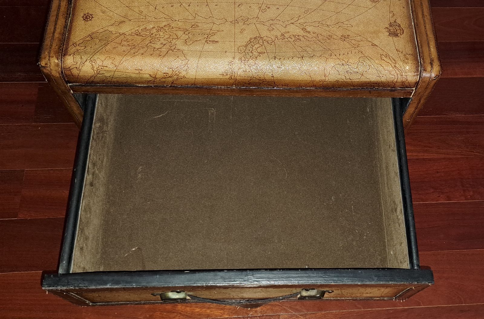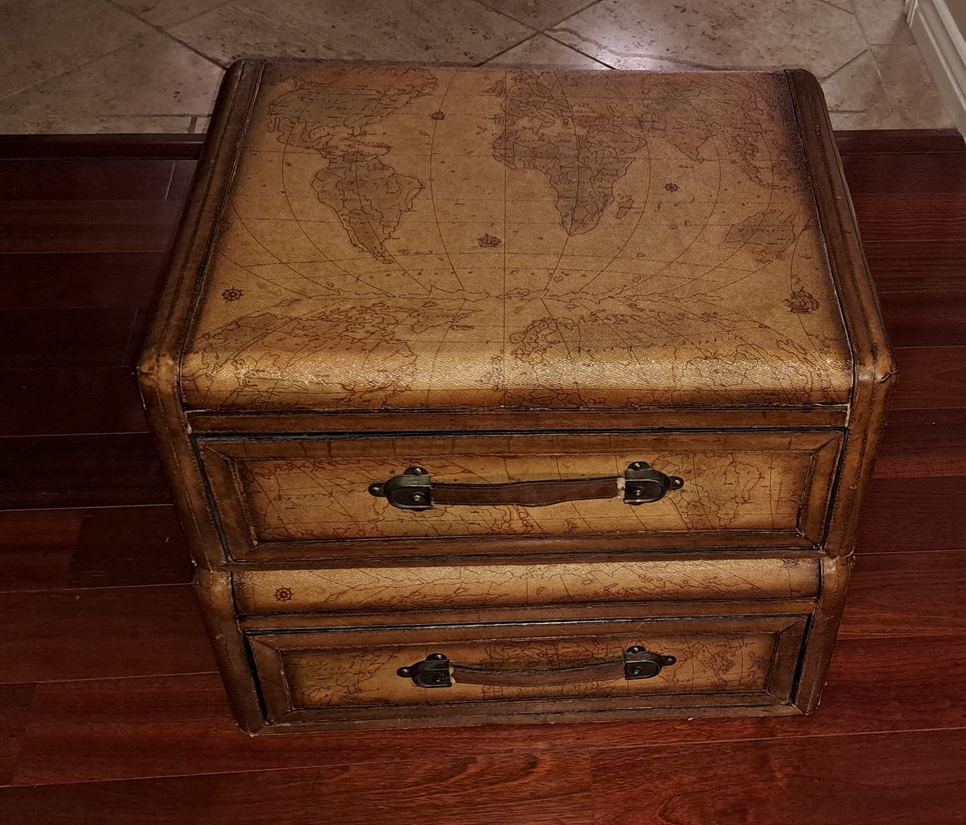 Each chest is wrapped in embossed leather panels with stitched trim and rich brown edging, giving the appearance of vintage travel trunks. The tops display a detailed old-world globe map design, while the drawers are fitted with substantial brass-toned hardware and leather strap pulls.