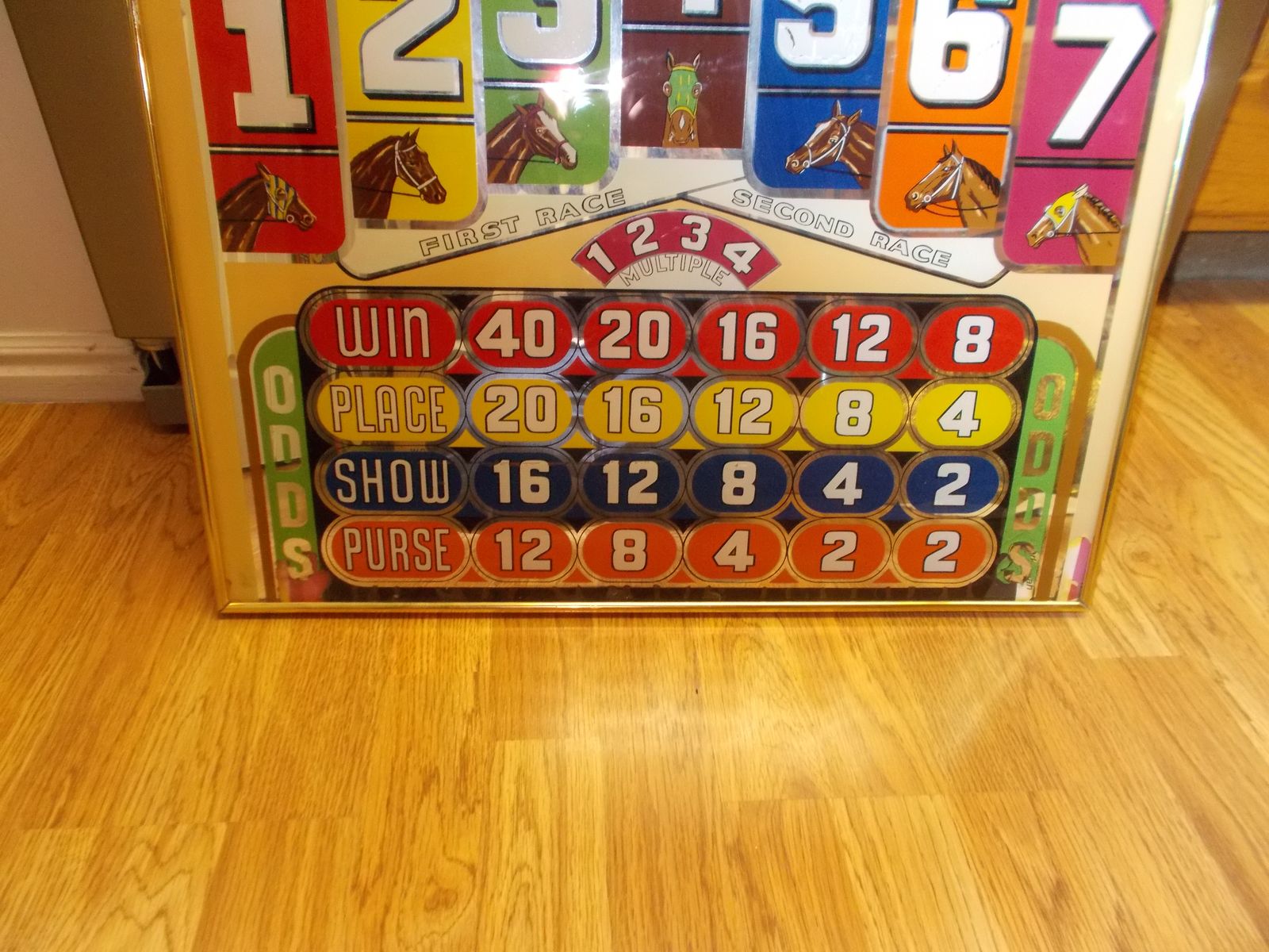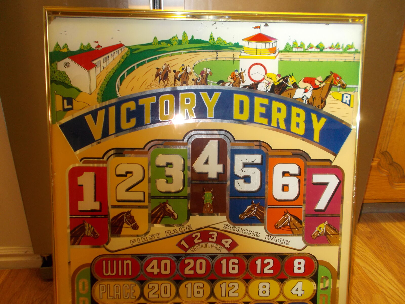 This is a rare 1946 Victory Derby Pinball bac glass, it is in excellent condition, it has a hanger on the back so if you wanted to you could hang it on your wall. Great vintage collectors piece. If interested please phone 801-823-7198 and ask for Laura. Thanks