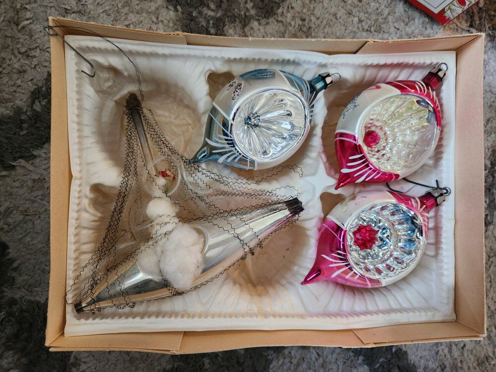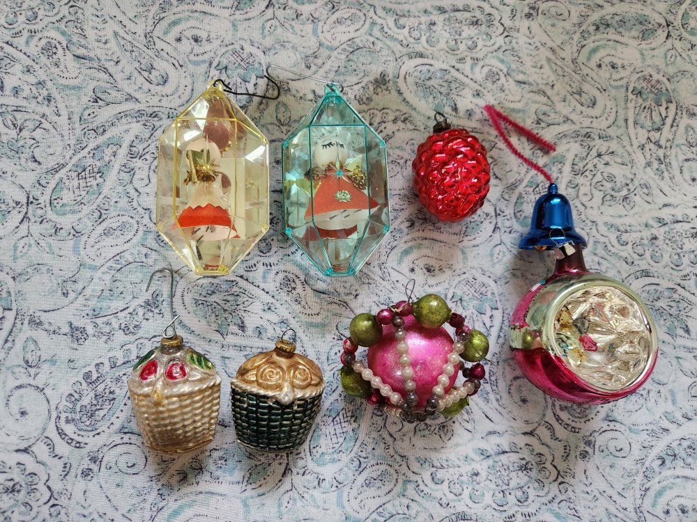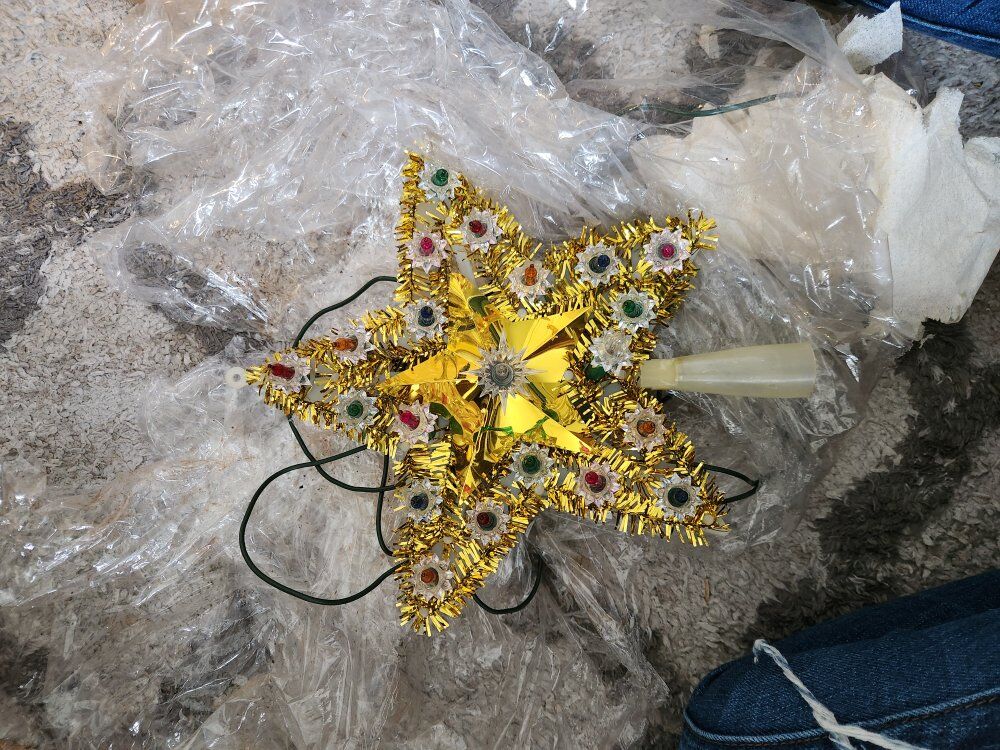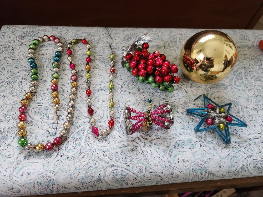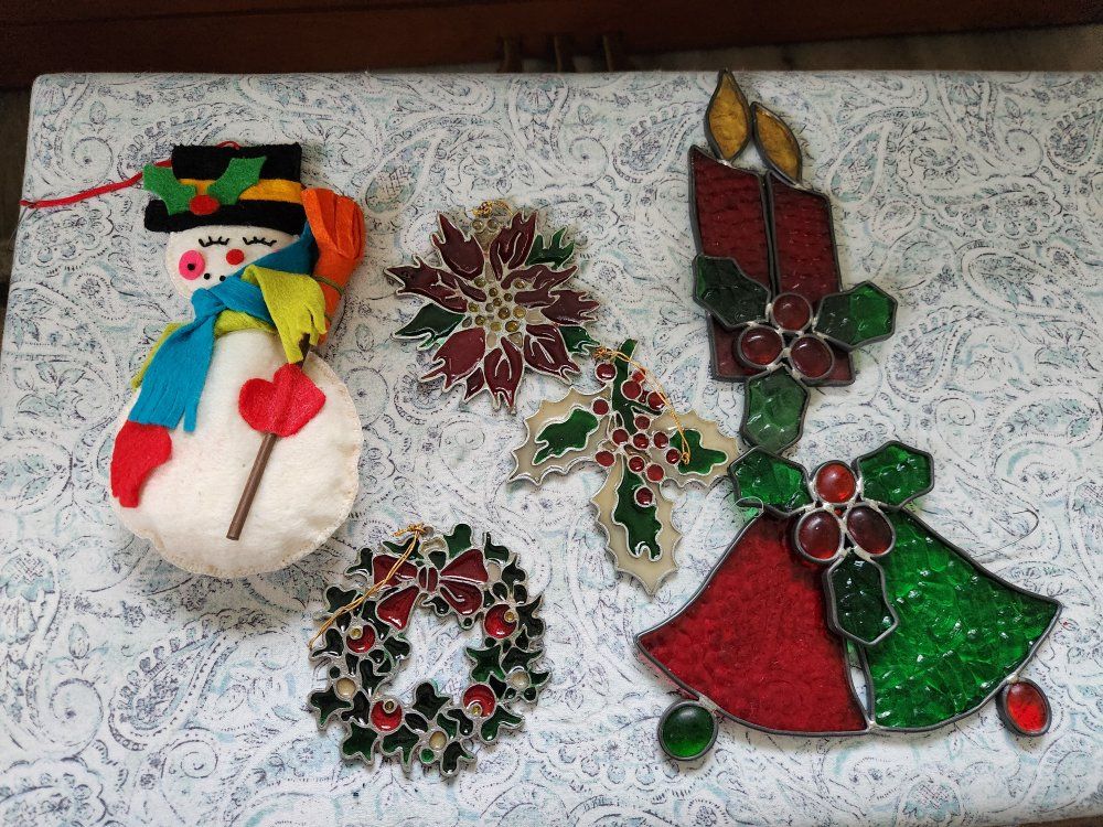 Box of Vintage Ornaments, tree topper, and stained glass christmas decor. 50.00 for everything