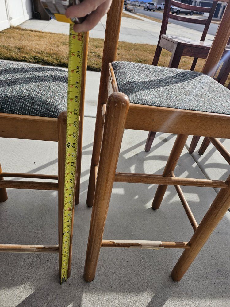 3 bar stools 2 are a little shorter then the 3ed but they are a matched set. the short ones are 26 inch high at the seat. the tall one is just under 30 inches at the seat. minimal wear as is