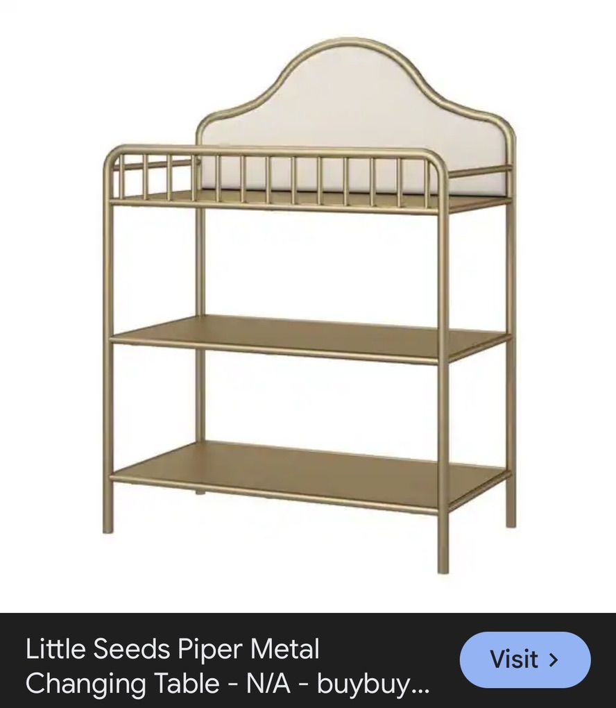Changing table features the same metal frame and upholstered finish with two open shelves. Standard changing pad included. Dimensions approximately 47.25” H x 34.19” W x 19.13” D