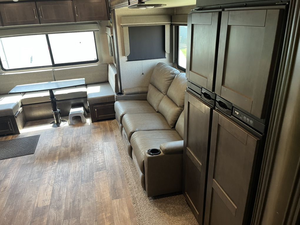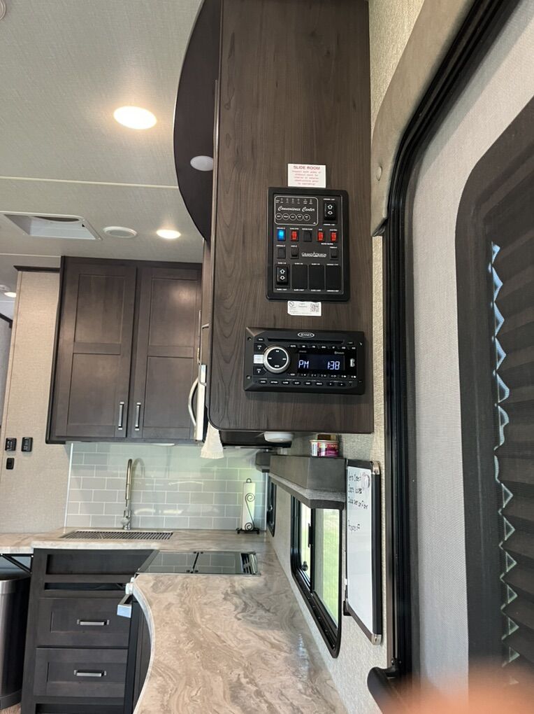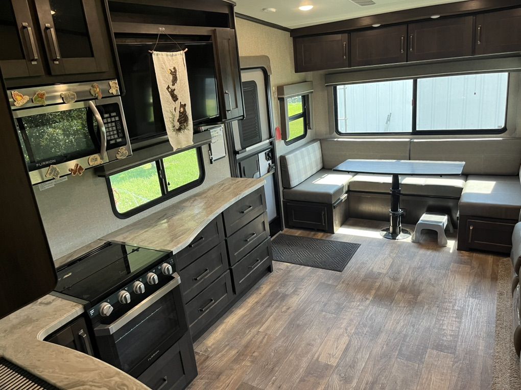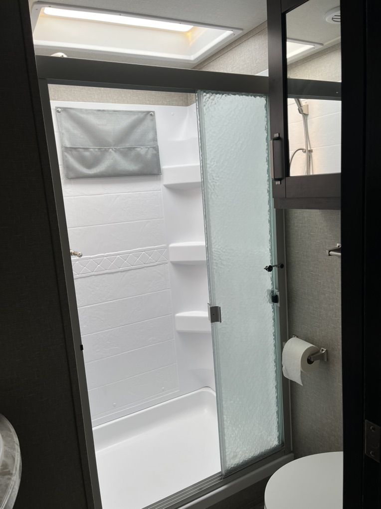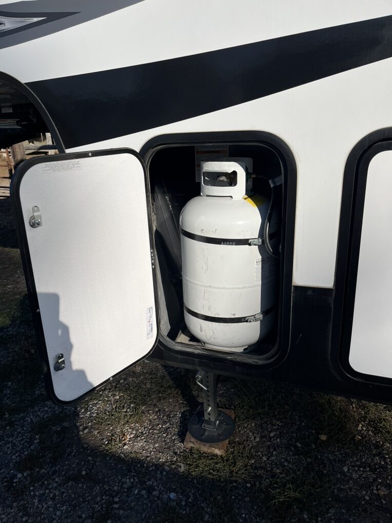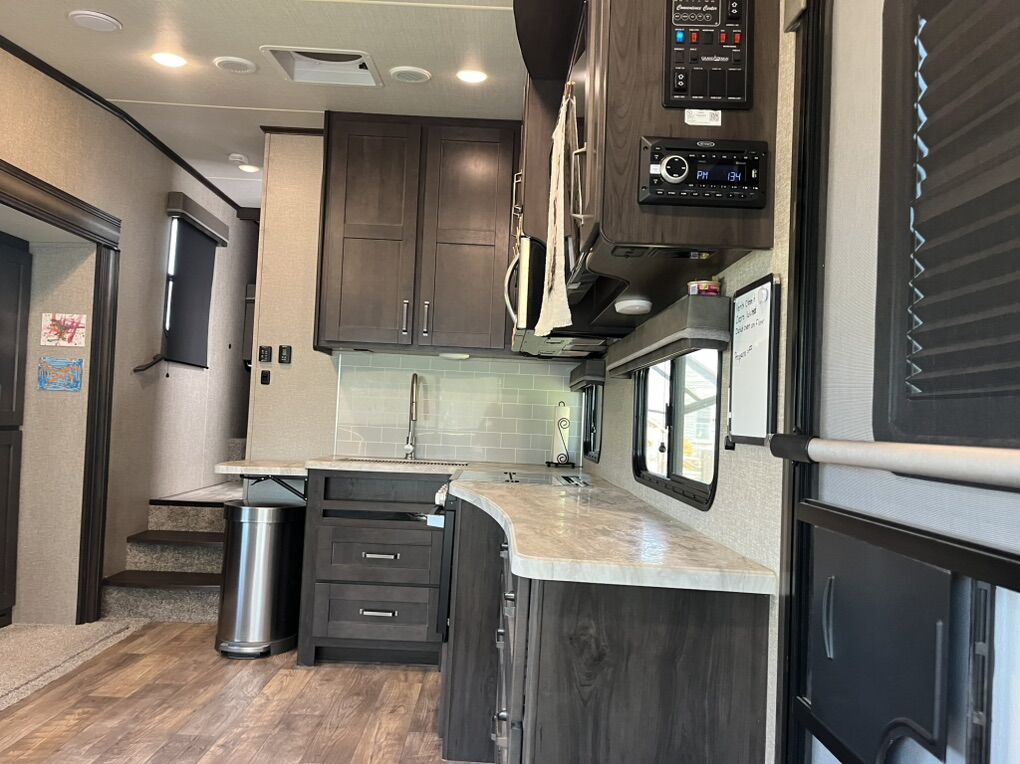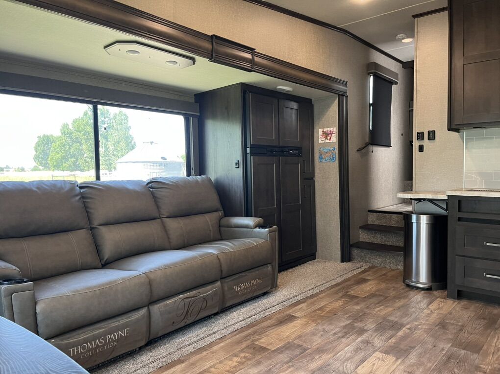 This elegant fifth wheel is prepared to accompany you to your preferred destinations whenever you are ready to travel. It features an open floor plan with Thomas Pane recliners situated in the slide-out, facing a 36-inch Roku TV for optimal comfort and entertainment. The L-shaped kitchen, located on the camp side of the trailer, offers generous counter space and ample cabinetry, as well as a large sink and microwave for convenience. At the rear of the trailer, a U-shaped table serves both as a dining area and can be converted into a bed for guests. The front bedroom includes a spacious closet and drawers for personal storage. Adjacent to the bedroom, the bathroom contains all essential amenities and is equipped with a sliding door to maximize usable space; the bedroom also features a sliding door for added privacy. Additional highlights include a full-length awning over the camp side with outdoor speakers, extensive pass-through. front panel storage, and an automatic leveling system with hitch height return for ease of setup. The package comes complete with an Anderson hitch, designed for simple installation and operation. The wheel bearings and tires were replaced for 2025. Solar panels and 6-volt batteries make off-grid stays simple. Specs: Residential microwave 12 CU Frig 30 foot tip to tail Considered half ton towable GUW 7700 50 amp service AC All Season Package with tank heaters Fresh water 60 gallon Gray water 71 gallon Black water 40 gallon 2-30 lbs propane tanks