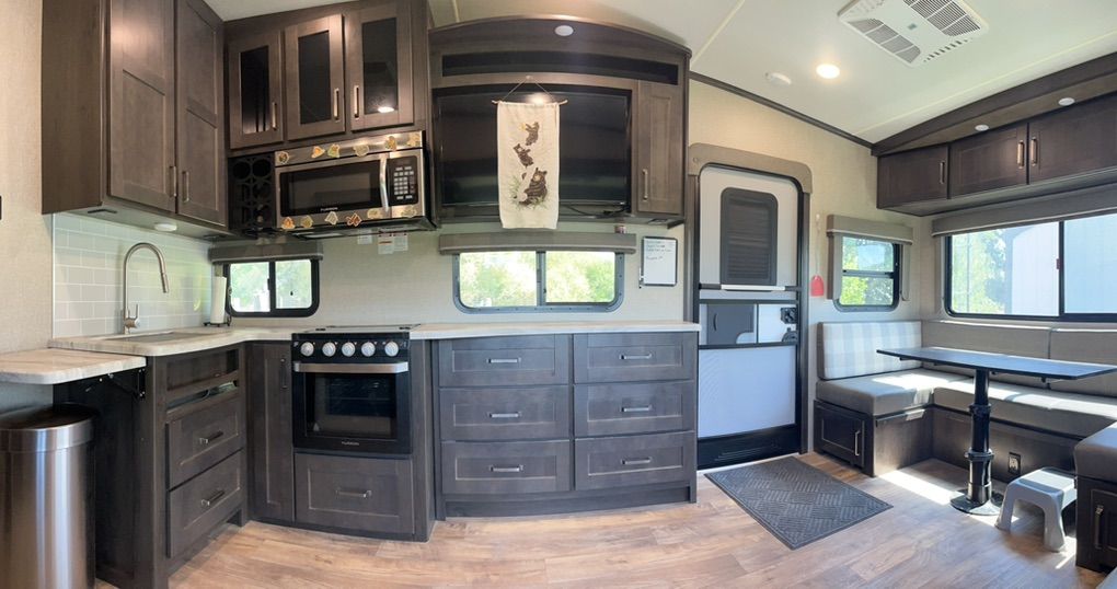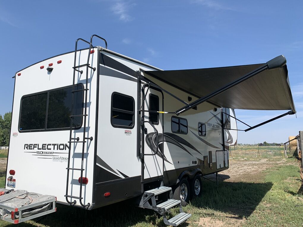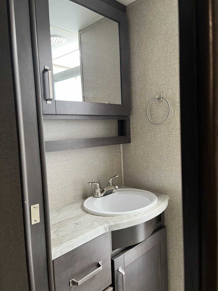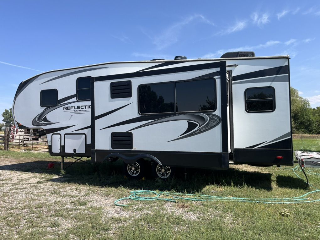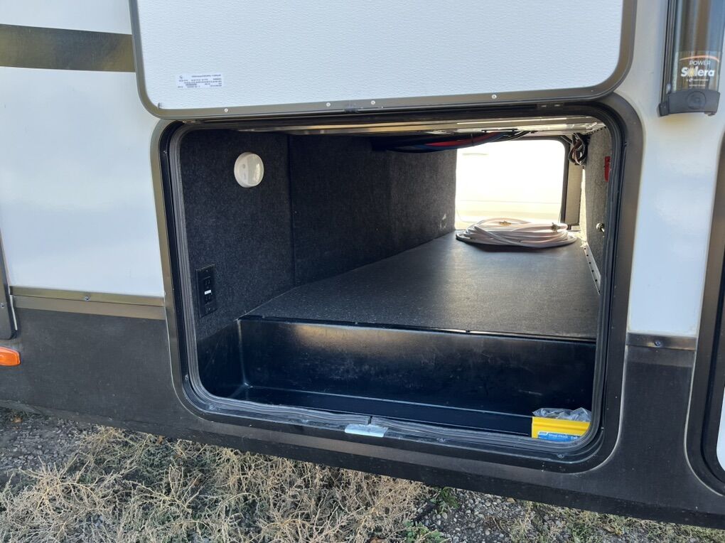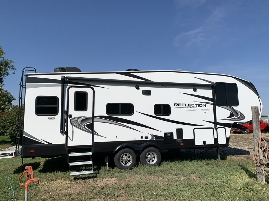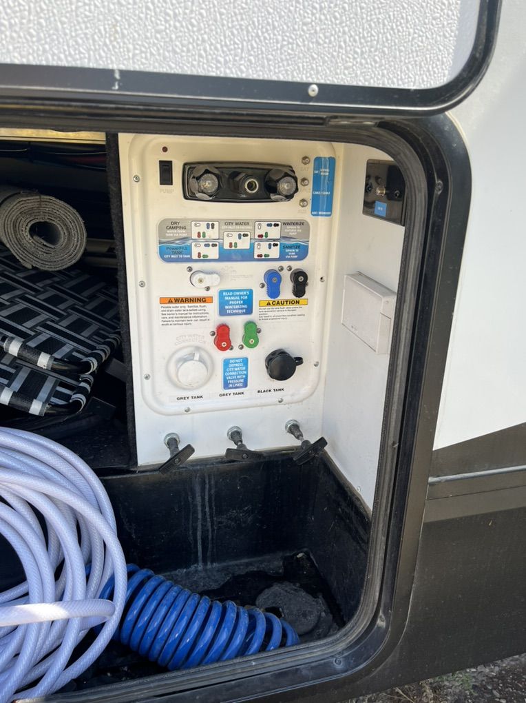 This elegant fifth wheel is prepared to accompany you to your preferred destinations whenever you are ready to travel. It features an open floor plan with Thomas Pane recliners situated in the slide-out, facing a 36-inch Roku TV for optimal comfort and entertainment. The L-shaped kitchen, located on the camp side of the trailer, offers generous counter space and ample cabinetry, as well as a large sink and microwave for convenience. At the rear of the trailer, a U-shaped table serves both as a dining area and can be converted into a bed for guests. The front bedroom includes a spacious closet and drawers for personal storage. Adjacent to the bedroom, the bathroom contains all essential amenities and is equipped with a sliding door to maximize usable space; the bedroom also features a sliding door for added privacy. Additional highlights include a full-length awning over the camp side with outdoor speakers, extensive pass-through. front panel storage, and an automatic leveling system with hitch height return for ease of setup. The package comes complete with an Anderson hitch, designed for simple installation and operation. The wheel bearings and tires were replaced for 2025. Solar panels and 6-volt batteries make off-grid stays simple. Specs: Residential microwave 12 CU Frig 30 foot tip to tail Considered half ton towable GUW 7700 50 amp service AC All Season Package with tank heaters Fresh water 60 gallon Gray water 71 gallon Black water 40 gallon 2-30 lbs propane tanks