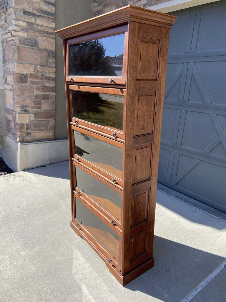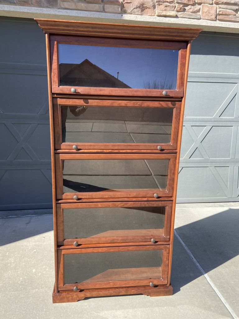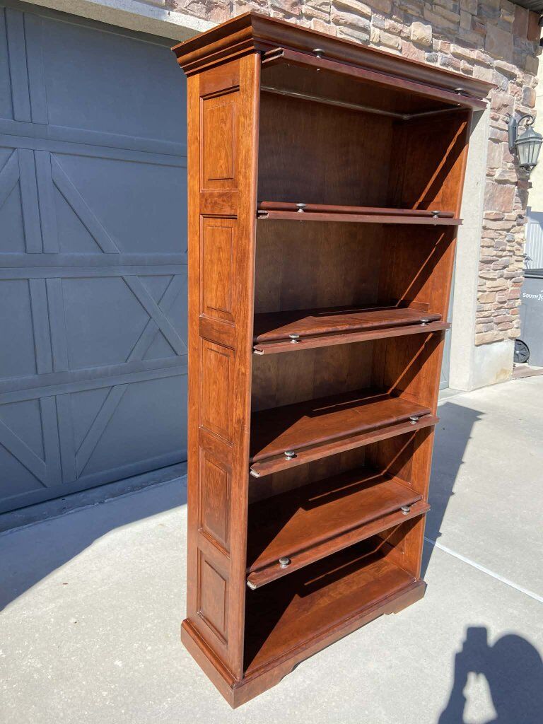 Venmo5 tier barrister bookcase has a warm, rich, reddish-brown finish. Solid wood and paneling. All doors close perfectly. The top door looks off in the photos due to being on a slant while photos were taken. Has some minor imperfections throughout. Please see all photos. Measurements: H74.25" W38" D16" doors open D14.5" doors closed Pick up in South Jordan, Venmo or cash. FREE curbside delivery within 5 miles of South Jordan. Delivery outside of parameters may be available with fee, message to inquire. All sales are final. Thanks for looking, please check out my other listing's. :)