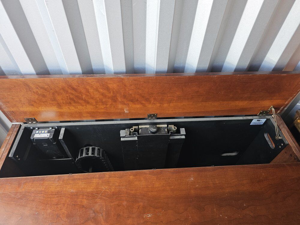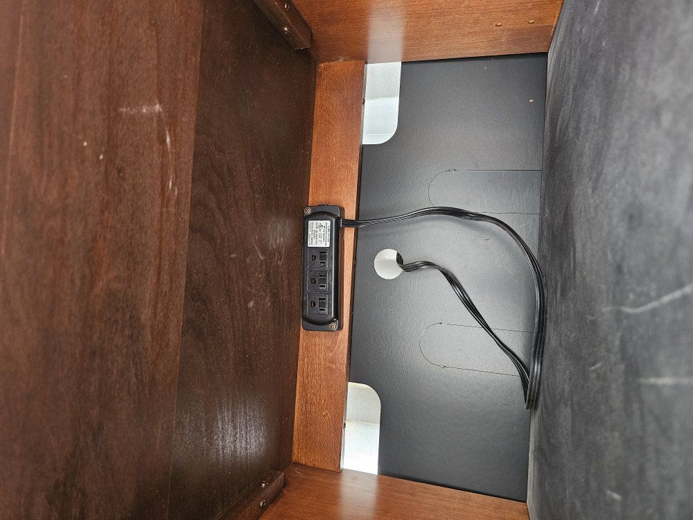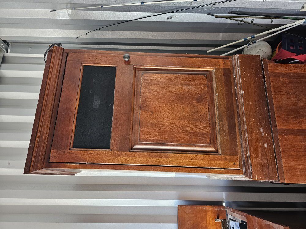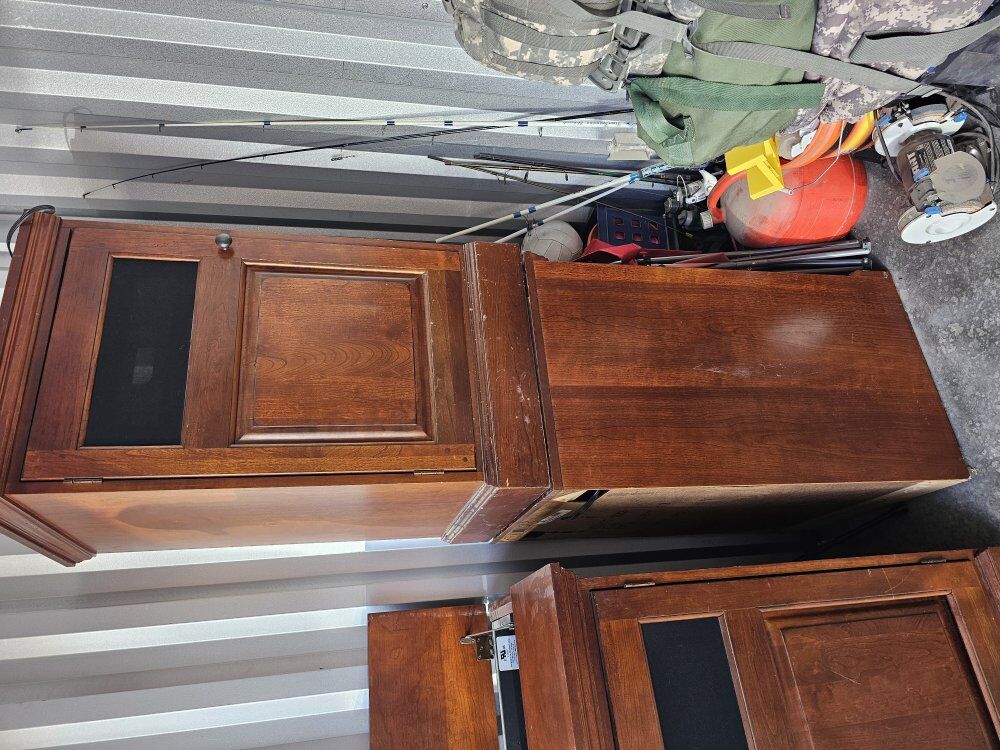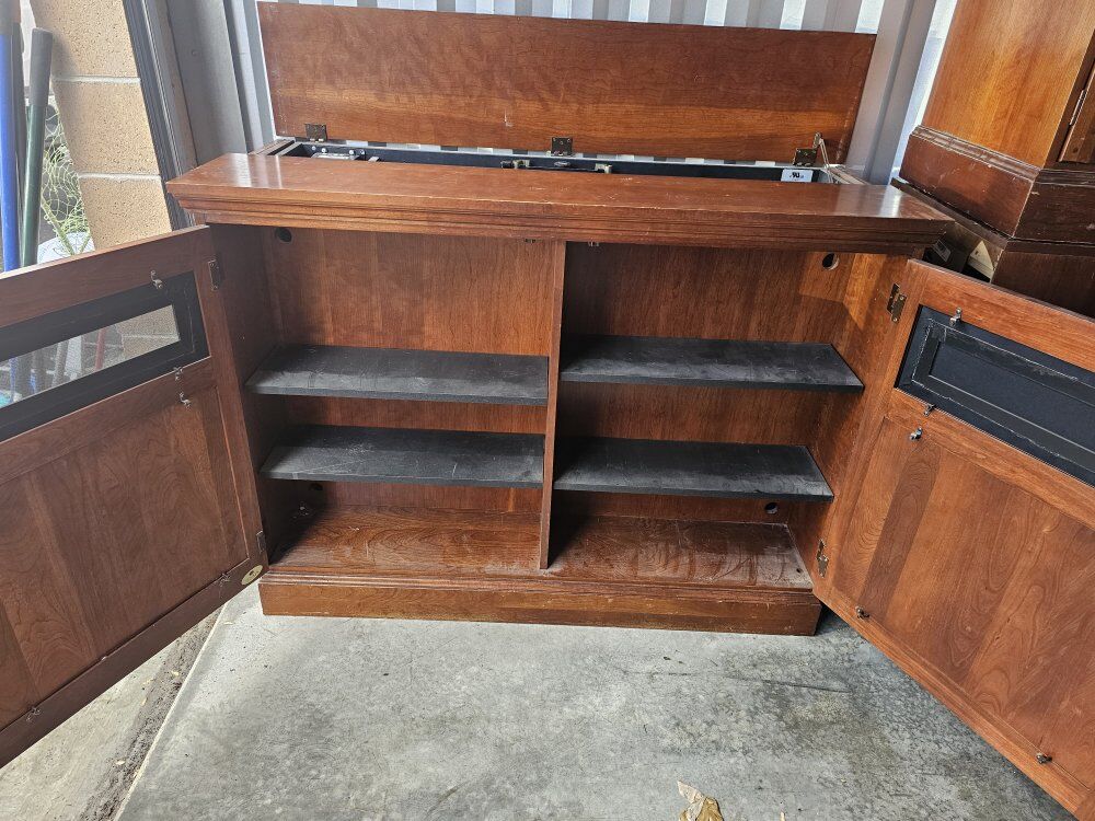 this entertainment center has an electric TV mount that hids the tv in the entertainment center when not in use. fits anything for 55 incches down if you are use the electric hiding system. Fits a 75 inch tv on top if used as a traditional entertainment center. the front ones up and has shelves for storage. the side cabinets have 2 svels and power strip built-in on top shelf. there is some wear and tear but they are still in good condition. this entertainment center is extremely heavy i would recommend getting at leat 2 or 3 people to help you move them. as is