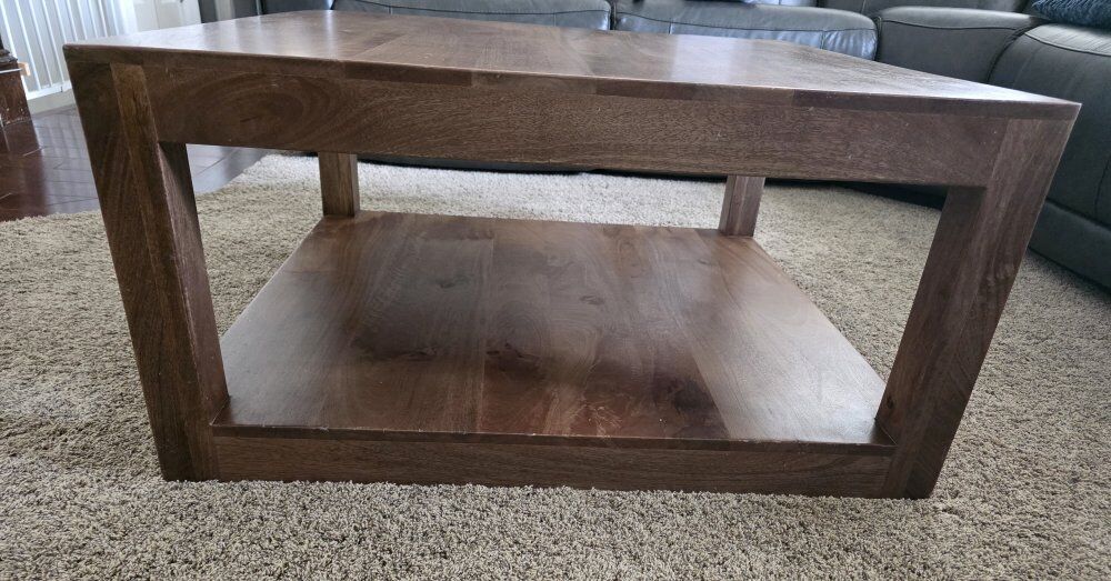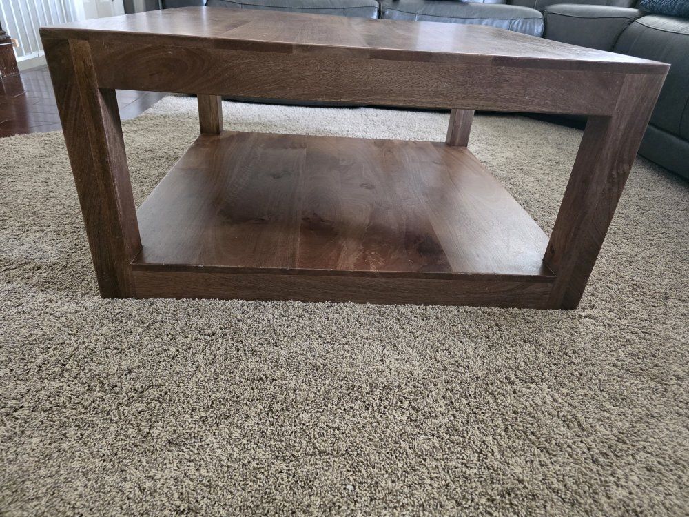 Beautiful solid wood coffee table with rich walnut-toned finish and natural wood grain detail. Sturdy, heavy, and well-built with a spacious lower shelf for storage or décor. Clean lines make it perfect for rustic, farmhouse, or modern spaces. • Solid wood construction • Large lower shelf for storage • Very sturdy and stable • Great condition Dimensions: 36"L x 36"W x 18"H Smoke-free home. Cash or Venmo. Pick up only.
