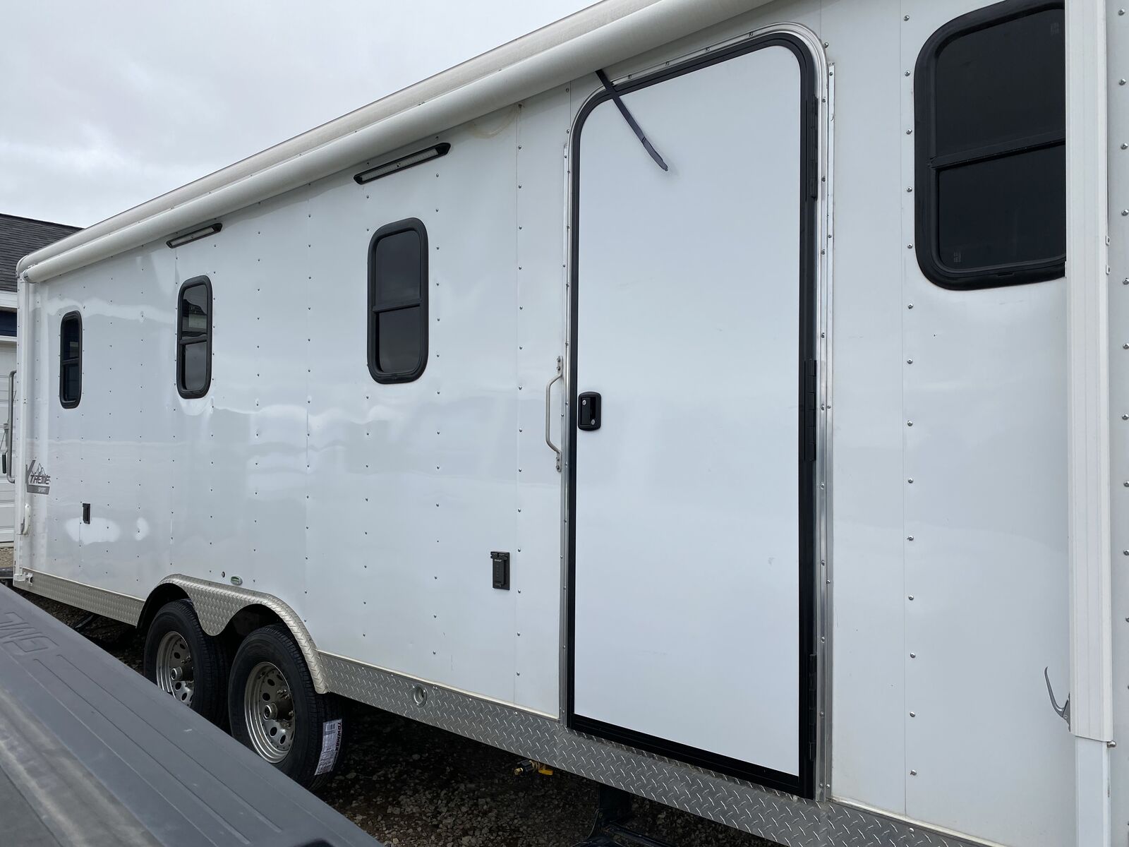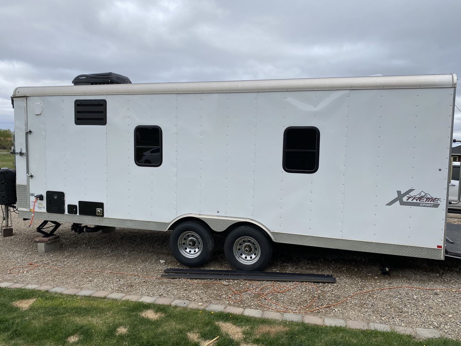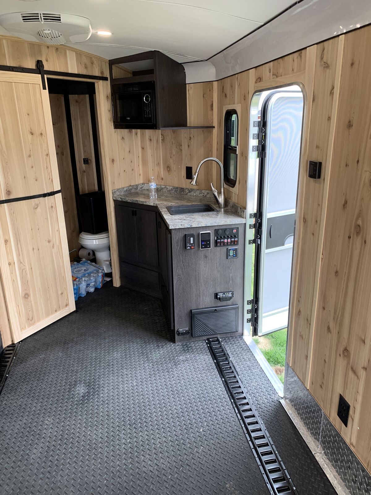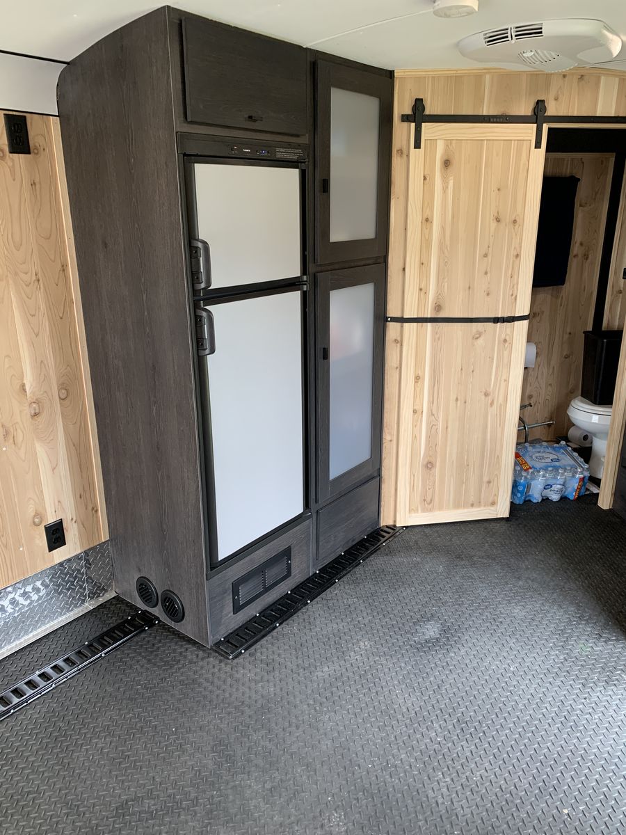 ApplePaySpacious custom enclosed trailer. Has Cedar wood paneling walls and a rubber membrane diamond plate pattern floor. Comes with a kitchen area, sink, microwave, and a 12V fridge. There's a bathroom with a toilet and shower. E-track system on the floor for tying things down. AC and furnace unit keeps it comfy. Windows let in natural light. Solar panel on roof and 3500 watt inverter, 4 deep cell batteries, 2 propane 10 gallon propane tanks. Led lighting, exterior awning, remote connection for grill. Walls and ceiling are spray foam insulation.