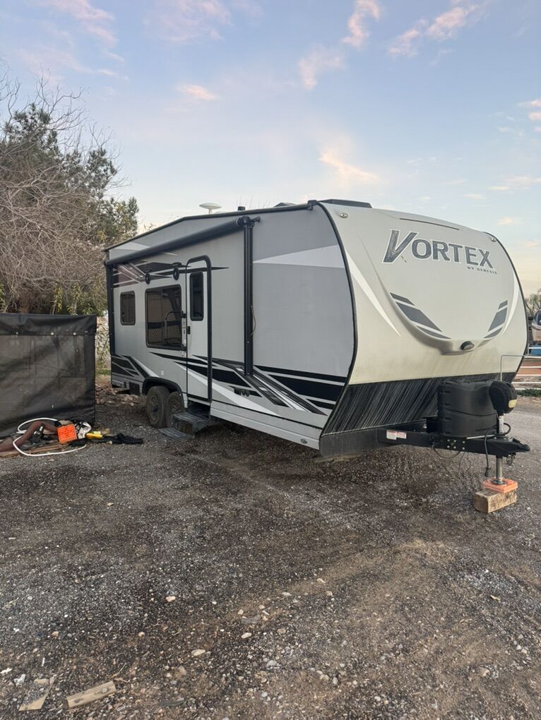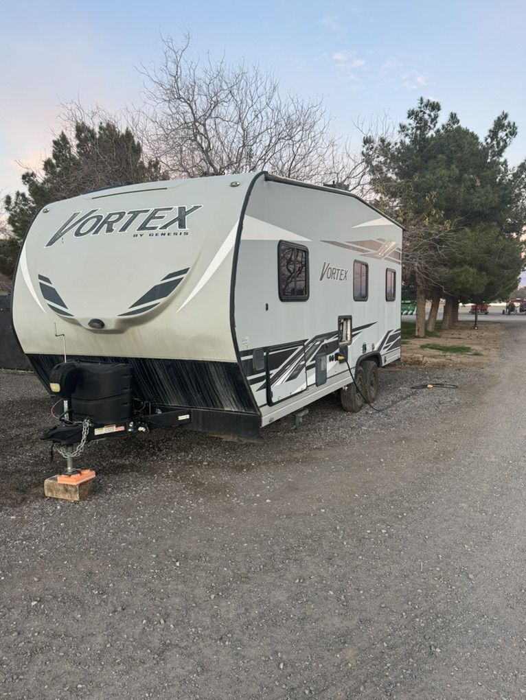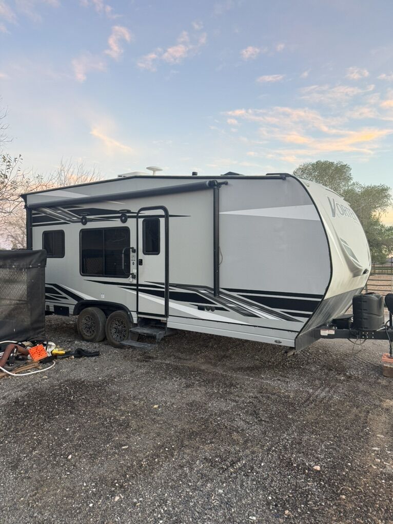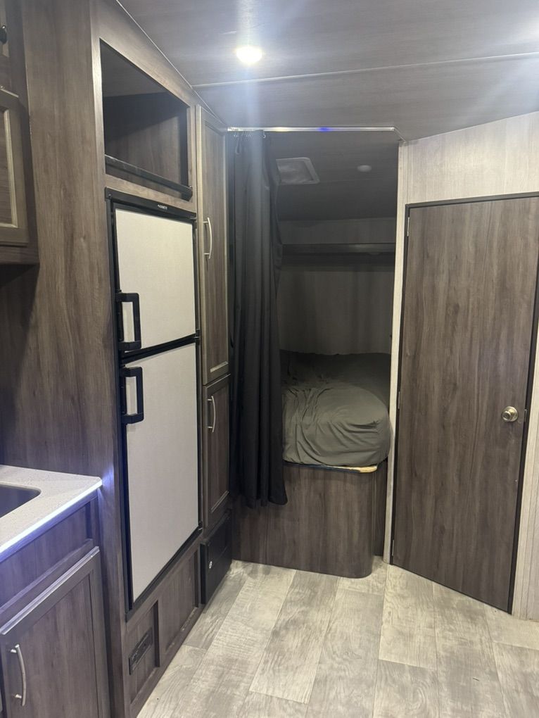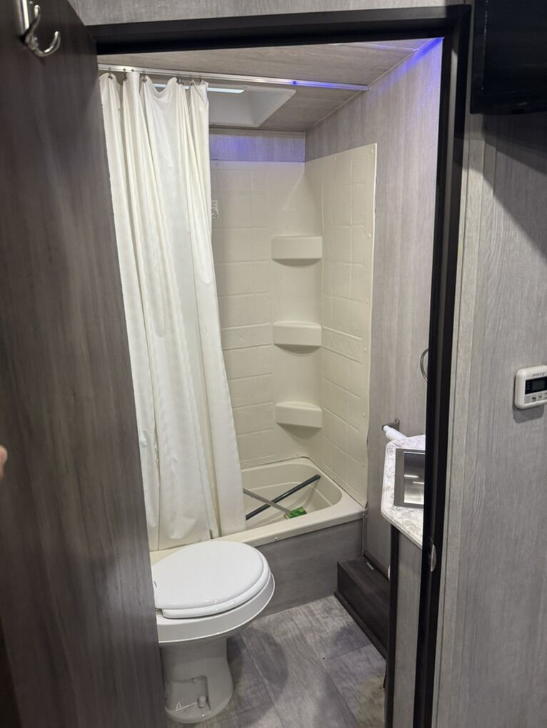 Great trailer! I’m the original owner, bought new in 2021. My family is just out growing it. It fits a 2 seater side by side very well and also fits a 4 seater but it’s a little tight. New toilet just installed. It has a 100 gal fresh water tank. 3 beds. Call or text with questions.