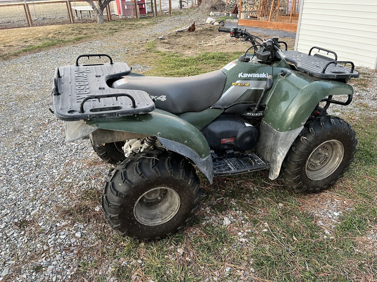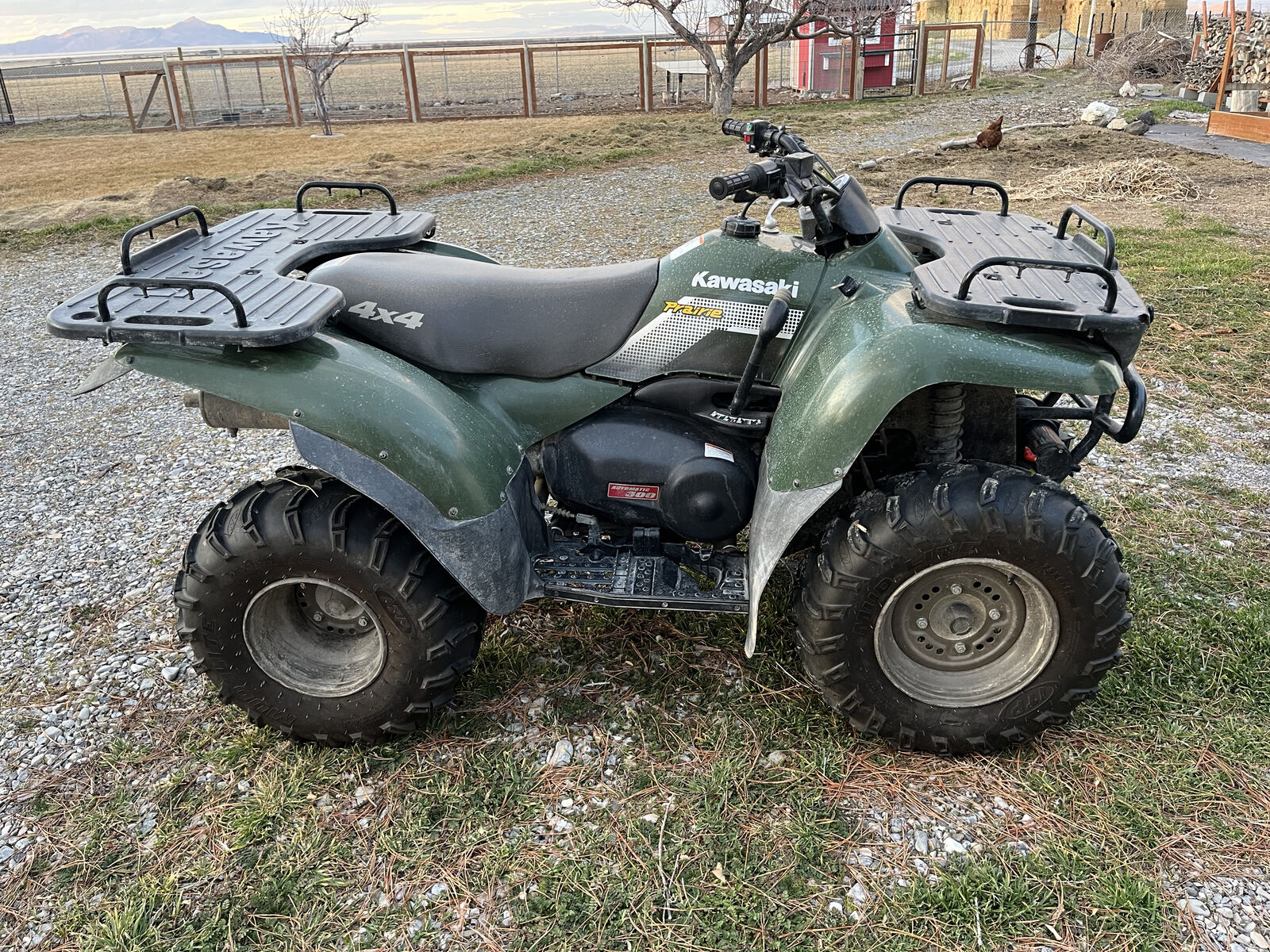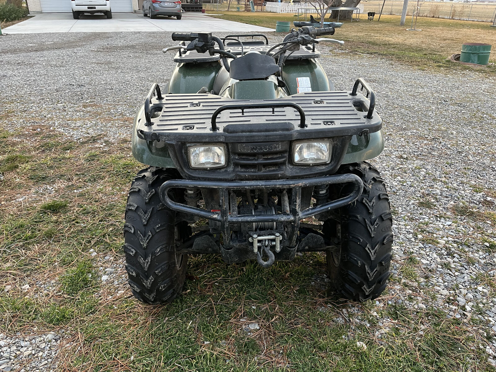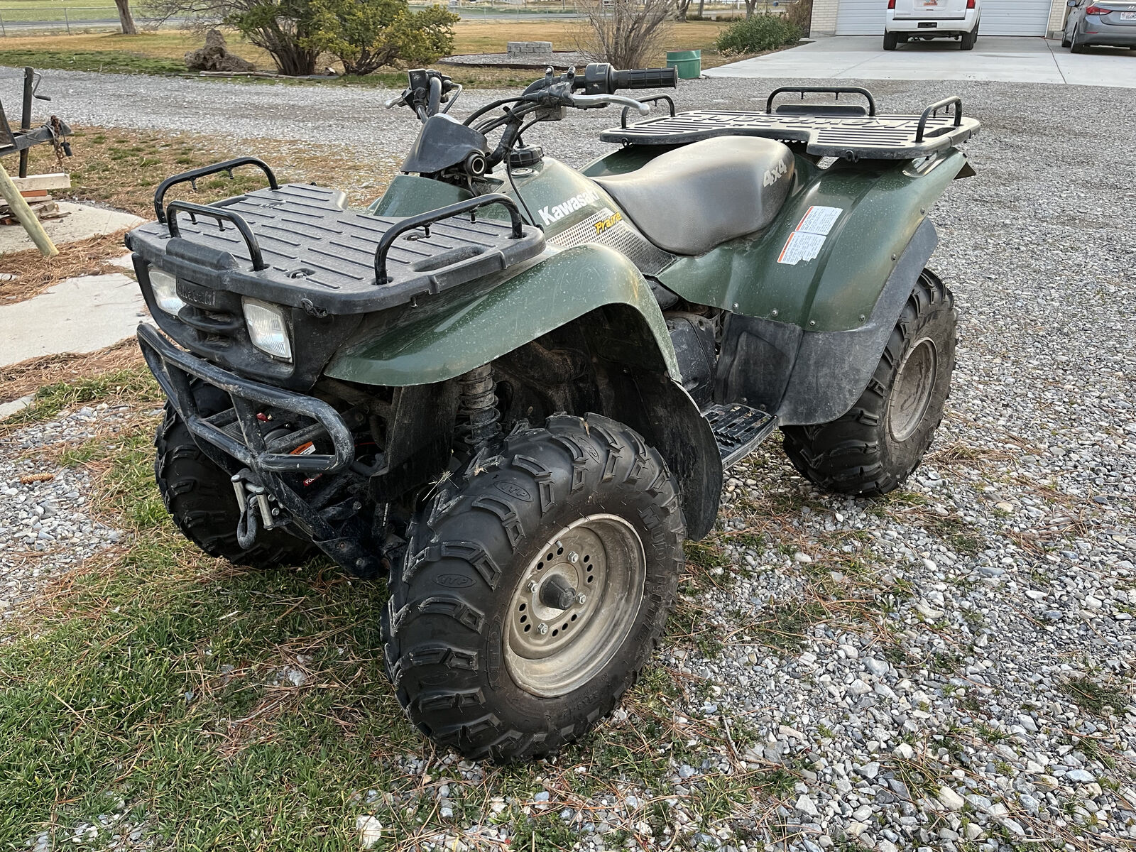 Very clean, well-maintained 2002 Kawasaki 300. Pros: new ITP mud tires, working winch, plow attachment installed, plow included, ramps included. Cons: Struggles with idling and accelerating, just needs a carb clean. Battery is new, but has sat for a over a year and needs to be charged in order to start.