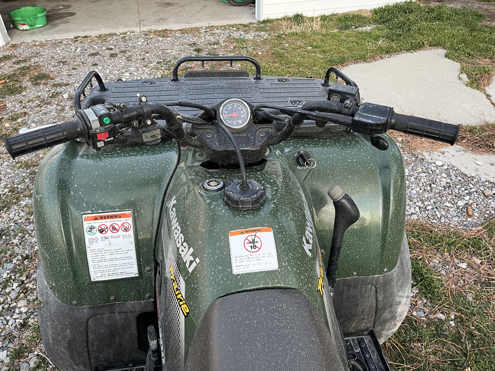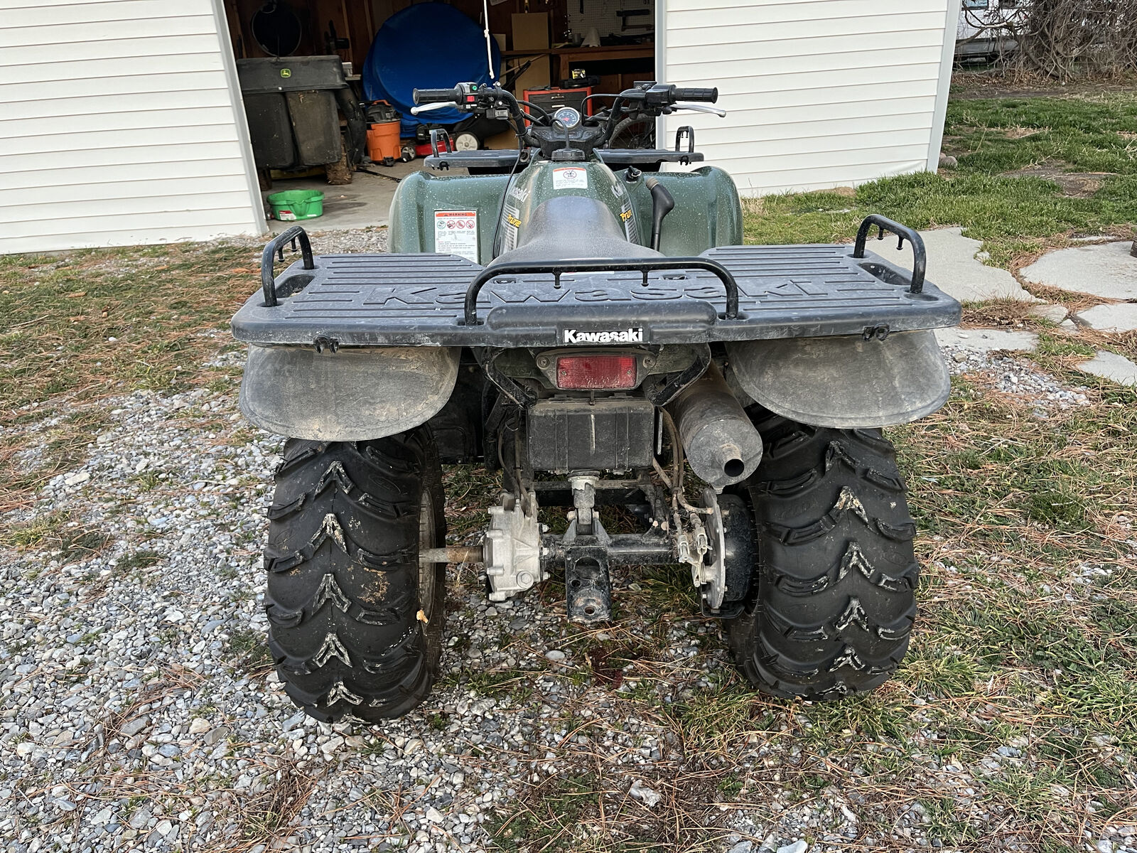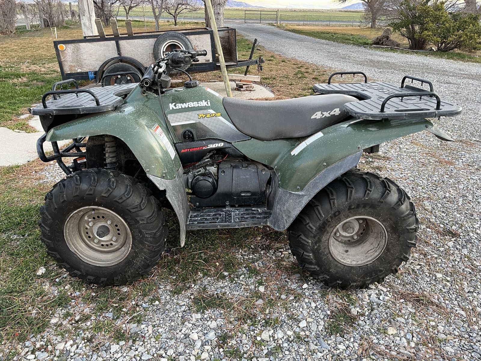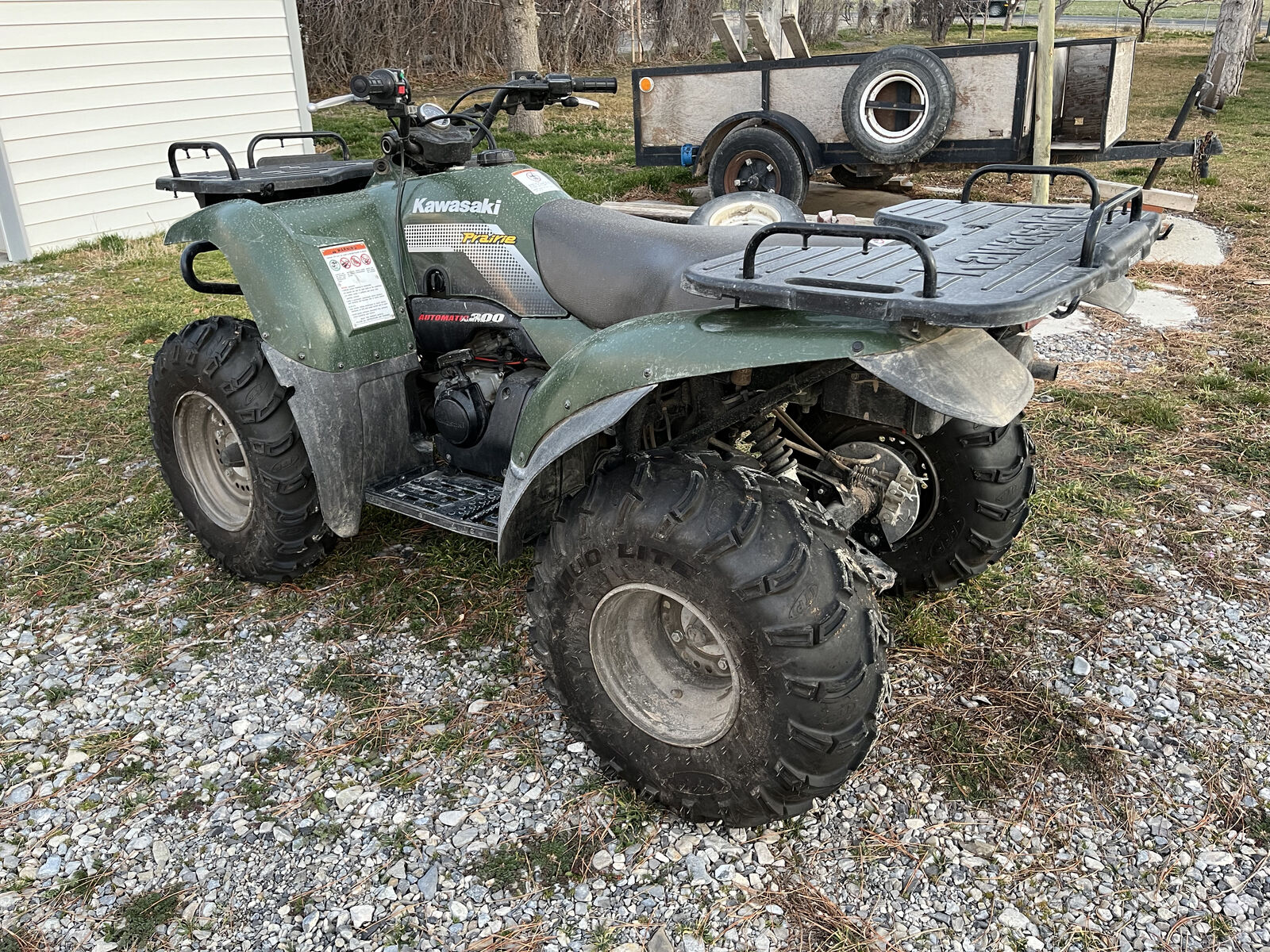Very clean, well-maintained 2002 Kawasaki 300. Pros: new ITP mud tires, working winch, plow attachment installed, plow included, ramps included. Cons: Struggles with idling and accelerating, just needs a carb clean. Battery is new, but has sat for a over a year and needs to be charged in order to start.