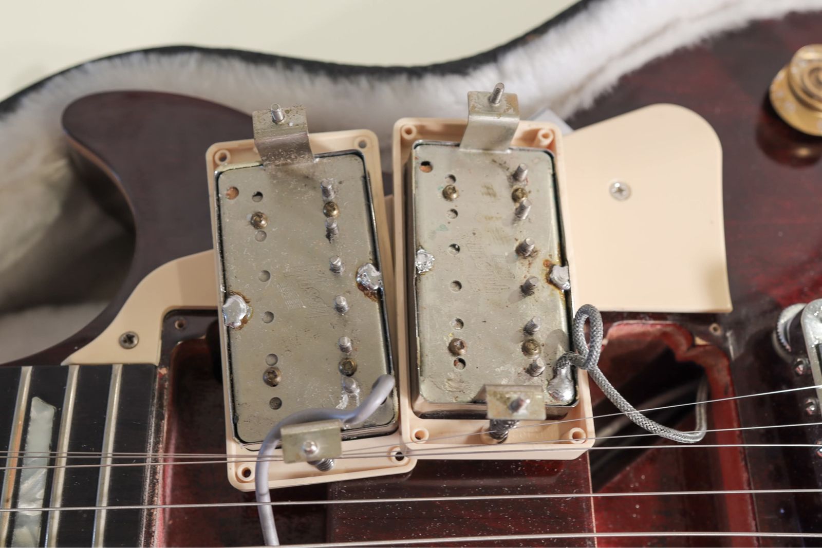 Ebony fingerboard with trapezoid inlays. Mahogany body with maple cap. Gibson Deluxe tuners. Original humbuckers. 9.65 lbs on the scale.