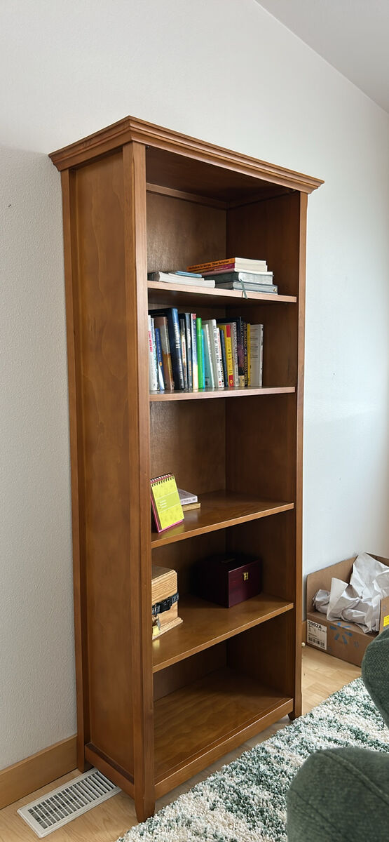 4 of the shelves can be adjusted to your height preference. Basically brand new. Bought April 2025. Smoke free/pet free home. No signs of wear. Have matching end table and TV stand if interested.