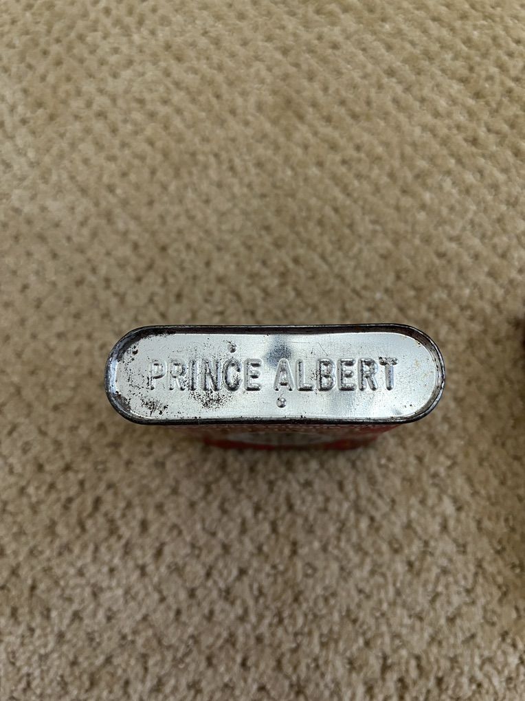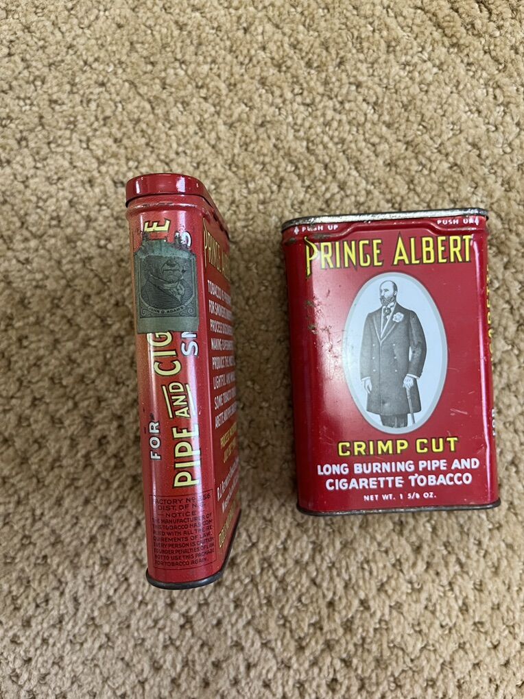 VenmoThese are a pair of antique Prince Albert Vintage Cigarette/Tobbacco Tins. These were manufactured by R.J. Reynolds Tobacco Co., in the United States. These collectible tins feature the classic red color and crimped cut design. The tins originally held tobacco for pipes and cigaretts, and where know for it's long-burning quality. These are the 1 5/8 oz size. They measure 4 1/4 inches tall x 3 inches wide. These are a compact size and have a timeless design. The pair of tins are each a bit different. One has the picture of Prince Albert on both sides. The other has a patented date of July 30th, 1907, wording on the back and the original paper that held the tobacco inside. The tins are a standout pieces for enthusiasts of tobacco tins and vintage advertizing/memorabilla. These are a unique and nostalgic piece of American history. Sold as a set. Price is firm.S
