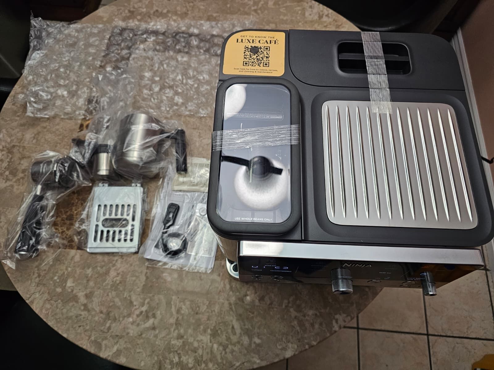 Ninja Luxe Café Premier Series 3-in-1: real espresso, drip coffee, rapid cold brew. Built-in grinder, built-in scale, hands-free frother, assisted tamper. Easy lattes, cappuccinos, iced drinks.