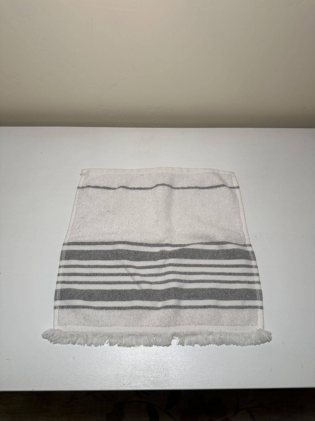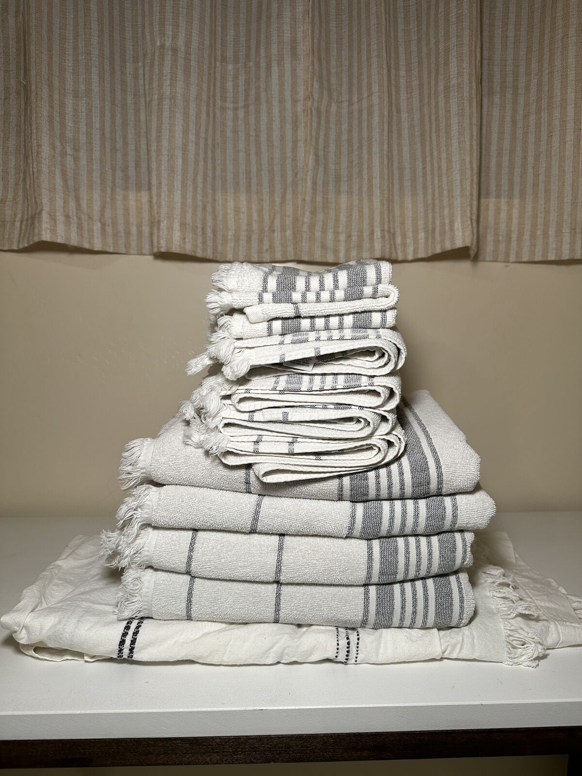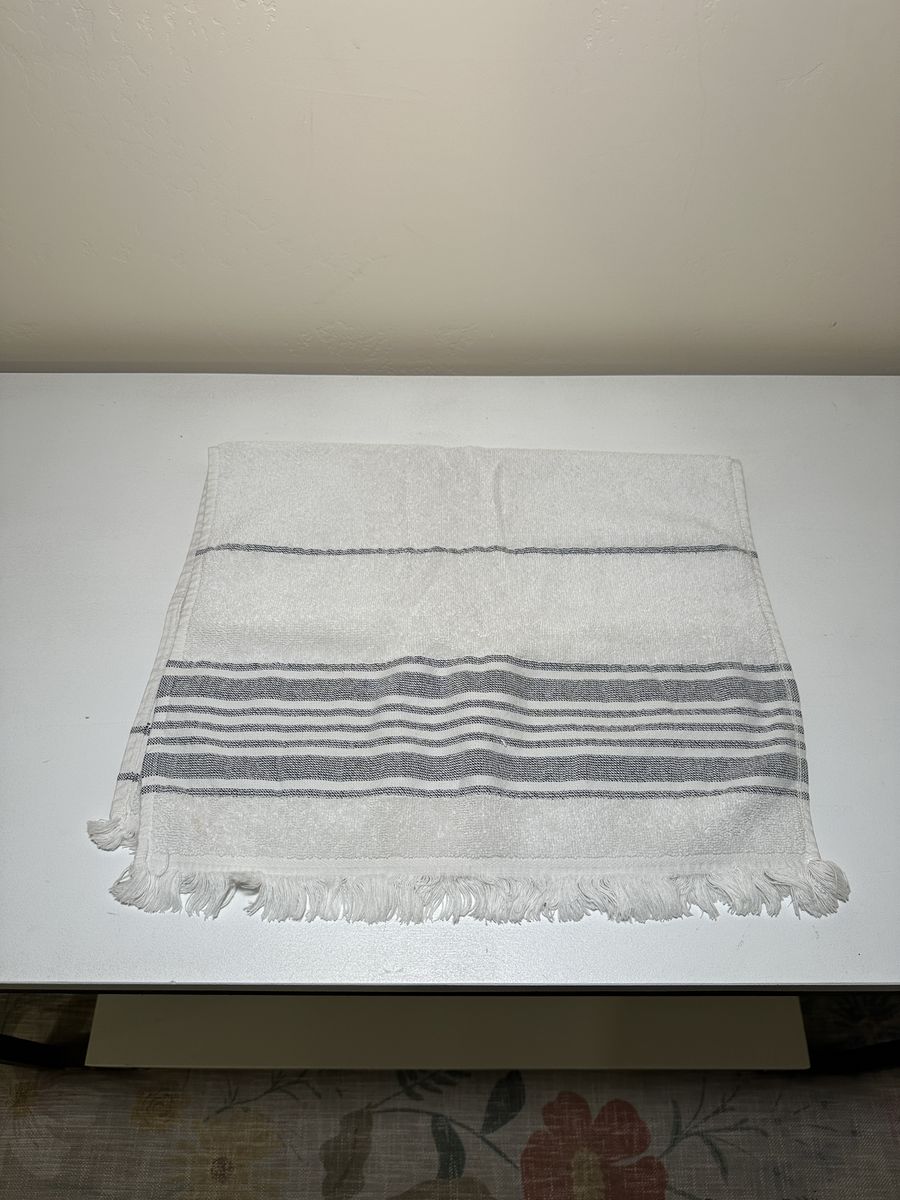 All items are used but clean and in great condition. No stains or damage. The neutral color and classic stripe pattern work with almost any bathroom style — modern, farmhouse, minimalist, etc.